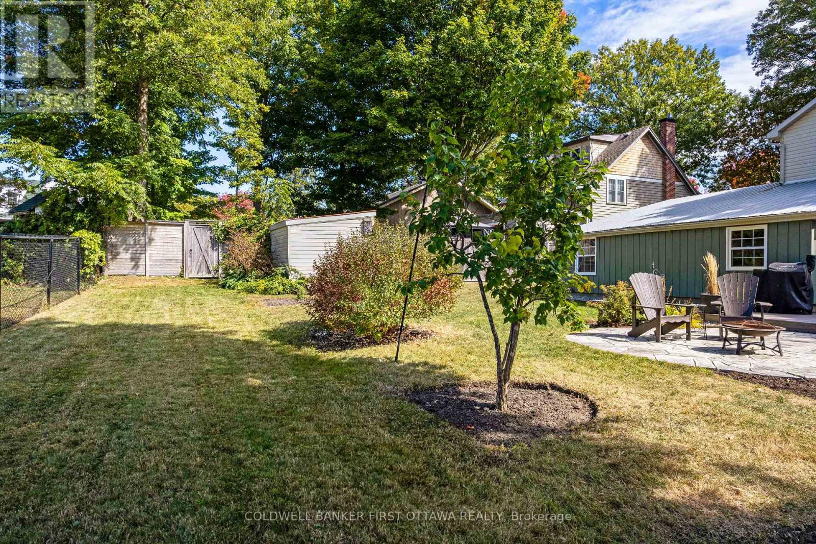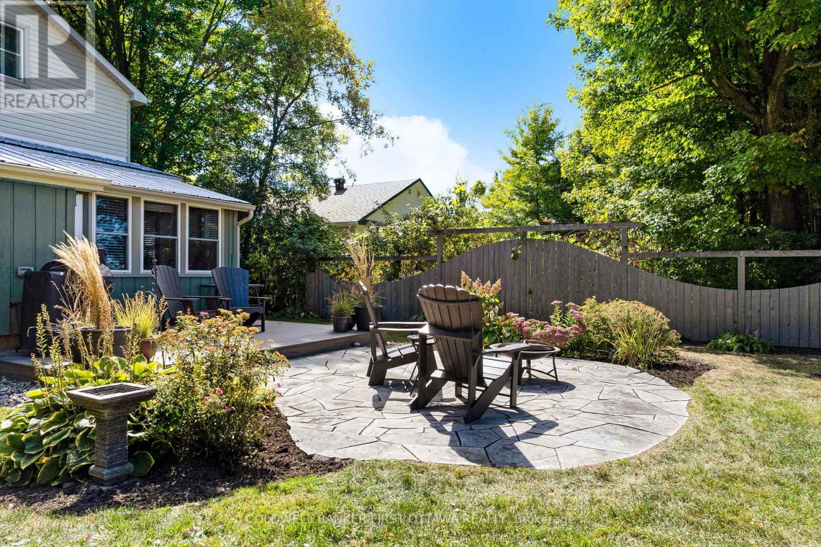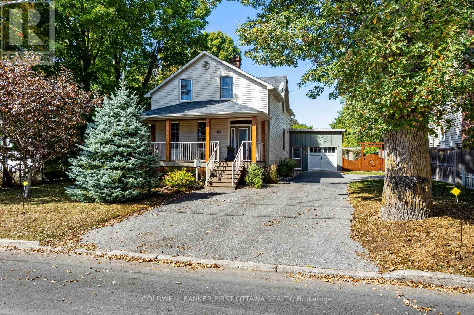 A minute's walk down the street from this home in Perth, is the Tay River. Besides location, the home itself is a happy delight with solid character. From classic veranda to large fenced yard, you have country charm - in town. The big covered veranda has welcoming front door with wide etched glass side panels and transom. Inside, the three bedroom home is all renovated with care and quality. Oak hardwood floors flow thru-out, featuring scratch-resistant finish. Living room coffered ceiling with lovely centre medallion; built-in shelves frame handsome Ledger stone fireplace with efficient gas insert. Dining room also has fireplace, with woodstove insert. Updated with style, the 2023 kitchen offers custom cabinetry, granite countertop with leather finish; textured subway tile backsplash; under counter light; two-door refrigerator & 5-burner stove. Powder room combined with laundry centre with more custom cabinetry. Wonderful three-season sunroom exposed post & beams and wrap-about windows with built-in blinds. Mudroom improves family organization with built-in shelves, and two closets. The staircase is a showpiece of tradition, fine woodworking and decorative accents. Upstairs are three bedrooms, including primary with three closets. The 4-pc bathroom has ceramic plank tile floor, marble vanity, soaker tub/shower and linen closet. Basement is utility area with 6' high ceiling and insulated walls that are drywalled. New plumbing in basement part of the new sewer line to street. Home's numerous upgrades include new 2025 natural gas furnace with humidifier, new 2020 central air conditioner and all new 2017 windows. Attached single garage has inside entry, tongue&groove walls, concrete floor and yard door. The backyard retreat includes composite deck and flagstone patio.Yard all fenced and landscaped with trees & gardens. Beyond the yard is huge green playground that further back, adjoins the public school. You can also walk to all amenities, downtown shops & restaurants. (id:64974)