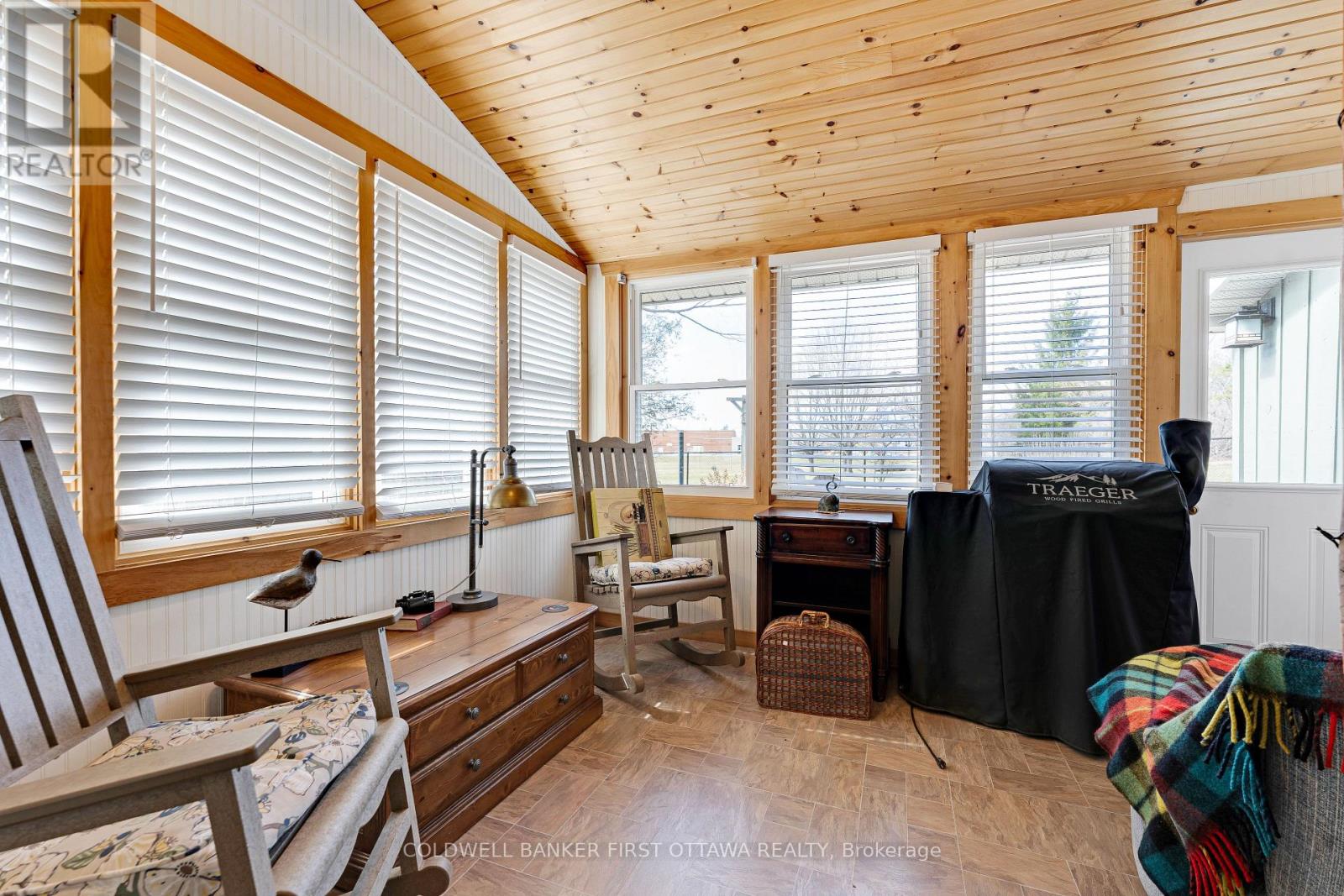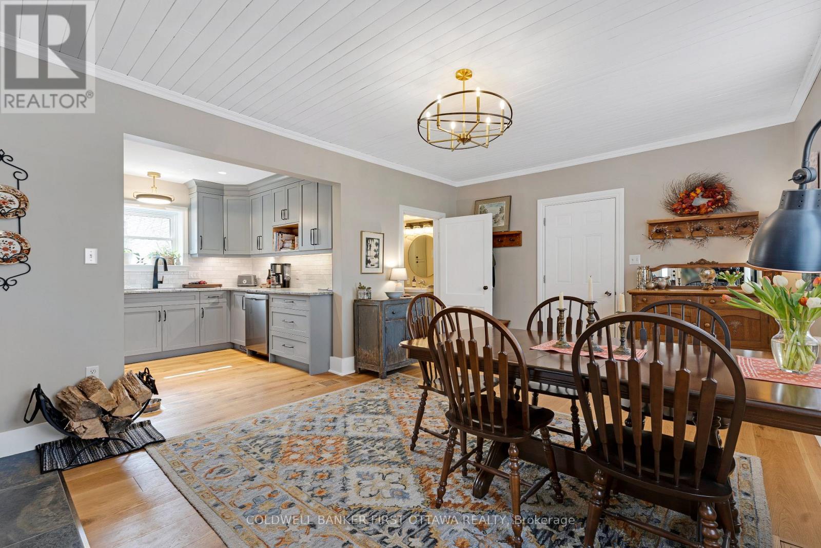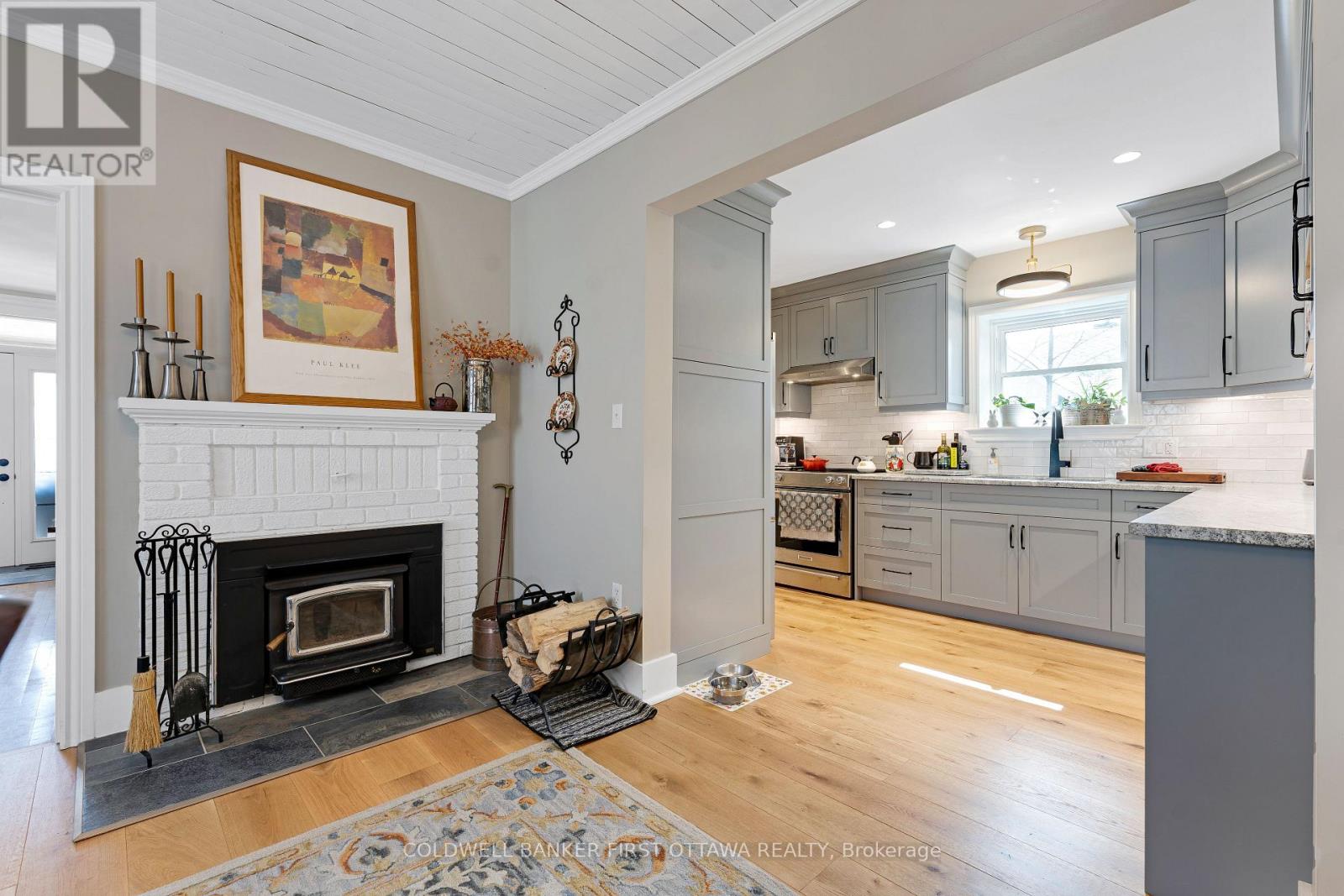 A minute's walk down the street from this home in Perth, is the Tay River. Besides location, the home itself is a happy delight with solid character. From classic veranda to large fenced yard, you have country charm - in town. The big covered veranda has welcoming front door with wide etched glass side panels and transom. Inside, the three bedroom home is all renovated with care and quality. Oak hardwood floors flow thru-out, featuring scratch-resistant finish. Living room coffered ceiling with lovely centre medallion; built-in shelves frame handsome Ledger stone fireplace with efficient gas insert. Dining room also has fireplace, with woodstove insert. Updated with style, the 2023 kitchen offers custom cabinetry, granite countertop with leather finish; textured subway tile backsplash; under counter light; two-door refrigerator & 5-burner stove. Powder room combined with laundry centre with more custom cabinetry. Wonderful three-season sunroom exposed post & beams and wrap-about windows with built-in blinds. Mudroom improves family organization with built-in shelves, and two closets. The staircase is a showpiece of tradition, fine woodworking and decorative accents. Upstairs are three bedrooms, including primary with three closets. The 4-pc bathroom has ceramic plank tile floor, marble vanity, soaker tub/shower and linen closet. Basement is utility area with 6' high ceiling and insulated walls that are drywalled. New plumbing in basement part of the new sewer line to street. Home's numerous upgrades include new 2025 natural gas furnace with humidifier, new 2020 central air conditioner and all new 2017 windows. Attached single garage has inside entry, tongue&groove walls, concrete floor and yard door. The backyard retreat includes composite deck and flagstone patio.Yard all fenced and landscaped with trees & gardens. Beyond the yard is huge green playground that further back, adjoins the public school. You can also walk to all amenities, downtown shops & restaurants. (id:64974)