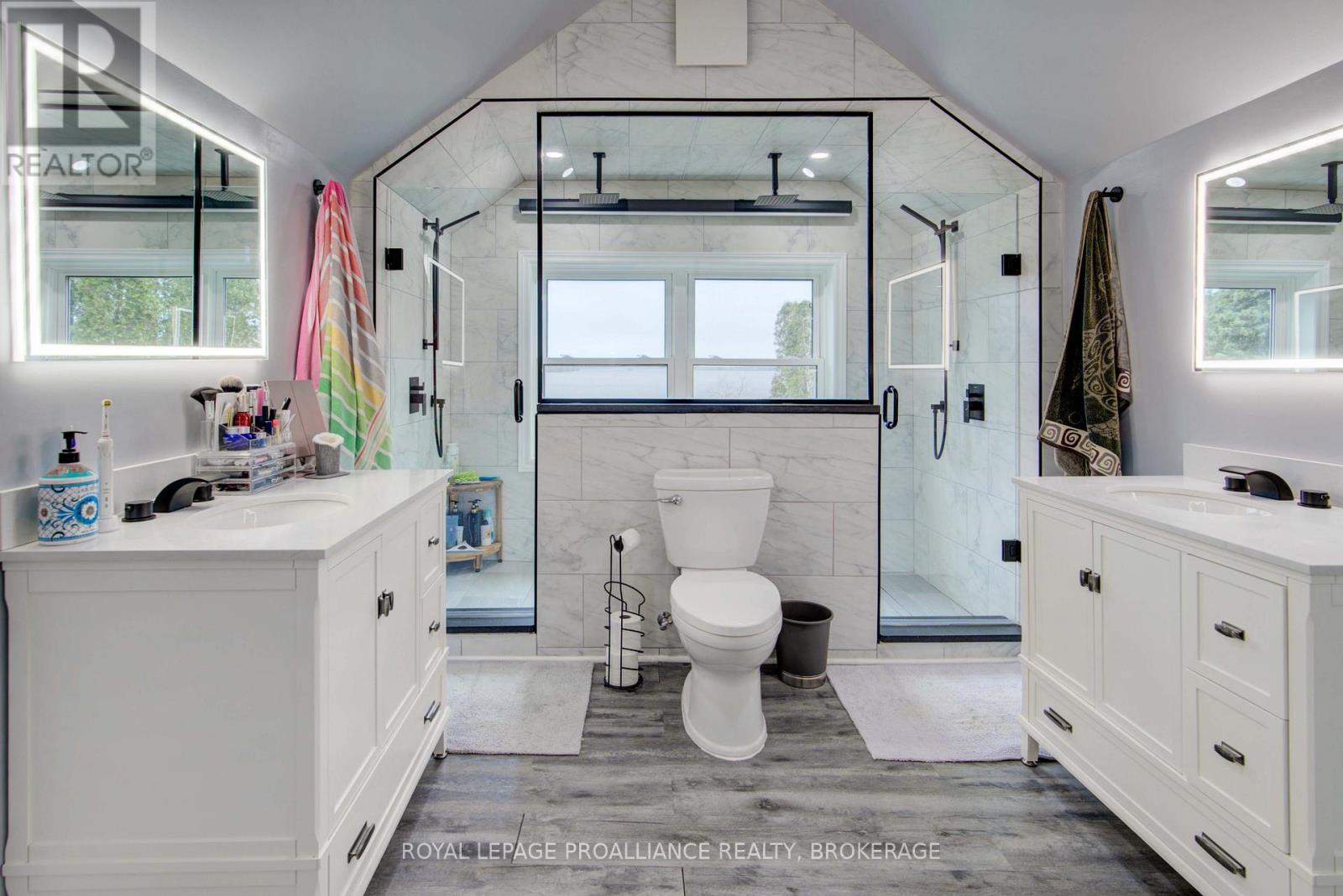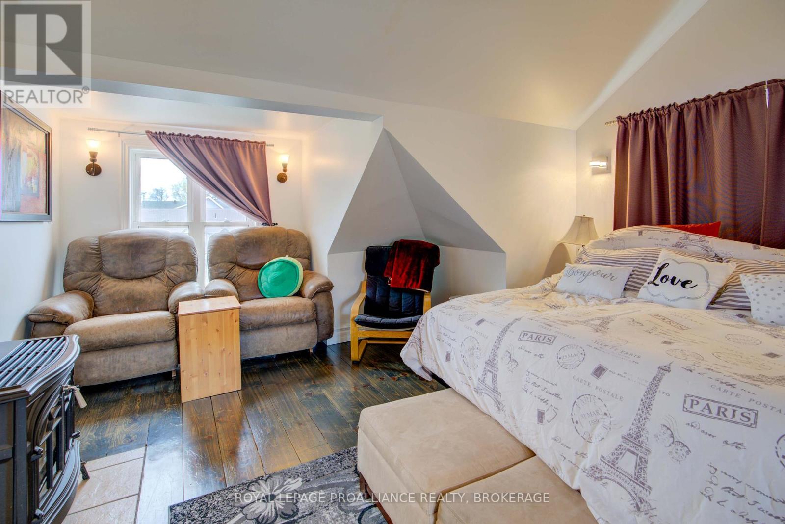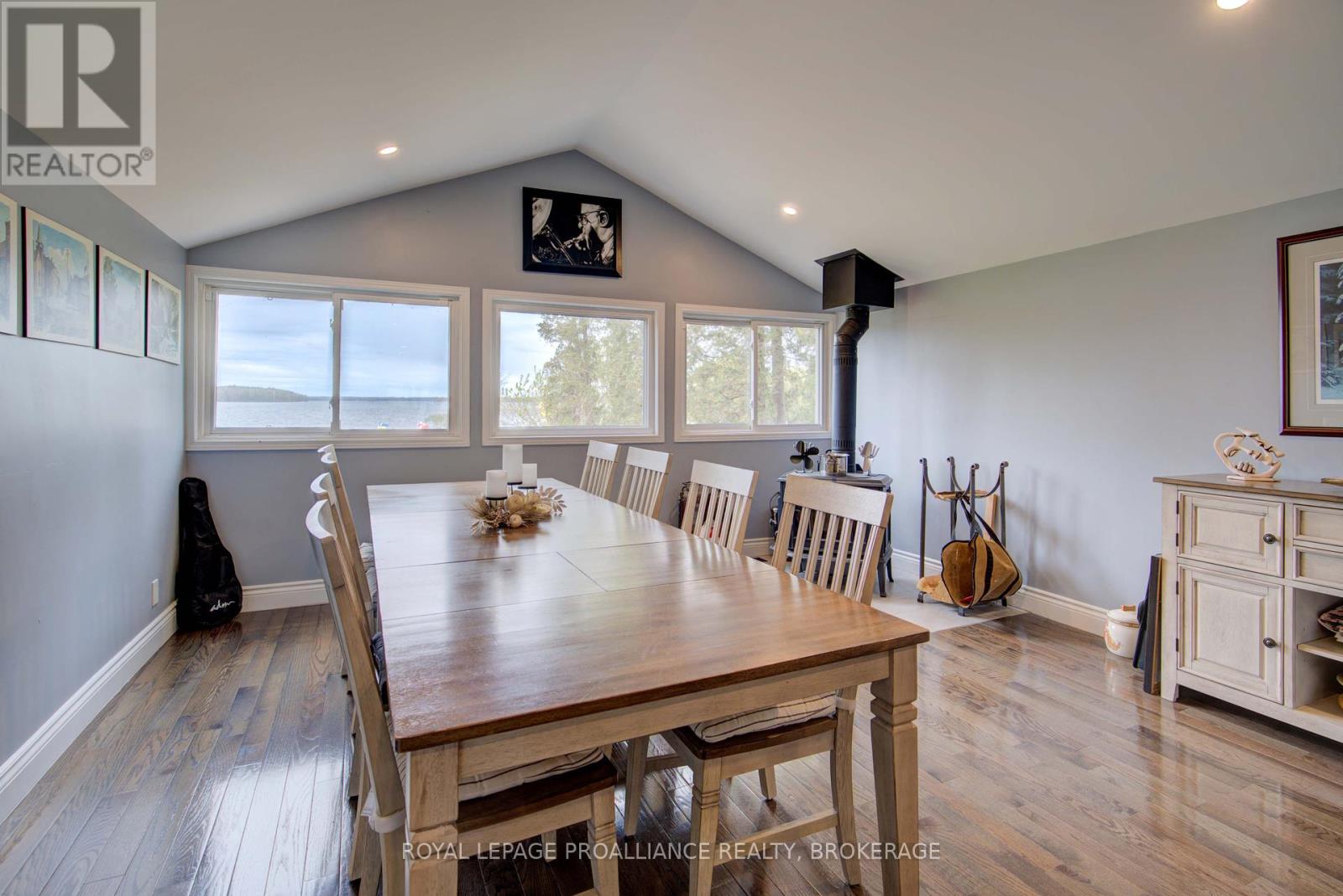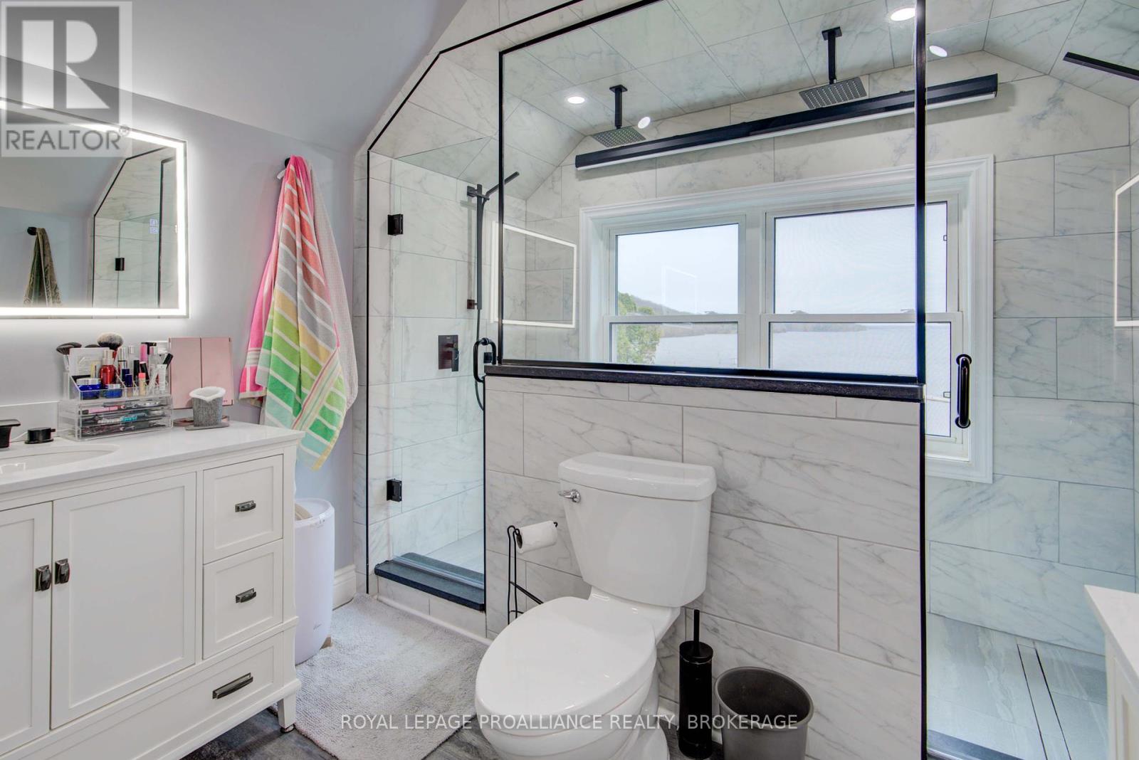 Beautiful home sitting on the western shore of Upper Rideau Lake! This 3+ story home is bright & modern throughout & has been totally renovated over the past 2 years. At the front of the home is a breakfast nook with built-in storage benches & located right next to the gourmet kitchen. This kitchen boasts a 48" Forno gas stove, a 9' island with dishwasher, microwave & wine fridge. The opposite side of the kitchen has a large coffee bar, plenty of storage cabinets & quartz countertops. There is a hidden pantry cleverly located behind a shelving unit that pulls out when access is needed. There is a large living room, a 2pc bathroom, laundry area & a dining room with a wood stove & views over the backyard. Upstairs on the next level is a girls dream bedroom that has an attached 3pc bathroom. Down the hall there is a 4pc bathroom, an additional bedroom & an office with a sitting room that overlooks the lake. This space could be utilized as a bedroom as well. There is access to the main floor from this area via the back stairs. Heading up to the 3rd level you will find yourself in a spacious bedroom suite with a custom built 5pc ensuite bath. This modern and bright bathroom offers a large custom shower built for two that has stunning views over the lake & Foley Mountain. From this 3rd floor bedroom there is a set of pull-down stairs that can be lowered down to allow access to the turret on the upper most level. This turret has a daybed in place and offers a 360-degree panoramic view of the lake, mountain and the village of Westport. There is a full basement for storage & utilities & an attached garage that is currently being used as living space. The backyard is fenced with gates for easy access & safety by the water and is nicely landscaped with a stone patio with a propane stone fireplace, a playground area, hot tub, gazebo by the water, large dock plus a storage shed. This property is a rare gem found in a waterfront town! (id:64974)