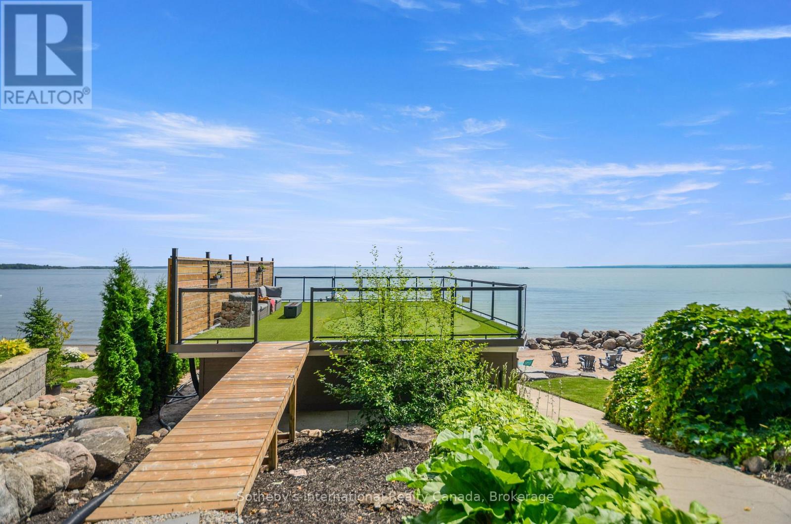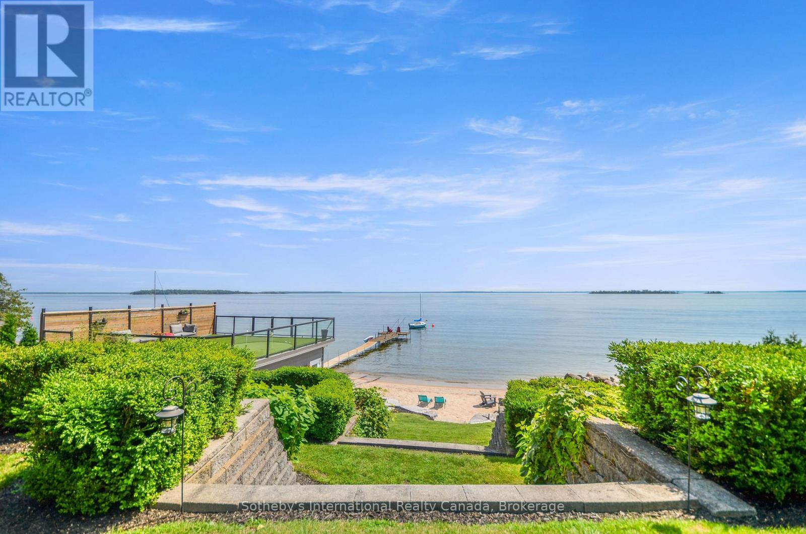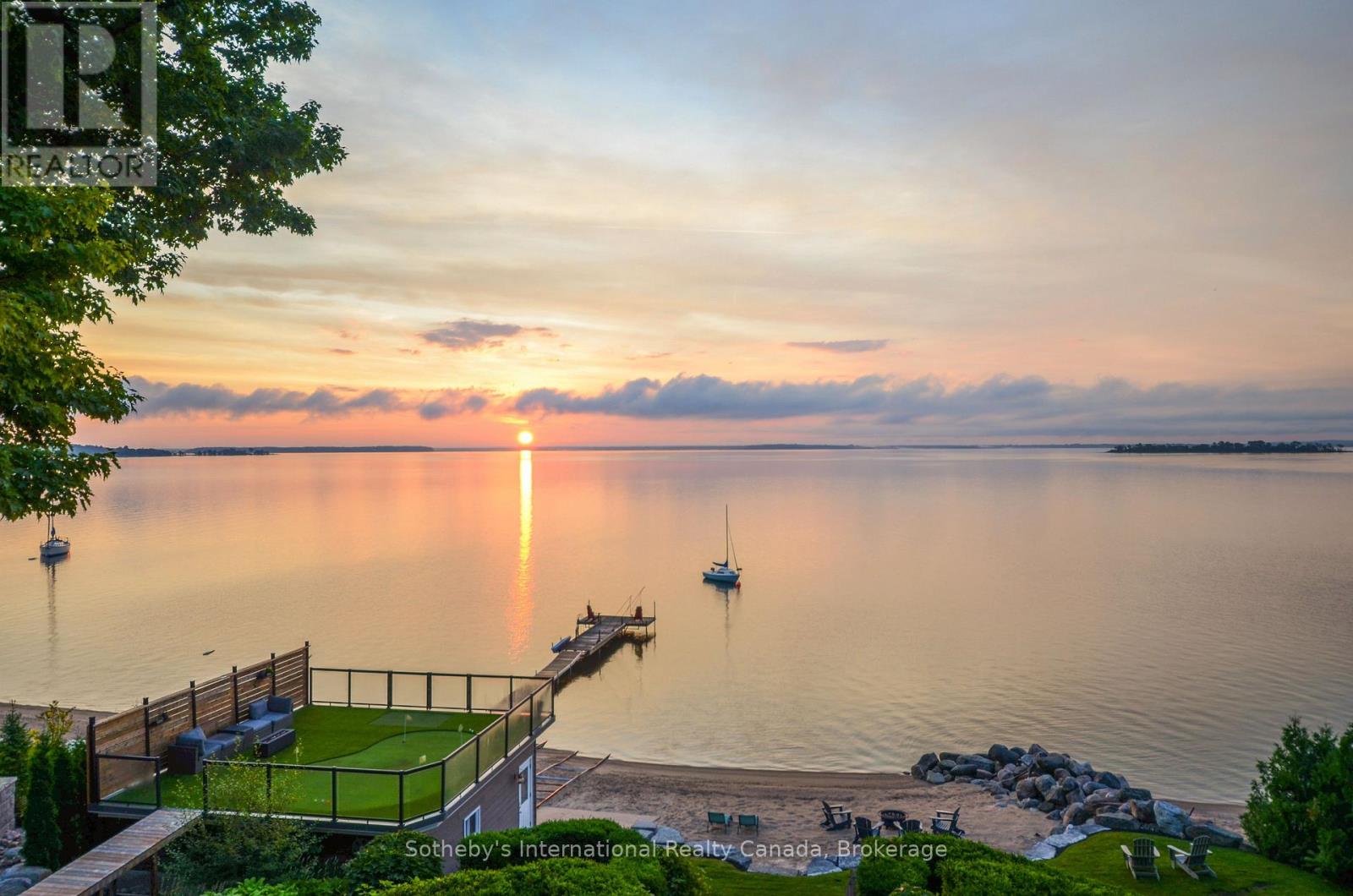 Perched majestically on Midland Point, this magnificent 4-bedroom, 5.5-bathroom estate commands 99 feet of pristine private Georgian Bay shoreline, offering an unparalleled canvas of panoramic water views and inspiring sunrises. Spanning 4,841 sq ft, this impeccably updated residence embodies sophisticated waterfront living. A culinary masterpiece awaits in the gourmet kitchen, featuring professional-grade appliances and a sprawling island, all designed to maximize the breathtaking bay vistas. Convenience meets luxury with a main floor primary suite and dedicated laundry. The expansive main deck is an entertainer's paradise, boasting an outdoor kitchen, a unique retractable garage door, and crystal-clear Invisirail for unobstructed views. The lower walk-out level transforms into a world of leisure, complete with a dedicated billiards room, an impressive office/library, a family room warmed by a fireplace, a private fitness area, and an exquisite wine cellar. Step directly from here into a covered three-season sanctuary, featuring a crackling wood fireplace and a bubbling hot tub. Enhancing this exceptional property are a contemporary 600+ sq ft street-front office with a 4-piece bath, ideal for remote work or a home business, and a charming 1-bedroom, 2-bathroom guest house, offering a cozy retreat with its own wood-burning fireplace. The waterfront truly defines this property, with a natural sandy beach, a welcoming fire pit, and a double dry boathouse equipped with a rail system for two vessels and a private dock. Above the boathouse, a private putting green offers a unique opportunity to refine your short game while soaking in the stellar views of the private beach and Midland Bay. As you arrive, meticulously manicured perennial gardens unfold, creating a serene, park-like drive that leads to the heart of this extraordinary home. (id:64974)