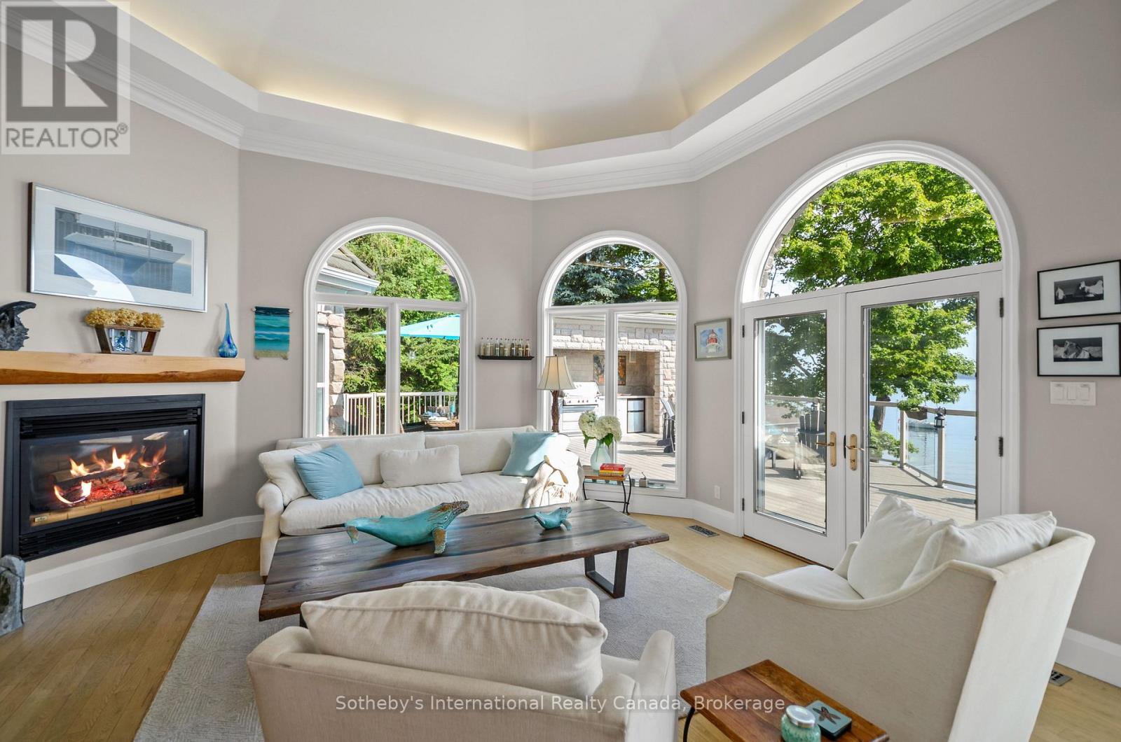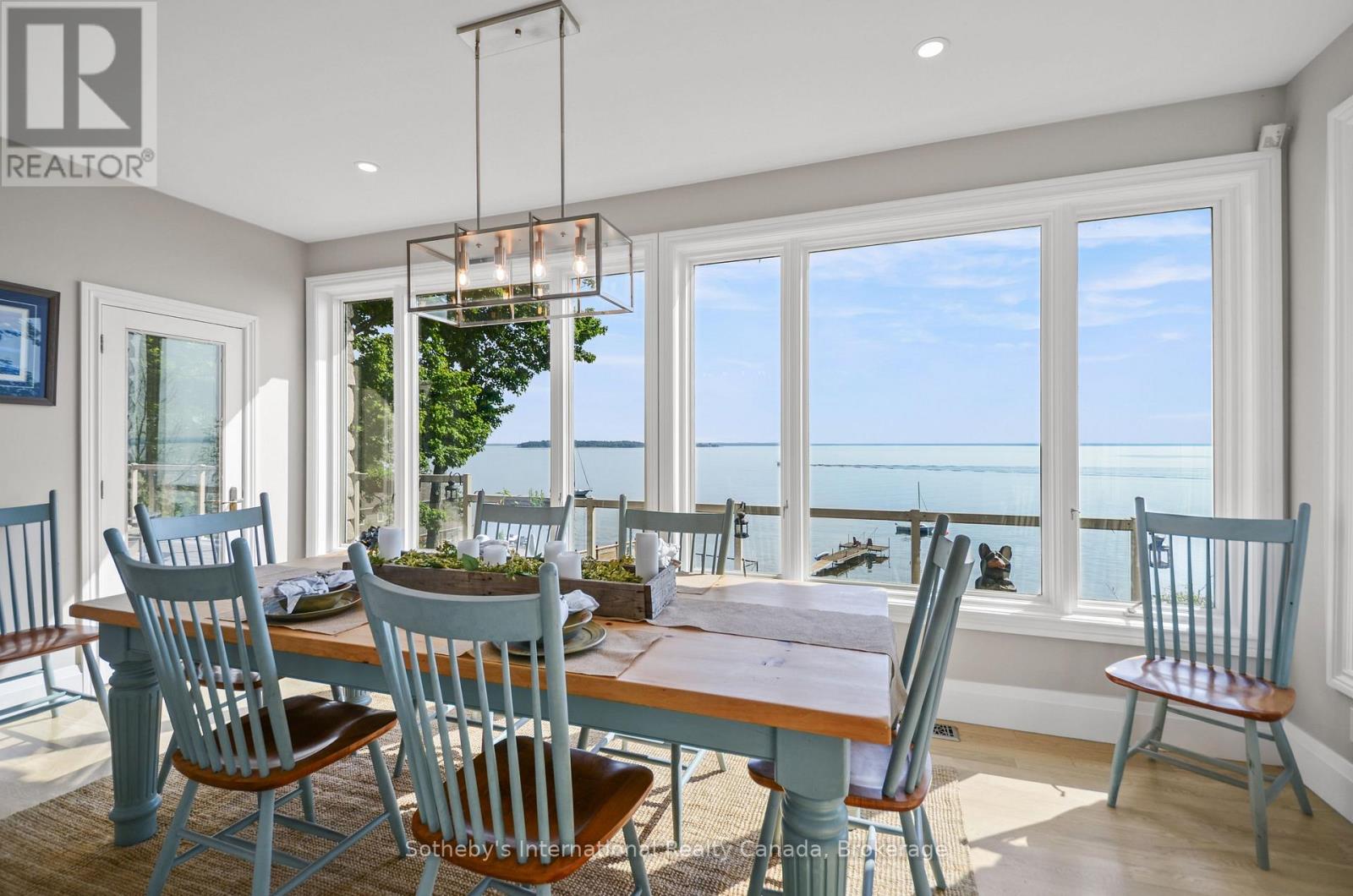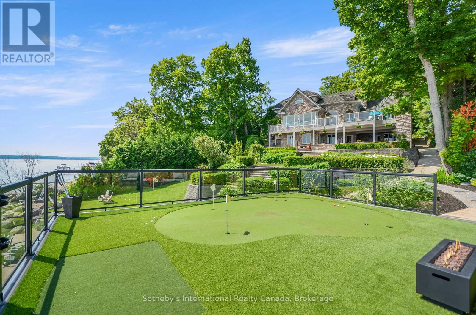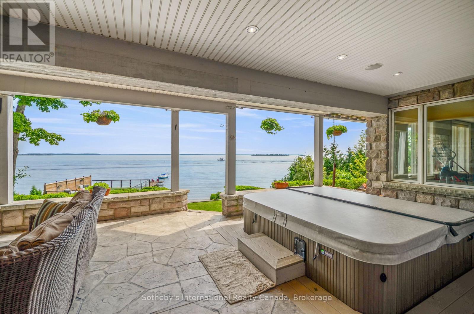 Perched majestically on Midland Point, this magnificent 4-bedroom, 5.5-bathroom estate commands 99 feet of pristine private Georgian Bay shoreline, offering an unparalleled canvas of panoramic water views and inspiring sunrises. Spanning 4,841 sq ft, this impeccably updated residence embodies sophisticated waterfront living. A culinary masterpiece awaits in the gourmet kitchen, featuring professional-grade appliances and a sprawling island, all designed to maximize the breathtaking bay vistas. Convenience meets luxury with a main floor primary suite and dedicated laundry. The expansive main deck is an entertainer's paradise, boasting an outdoor kitchen, a unique retractable garage door, and crystal-clear Invisirail for unobstructed views. The lower walk-out level transforms into a world of leisure, complete with a dedicated billiards room, an impressive office/library, a family room warmed by a fireplace, a private fitness area, and an exquisite wine cellar. Step directly from here into a covered three-season sanctuary, featuring a crackling wood fireplace and a bubbling hot tub. Enhancing this exceptional property are a contemporary 600+ sq ft street-front office with a 4-piece bath, ideal for remote work or a home business, and a charming 1-bedroom, 2-bathroom guest house, offering a cozy retreat with its own wood-burning fireplace. The waterfront truly defines this property, with a natural sandy beach, a welcoming fire pit, and a double dry boathouse equipped with a rail system for two vessels and a private dock. Above the boathouse, a private putting green offers a unique opportunity to refine your short game while soaking in the stellar views of the private beach and Midland Bay. As you arrive, meticulously manicured perennial gardens unfold, creating a serene, park-like drive that leads to the heart of this extraordinary home. (id:64974)