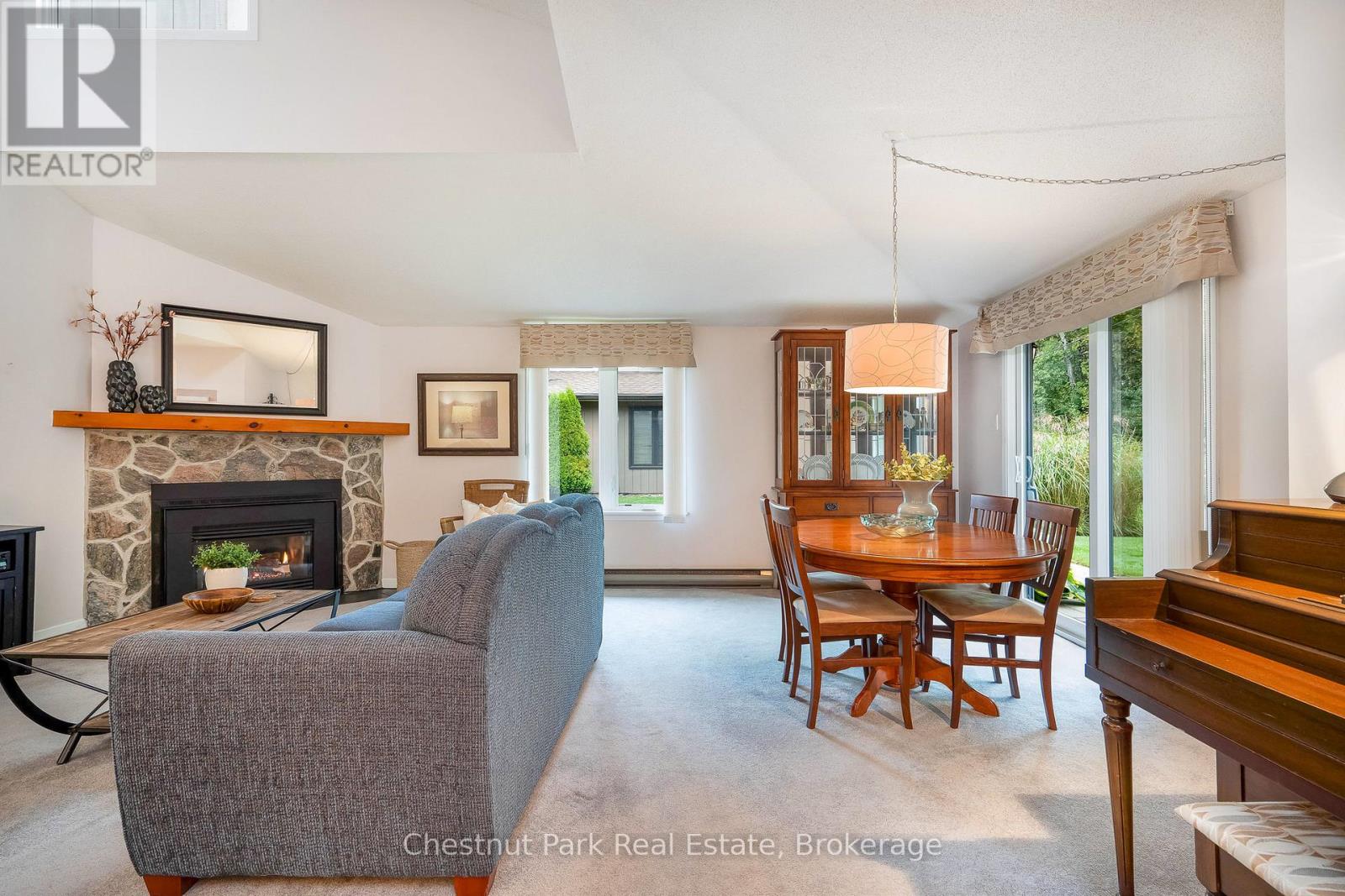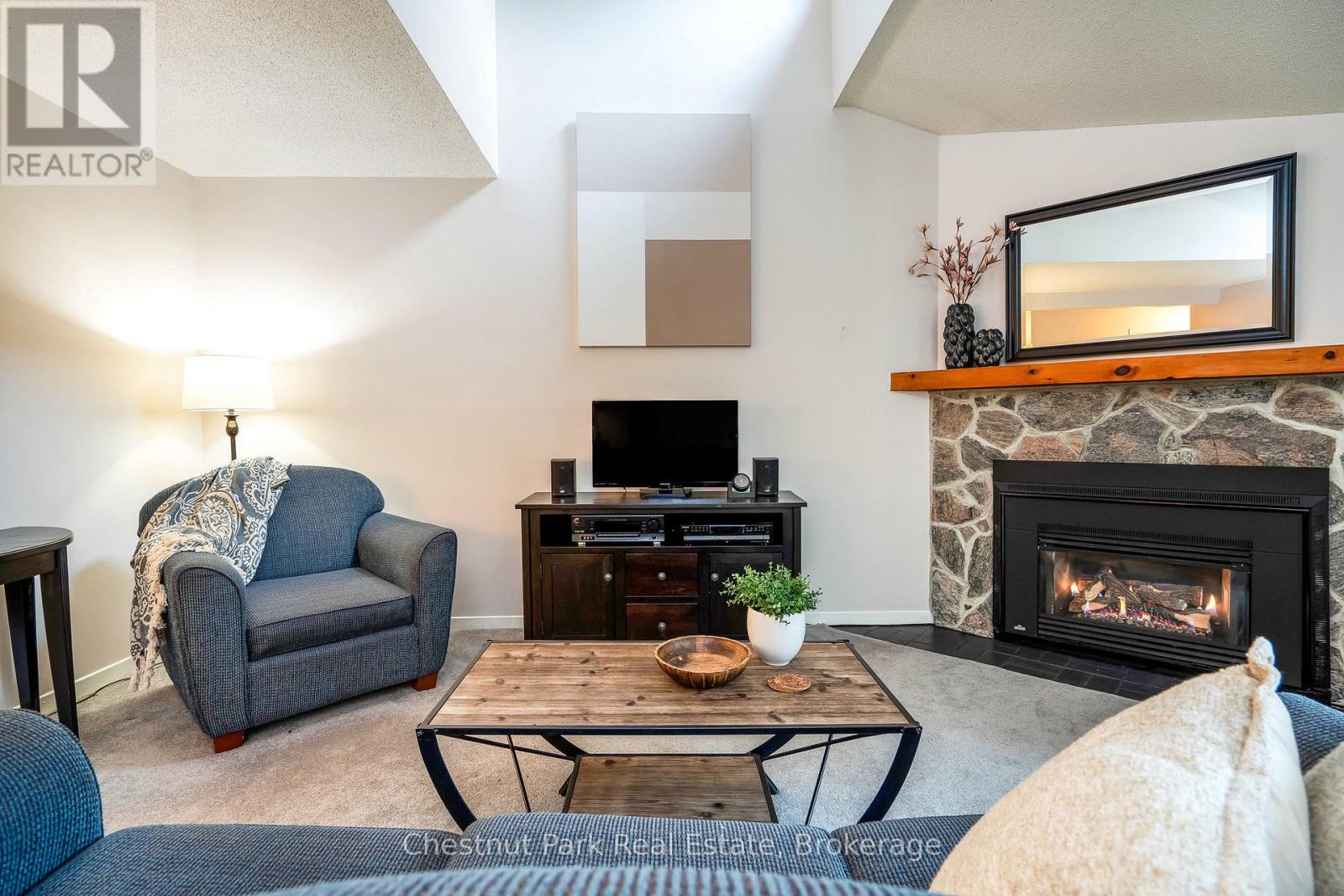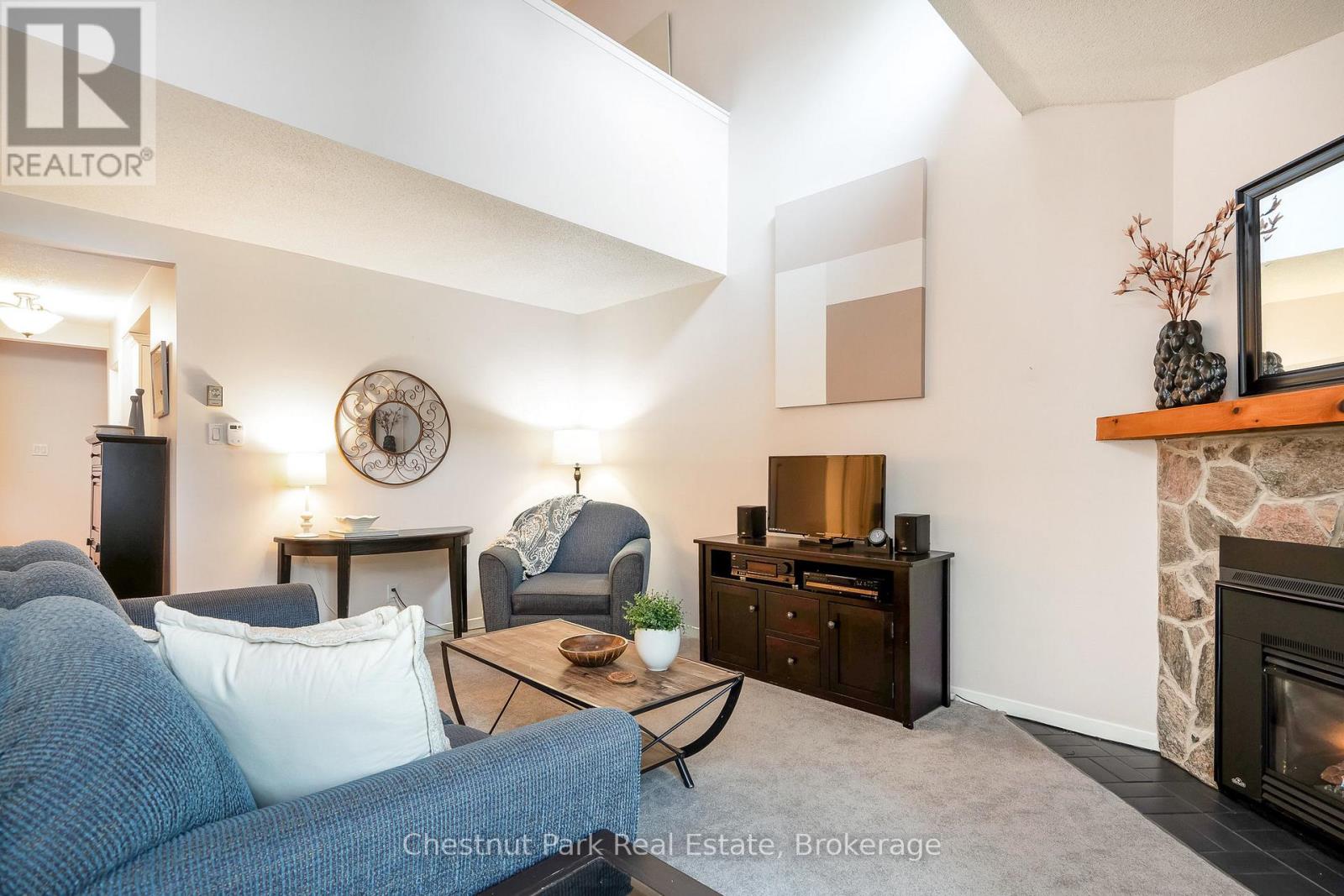 Set against a peaceful forest backdrop, this updated 3-bed, 3-bath condo townhome at Whisper Woods offers refined Collingwood living. Positioned at the quiet end of the community away from Highway 26, it provides exceptional privacy and a natural setting. The bright, open main floor features a renovated kitchen, dining area, and living room with soaring vaulted ceilings and a gas fireplace. A main-floor primary suite with ensuite, along with laundry and powder room, adds to the home's thoughtful layout. Upstairs, a loft-style bedroom overlooks the living space, complemented by an additional bedroom and full bath, ideal for guests or family. Gas fireplace venting has been updated to meet current condo requirements, including a new insert offering added value and peace of mind. Enjoy a private patio with tranquil forest views. One parking space plus guest parking included. Low-maintenance living with exterior upkeep, snow removal, and lawn care handled for you. Minutes to skiing, golf, Georgian Bay, and Collingwood's shops and dining. (id:64974)