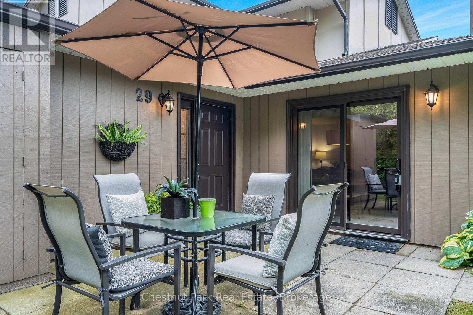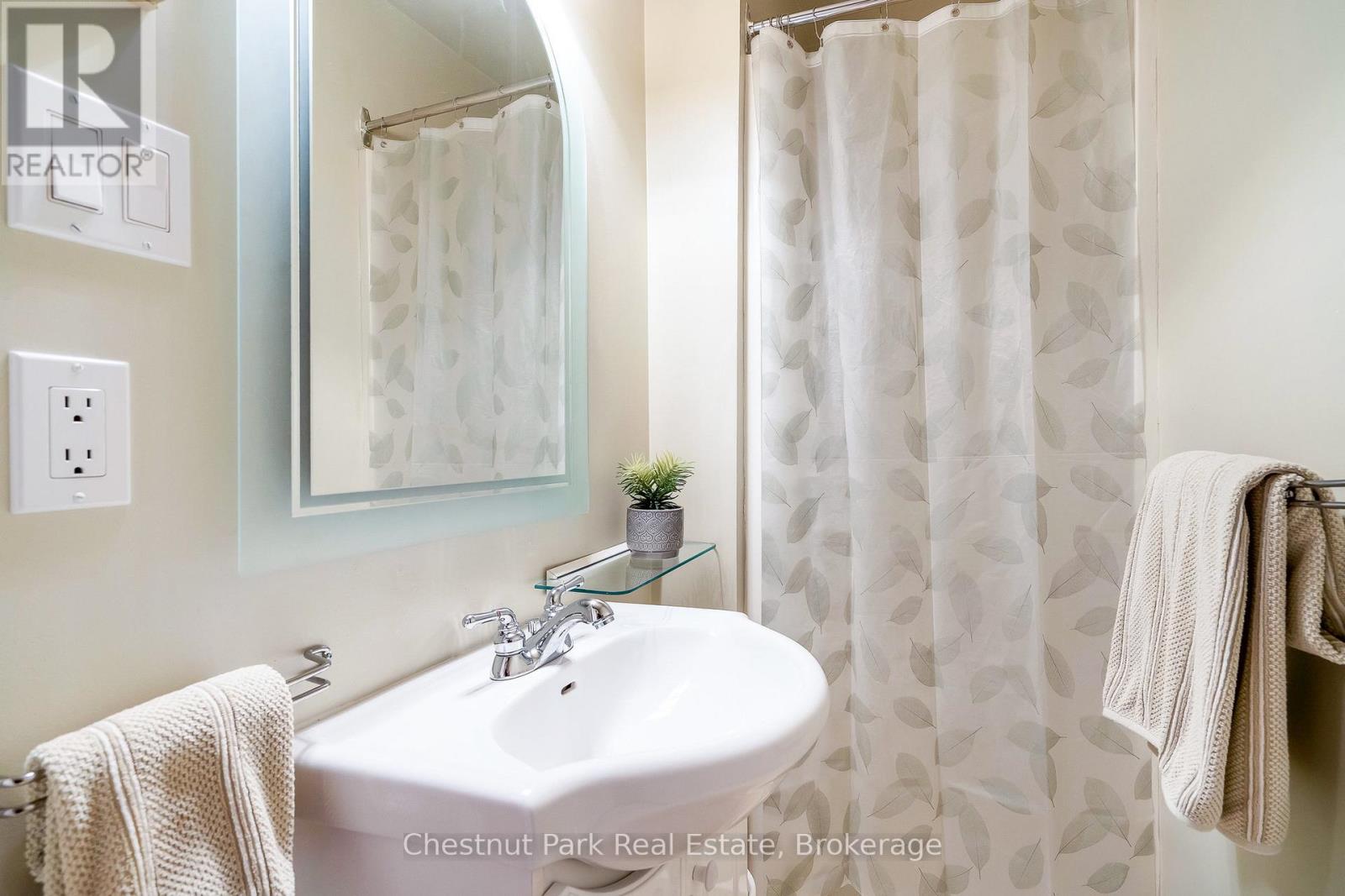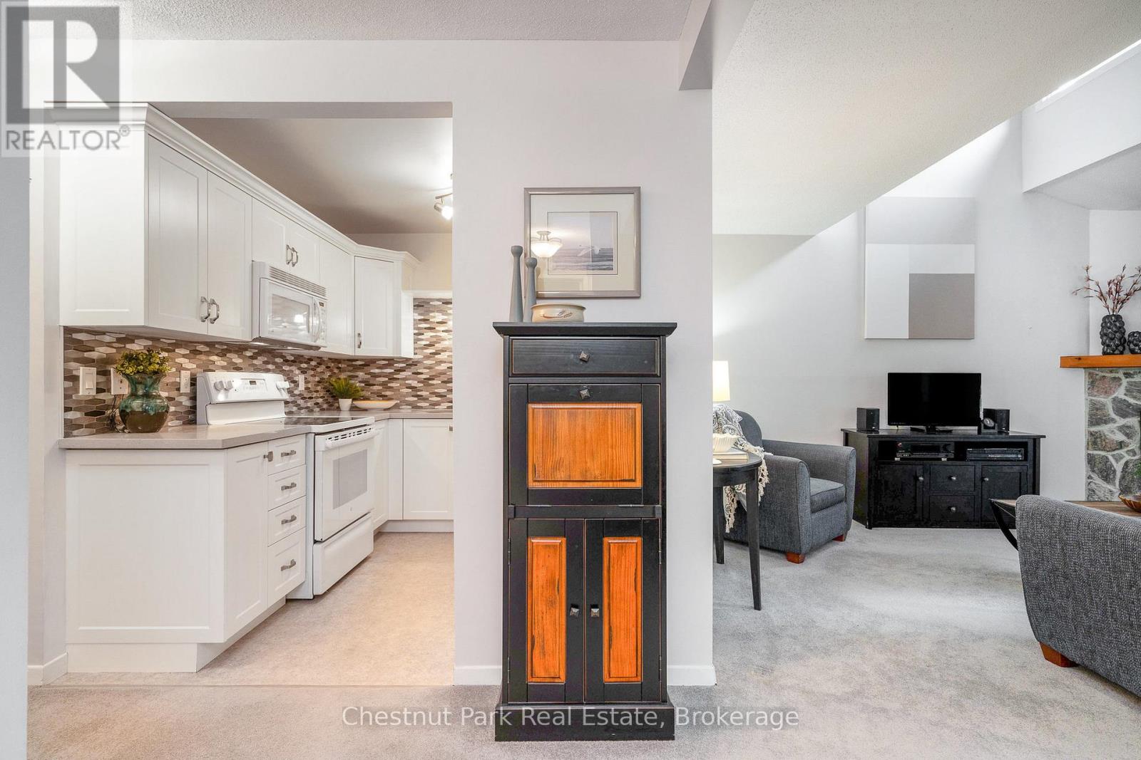 Set against a peaceful forest backdrop, this updated 3-bed, 3-bath condo townhome at Whisper Woods offers refined Collingwood living. Positioned at the quiet end of the community away from Highway 26, it provides exceptional privacy and a natural setting. The bright, open main floor features a renovated kitchen, dining area, and living room with soaring vaulted ceilings and a gas fireplace. A main-floor primary suite with ensuite, along with laundry and powder room, adds to the home's thoughtful layout. Upstairs, a loft-style bedroom overlooks the living space, complemented by an additional bedroom and full bath, ideal for guests or family. Gas fireplace venting has been updated to meet current condo requirements, including a new insert offering added value and peace of mind. Enjoy a private patio with tranquil forest views. One parking space plus guest parking included. Low-maintenance living with exterior upkeep, snow removal, and lawn care handled for you. Minutes to skiing, golf, Georgian Bay, and Collingwood's shops and dining. (id:64974)
