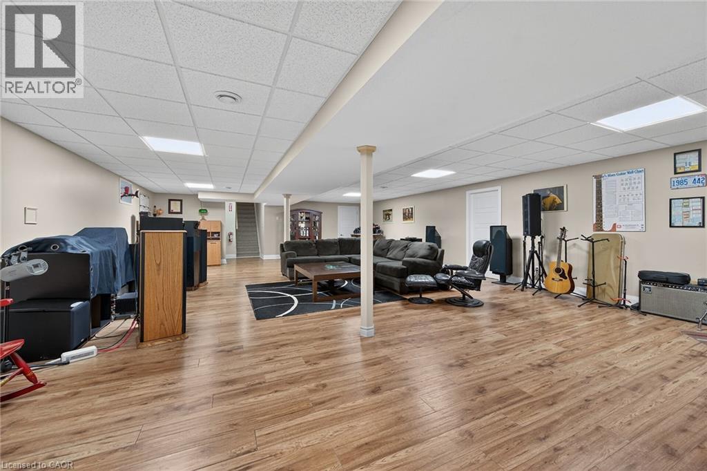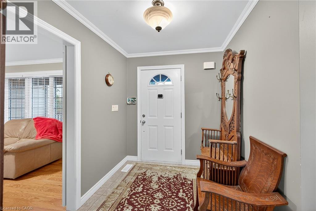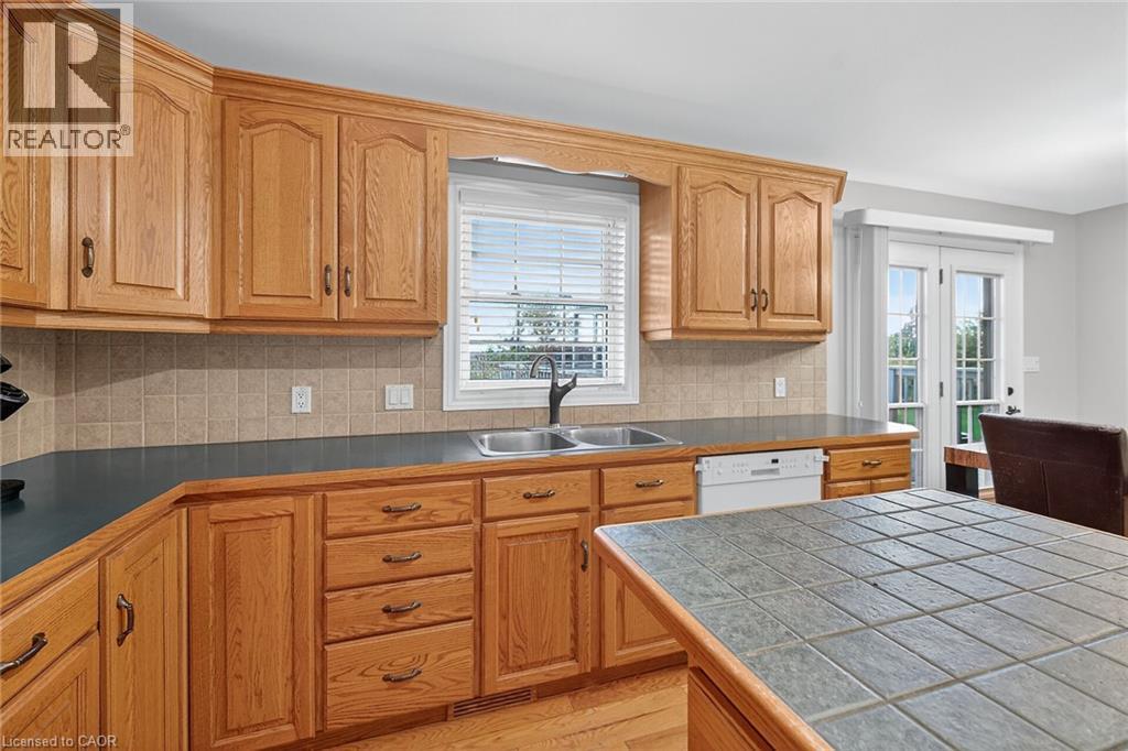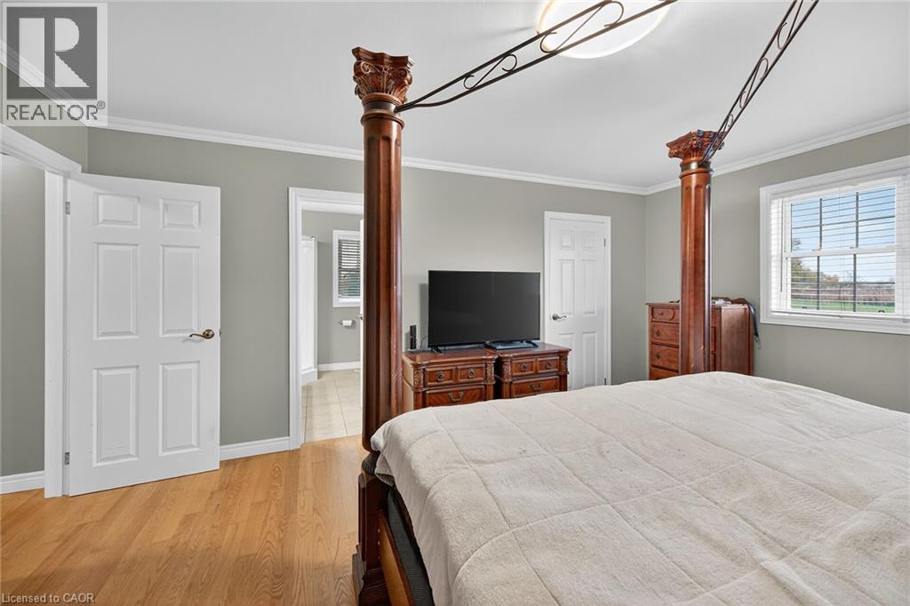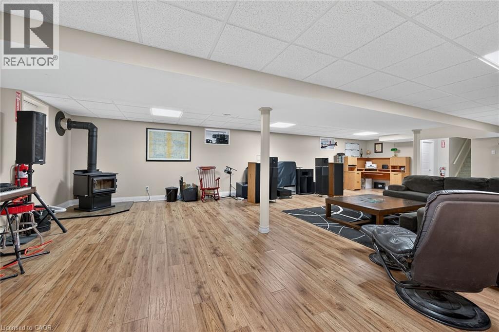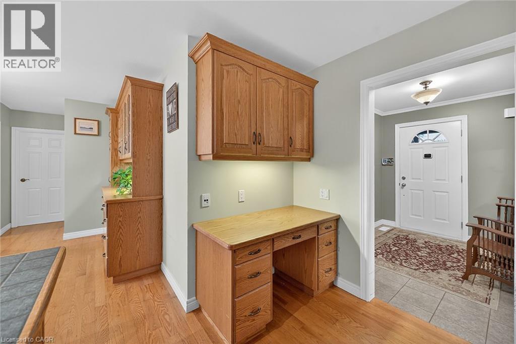 Well cared for fully finished 3 bedroom, 2.5 bath bungalow with two fireplaces (gas & wood stove) situated on fenced 2.24 acre property. Large driveway with ample parking for approximately 10 cars. House is set back a good distance from road & contains two separate entrances (from side of house & from inside garage) to lower level allowing for potential future in-law set up capability. Crown moulding & hardwood flooring is featured throughout the living room, hallway & all bedrooms. Eat-in kitchen showcases oak kitchen cabinets, ceramic backsplash, breakfast bar island, built-in oak desk plus built-in oak hutch/buffet combo, hardwood flooring & patio door to deck & rear yard. Corner gas fireplace with lovely oak surround in living room. Generous sized primary bedroom with walk-in closet & 4 piece ensuite with separate shower & jetted tub. Convenient main floor laundry room provides access to lower level & covered patio & side yard. Lower level offers additional living space with an oversized rec room with laminate flooring & a WETT certified wood stove, den with built-in shelving & a cozy game room plus utility & storage rooms. Newer furnace & central air (2019). Country living with close proximity to main road. Several nearby amenities. Only about a 20 minute drive to Upper Centennial Parkway in Stoney Creek via Highway 20. (id:64974)