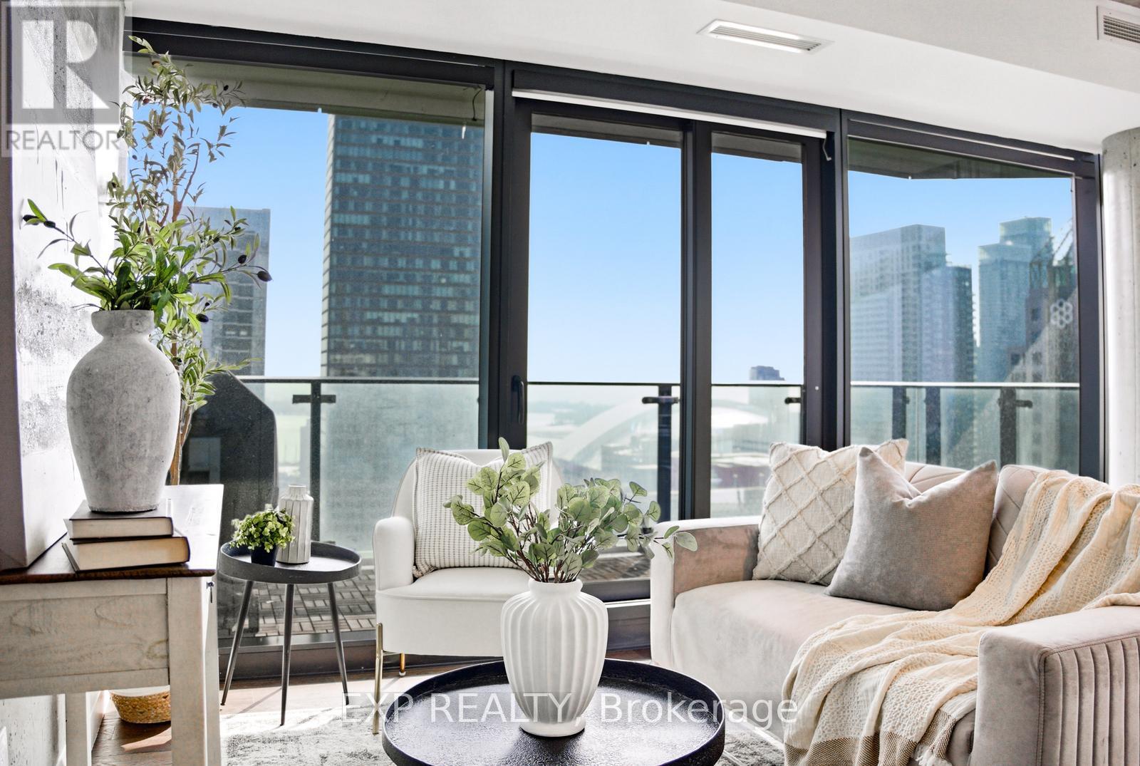 Welcome to Elevated Downtown Living at its Finest in the Heart of King St W! Situated on the 29th Floor of the Theatre Park Building, This Stunning Corner Suite Offers Spectacular Southwest Views of the Lake and the City All From the Comfort of Your Own Home. The Expansive Floor to Ceiling Windows Allow Natural Light to Pour into this Thoughtfully Designed Unit which Features a Gorgeous Modern Kitchen with a Gas Cooktop, Exposed Concrete Walls/ Ceilings & Columns for a Chic Loft Aesthetic and Automated Blinds Which Provide Effortless Convenience & Privacy at the Touch of a Button. The Nearly 9-Foot Ceilings Enhance the Airy Feel, While Engineered Wood Flooring & Upgraded Light Fixtures Bring Warmth & Sophistication.The Open-Concept Layout Flows Seamlessly to a Very Large Balcony Equipped with a Gas BBQ - Perfect for Entertaining While Enjoying the Panoramic Views. Both Bedrooms Include Closet Organizers Maximizing Storage and Functionality. Residents Experience the Benefits of Exceptional Building Amenities Including a 24 Hour Concierge/Security, Outdoor Pool, Fully-Equipped Gym & Stylish Party Room. With a Walk Score of 100, You Are Only Steps to the PATH, St Andrew Subway Station, World-Class Dining, Royal Alexandra Theatre, Princess of Wales Theatre, Roy Thompson Hall, the Financial District, Toronto's Vibrant Waterfront, Sporting Venues & So Much More. Experience the Perfect Blend of Architectural Design, Modern Comfort and Unbeatable Location. (id:64974)