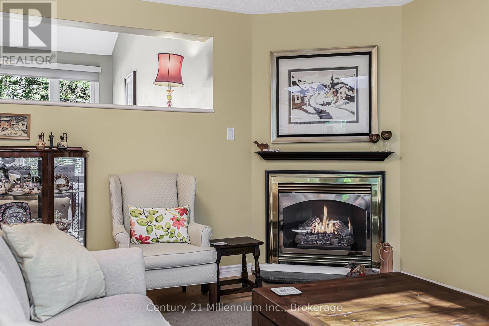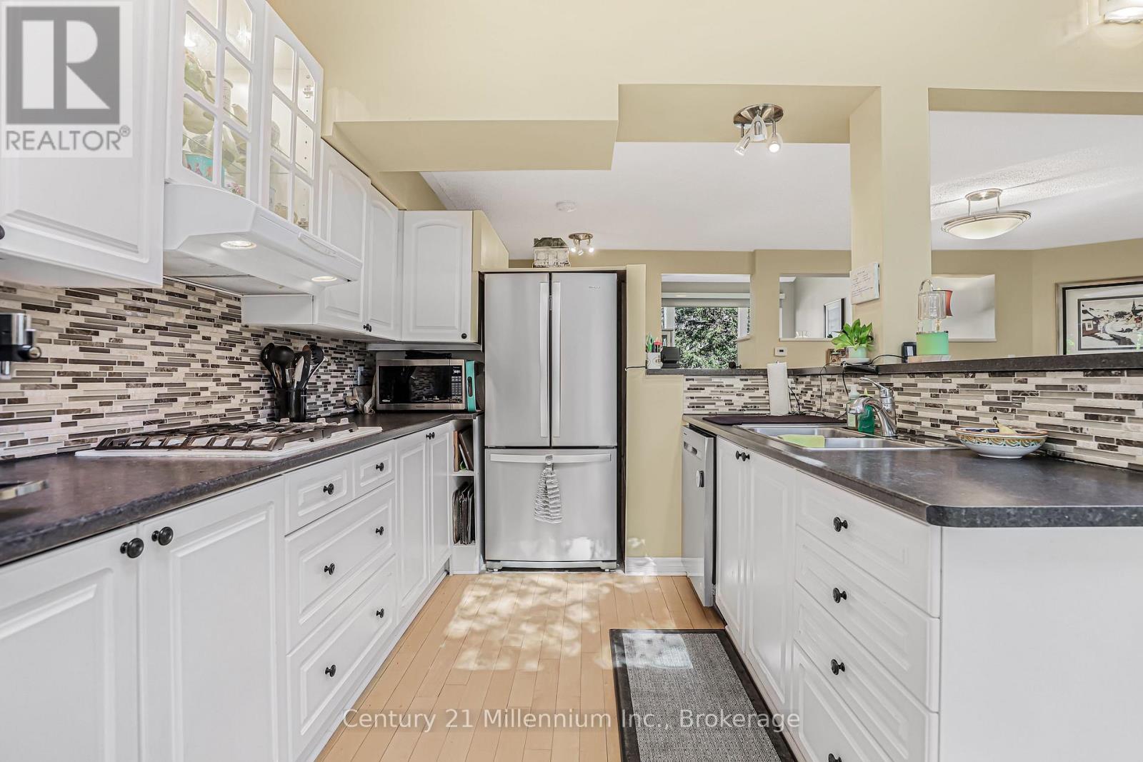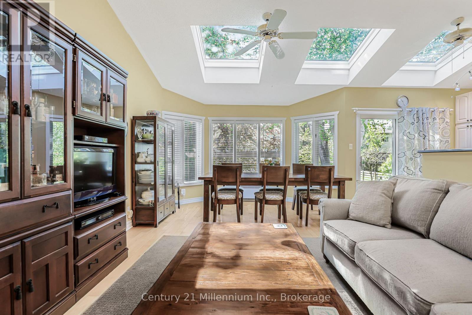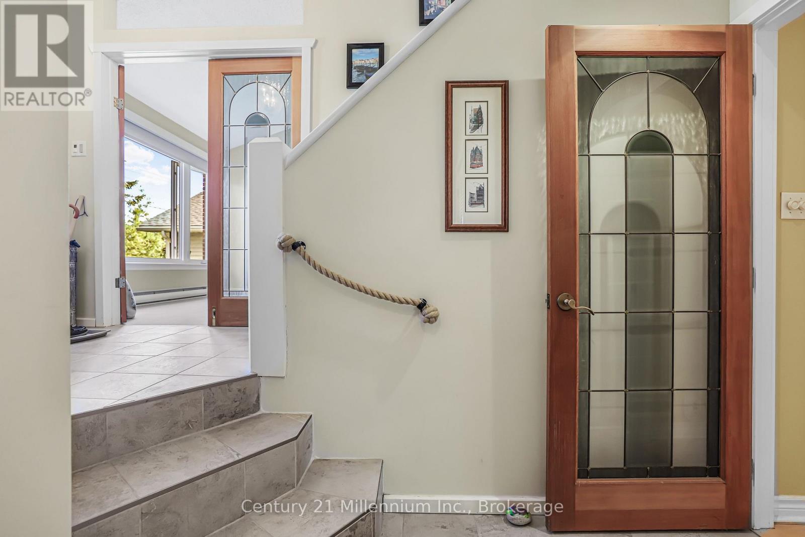Welcome to this meticulously maintained multi-level back split home, nestled on a beautifully landscaped lot in the heart of Southampton. Just a short stroll to the sparkling shores of Lake Huron and the vibrant downtown core, this home offers both tranquility and convenience. Step inside the generous foyer, where the west-facing living room invites you to relax and enjoy breathtaking evening sunsets. The true heart of this home is the stunning family/dining room and kitchen, boasting a full wall of windows, skylights and a patio door that opens to the serene rear perennial gardens, patio w/firepit, and small pond. Natural light floods the space from three skylights, while a cozy natural gas fireplace adds warmth and ambiance perfect for quiet conversations, lively family nights, or culinary creations in the well-appointed kitchen with built-in appliances and a thoughtfully designed layout. Enjoy meals indoors or al fresco under the charming pergola, where the soothing sounds of the waterfall in the pond create the perfect backdrop for outdoor dining. Patio table and chairs are included for effortless entertaining! The main level also features a bedroom, a full bathroom, and a convenient laundry/mudroom with access to both the garage and side yard ideal for unloading groceries or stepping in from outdoor fun. Upstairs, two spacious bedrooms and a full bath await, with the primary suite offering double closets and lovely east, south and west-facing windows. The lower-level family room provides additional comfort with a second natural gas fireplace, along with a tucked-away office space featuring a large desk ready for move-in convenience. Storage is plentiful, with a large storage/workshop area, a double-car garage with additional space, and an attached garden shed perfect for storing equipment and outdoor essentials. Back-up Generac Natural Gas generator. This home is truly a complete package, offering comfort, style, and an unbeatable location. (id:64974)