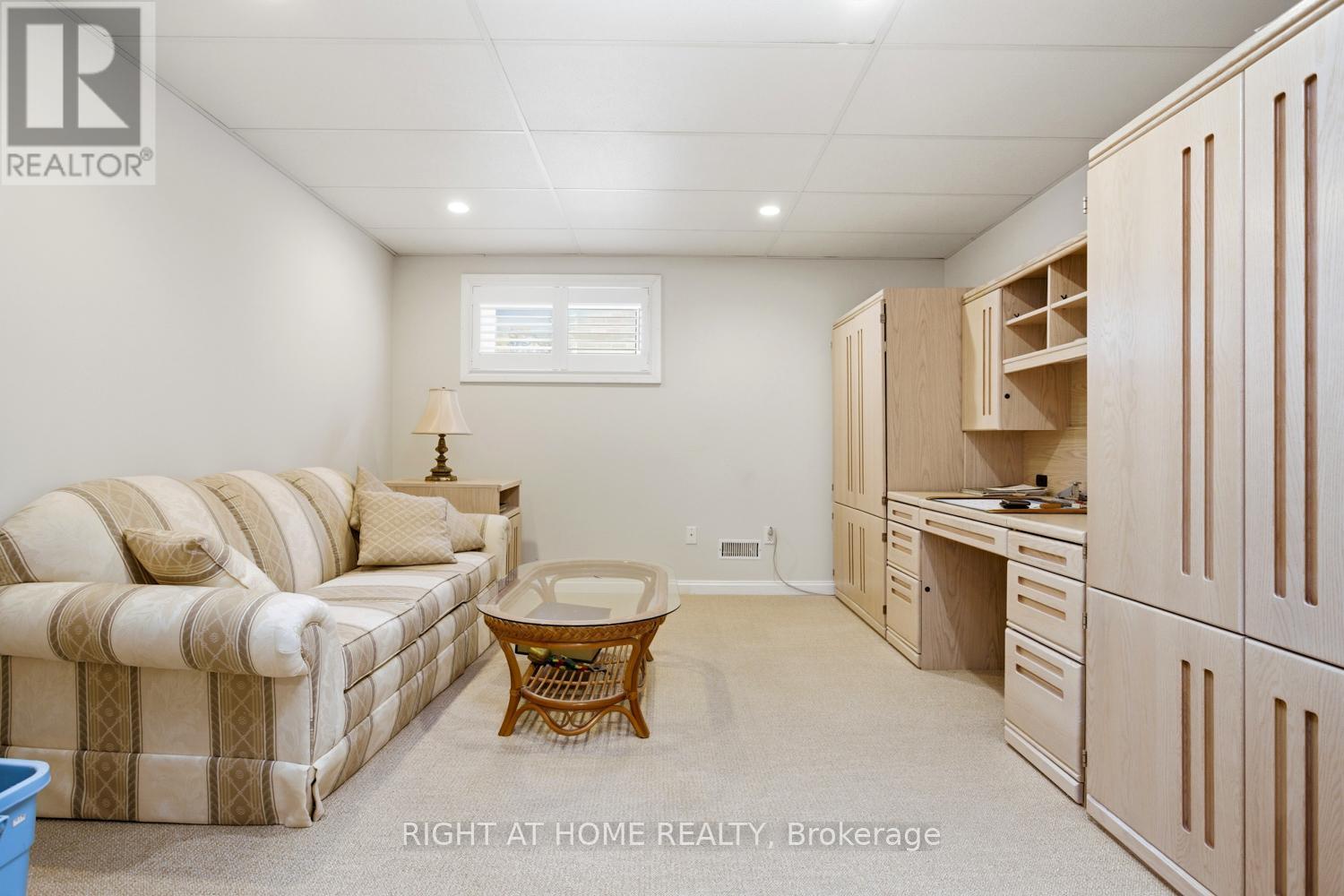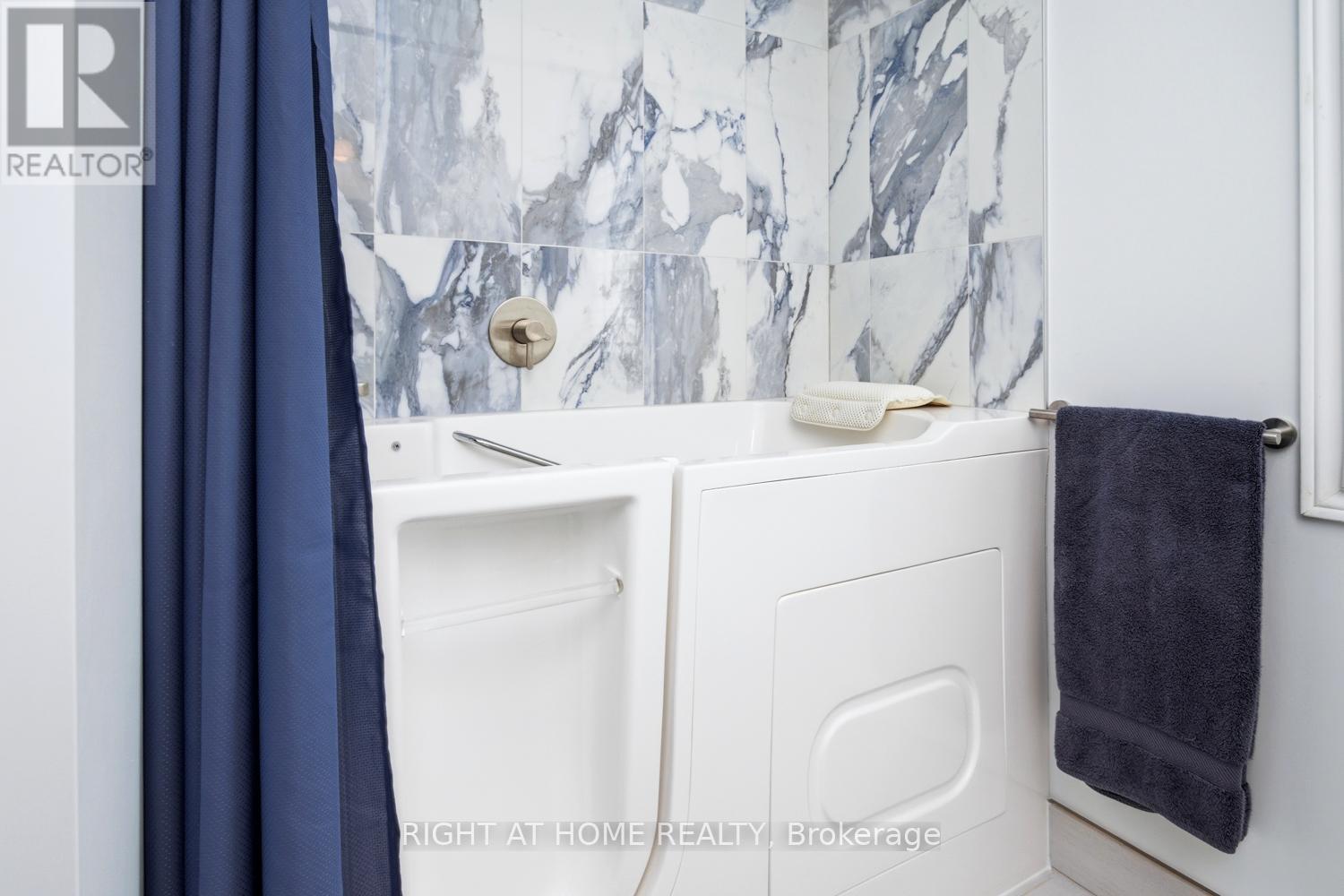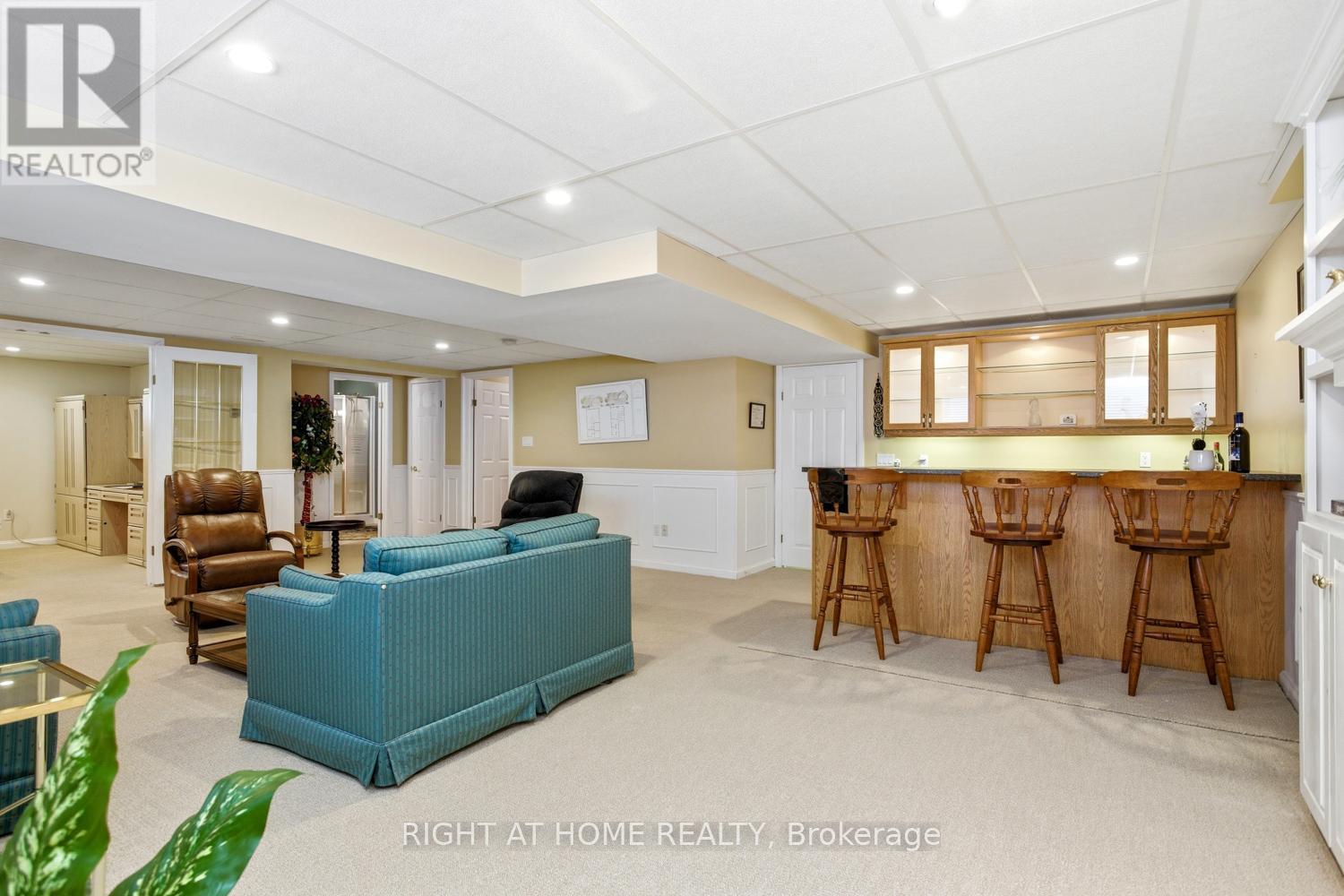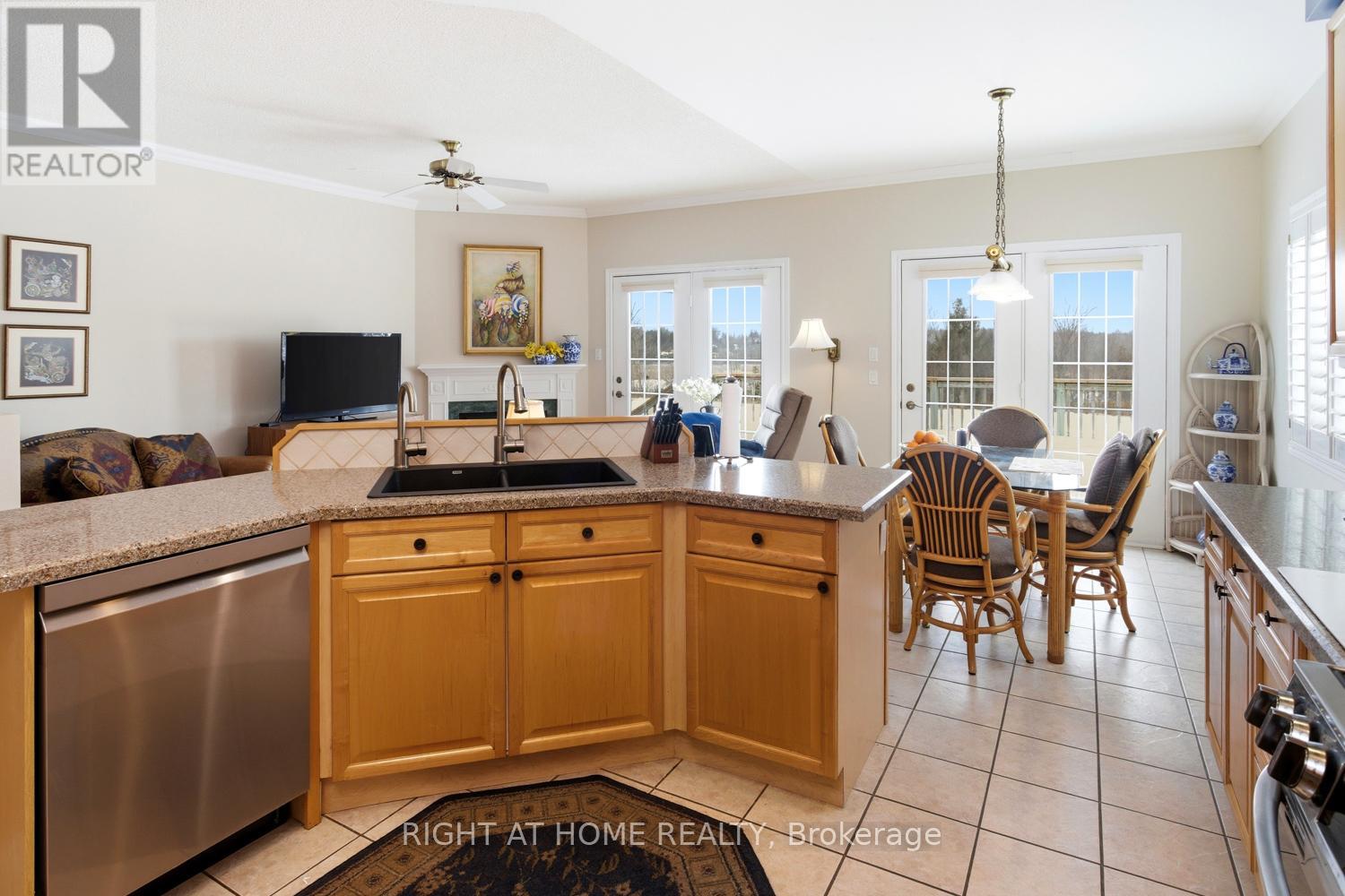Welcome to Canterbury Common and this beautifully maintained **all-brick bungalow** located in a highly sought-after **adult lifestyle community**, perfectly positioned **backing onto peaceful green space** for added privacy and scenic views. This spacious home features **2 generous bedrooms** and **2 updated 3-piece bathrooms on the main level**, including one with a convenient **walk-in bathtub** for added comfort and accessibility. The home offers **large principal rooms**, including a bright **living room, formal dining room, and inviting family room with gas fireplace and walkout**.The **large kitchen** is ideal for entertaining and everyday living, featuring a **center island, all newer stainless steel appliances!! and a **walkout to a spacious deck with canopy**, perfect for relaxing or enjoying outdoor dining while overlooking the beautifully landscaped yard and green space beyond. The **fully finished basement** expands the living space with a **huge recreation room**, **cozy gas fireplace**, **bar area**, and an additional **3-piece bathroom**, making it an excellent space for entertaining guests or relaxing. Additional highlights include:* **Hardwood floors** in the living room, dining room, and family room* **Double car garage*** **Professional landscaping*** **Bright, spacious layout throughout**Residents enjoy access to the **community clubhouse and swimming pool**, offering a vibrant lifestyle with excellent amenities. A rare opportunity to enjoy **comfortable bungalow living in a welcoming adult community surrounded by nature.** (id:64974)