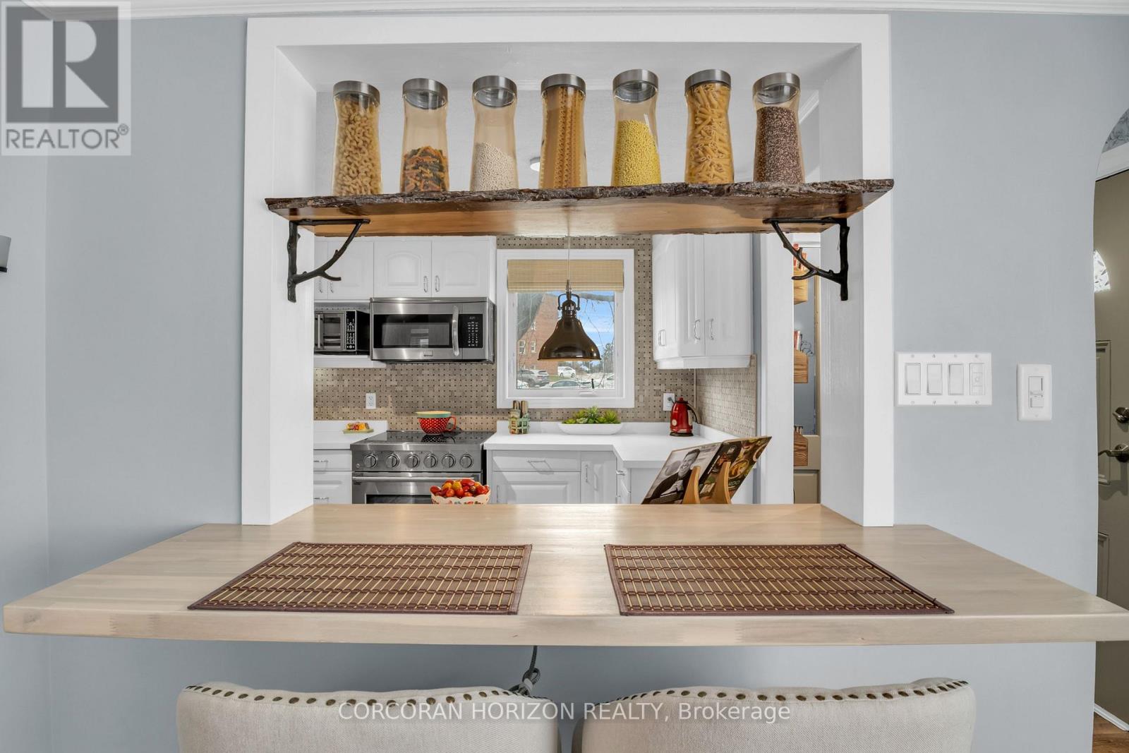This pristine 3 bedroom, 2 bathroom home offers a great blend of character and thoughtful updates in a well-designed 1.5 storey layout. The beautifully updated kitchen is bright and charming, featuring stainless steel appliances, a large window, and a cute pass-through to the dining room complete with a countertop and seating for two-perfect for casual meals or entertaining. The dining room is generously sized and showcases a cozy gas fireplace along with a large window that continues the home's bright, airy feel. Just beyond, the spacious living room is anchored by a second fireplace, creating a warm and inviting central gathering space. The bedrooms are all well-proportioned, each with thoughtful updates throughout. The main bathroom features a stand-up tiled shower with an upgraded jet faucet for a spa-like experience. Upstairs, you'll find two additional bedrooms with large windows and ample storage, offering a comfortable and private retreat. Both the main and upper levels are carpet-free, adding to the home's clean feel and ease of maintenance. The finished lower level extends your living space with a comfortable rec room, perfect for movie nights or a play area, along with a laundry room, 3-piece bathroom, and ample storage. Outside, the private, fully fenced backyard is a great place to unwind, featuring a spacious patio for outdoor dining, pond and a garden filled with colourful perennials, along with apple trees, strawberries, and raspberries to enjoy throughout the seasons. The double car garage provides plenty of room for parking and storage. Situated in the sought-after East Ward and just steps from the Kitchener Auditorium, this home is within walking distance to parks and schools, and offers convenient access to shopping, transit, and the 401 for commuters. (id:64974)