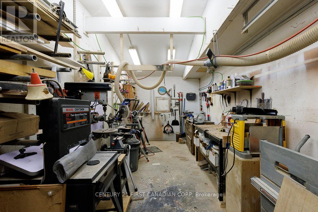 Tucked beside Waterworks Park at the end of a quiet cul-de-sac, this unique property combines a versatile multi-bay garage/workshop and a welcoming, light-filled home. Sun pours in through generous windows and skylights, highlighting the gleaming hardwood floors in the family and dining rooms. The kitchen offers excellent storage, plenty of countertops, and a built-in island nook that creates a warm, open gathering space. The main level includes a comfortable bedroom and a 4-piece bathroom. Upstairs, you'll find two additional well-proportioned bedrooms accented by charming dormer windows. The finished lower level adds even more flexibility, with a second living area, two multipurpose rooms ideal for hobbies, office space, or a playroom, plus a furnace room and a former laundry room with hookups still in place. The standout feature is the expansive garage complex. Designed for maximum adaptability, it can function as both a traditional garage and a serious workshop. Part of the space is already set up for potential in-law, with its own 3-piece bathroom, laundry area, and a separate entrance with backyard access. With no stairs and a walk-in shower, it's particularly well-suited for those with mobility needs. If a larger shop is your priority, you can open the partial wall to create one continuous workshop area, with storage to spare. This area includes its own furnace, air extraction, and dust collection system-great for serious projects or a home-based business. Outdoors, the property feels like a private retreat. Enjoy the deck, mature trees, and hot tub, all in a tranquil, park-side setting that feels far removed from city bustle. Pet owners will value the invisible fencing, allowing dogs to roam safely. With a durable metal roof installed in 2018 and an exceptional combination of privacy, serenity, and highly adaptable space, this home offers opportunities that is unique. (id:64974)