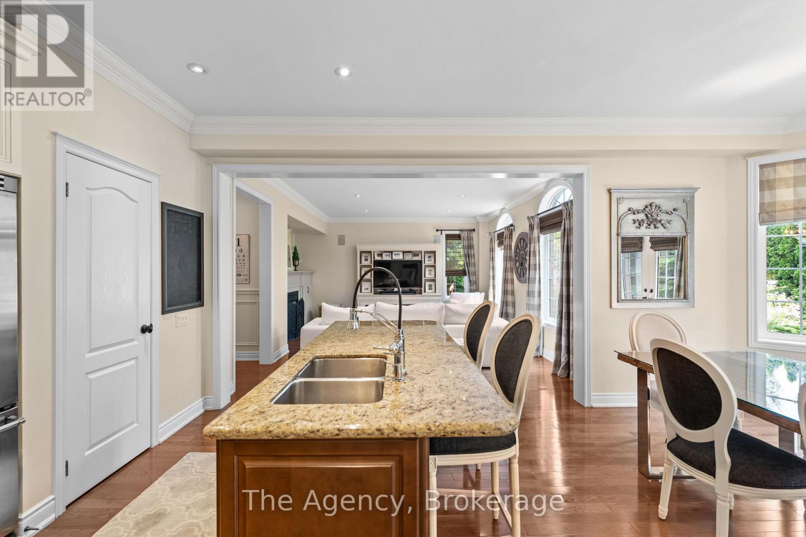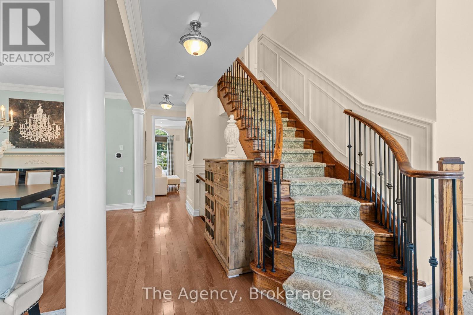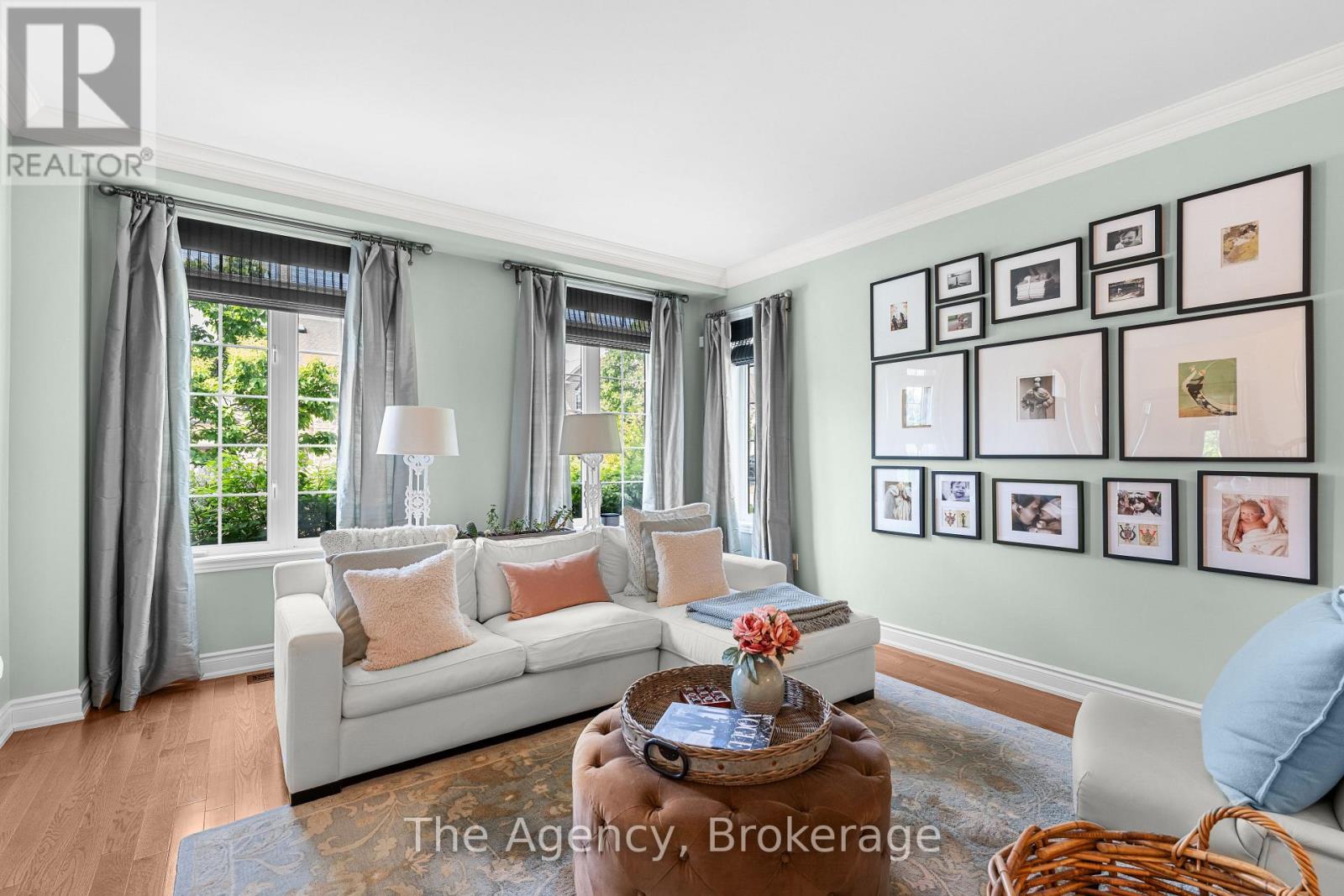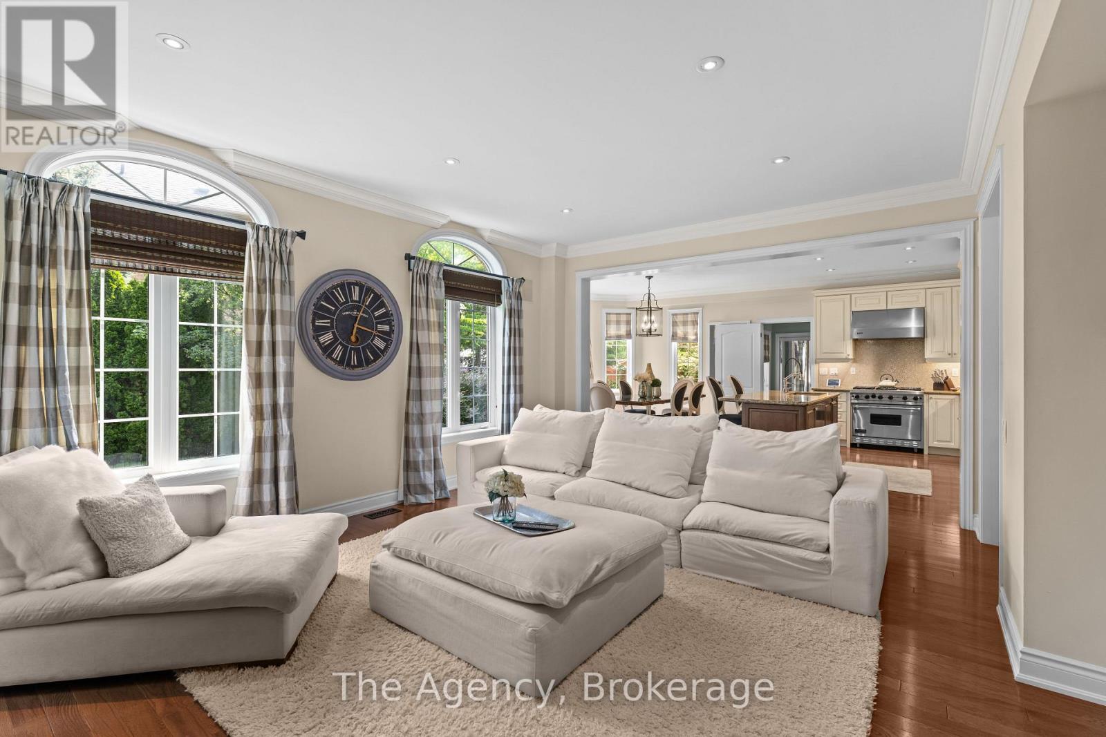 Introducing the Rosehaven Cantley model, an exceptional four-bedroom, three-bathroom residence that exemplifies luxurious living, set on a premium corner lot in the prestigious Lakeshore Woods community of southwest Oakville. With an elegant stone and brick exterior, enhanced by additional side windows that flood the interior with natural light, this home offers unmatched curb appeal and sophistication. Inside, this meticulously designed home blends elegance and comfort. The chef's kitchen is a true centerpiece, featuring premium commercial-grade appliances, an oversized center island, crown molding, pot lights, and rich hardwood flooring. The adjoining family room and kitchen offer views of the professionally landscaped backyard complete with custom iron gates, clay street pavers, an in-ground sprinkler system, and integrated outdoor speakers perfect for entertaining or relaxing in your private oasis. Thoughtful upgrades are found throughout, including crown molding, custom wainscoting, a fully integrated security system with cameras, and custom California Closets built-ins. Designer window coverings from Hunter Douglas and Housewarmings add refined style and functionality. The main floor mudroom is both practical and elegant, with custom cabinetry, drying racks, and convenient garage access. Nestled in one of Oakville's most coveted lakeside neighborhoods, this family-friendly enclave is just steps from the lake, scenic parks, wooded trails, a dog park, tennis and pickleball courts, splash pads, and sports fields. Enjoy endless outdoor adventures, with miles of walking and biking trails connecting to Nautical and Shell Parks, local beaches, and the vibrant waterfront charm of Bronte Village, with its yacht club, boutique shops, cafes, and fine dining. A rare opportunity to own an exquisite home that seamlessly blends luxury, lifestyle, and location in one of Oakville's most desirable communities. (id:64974)