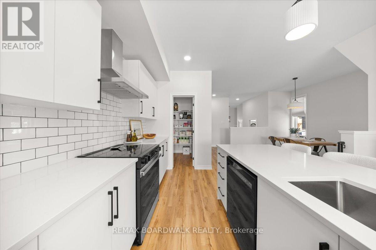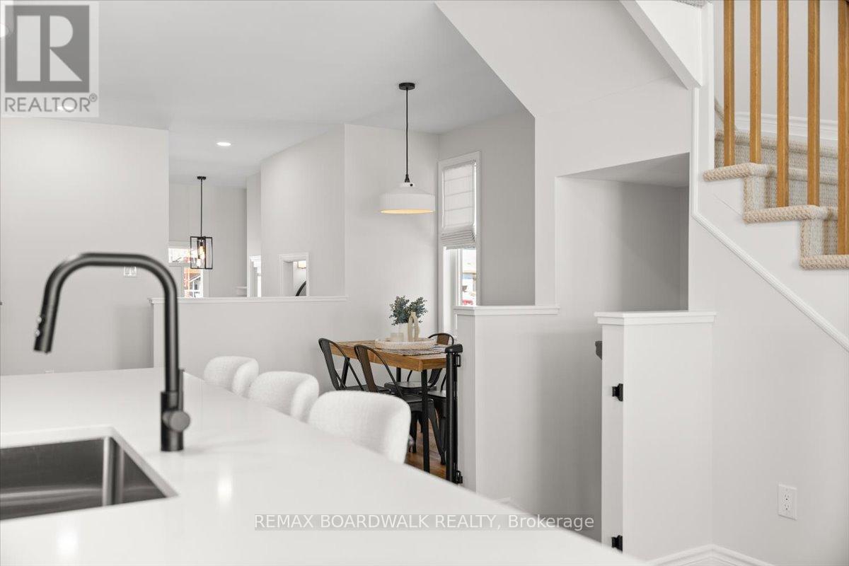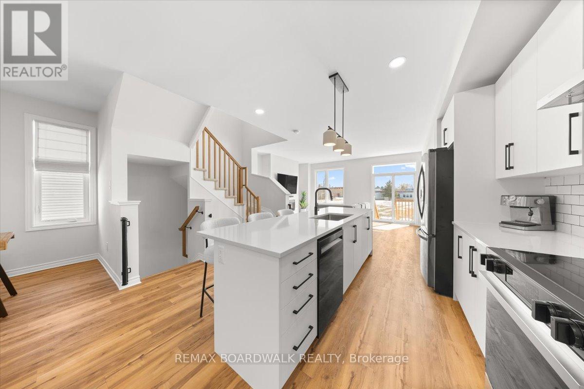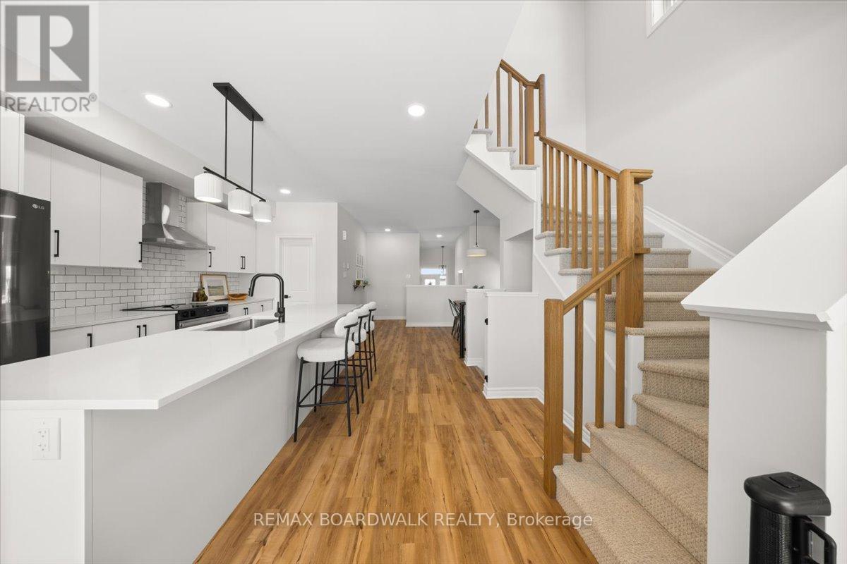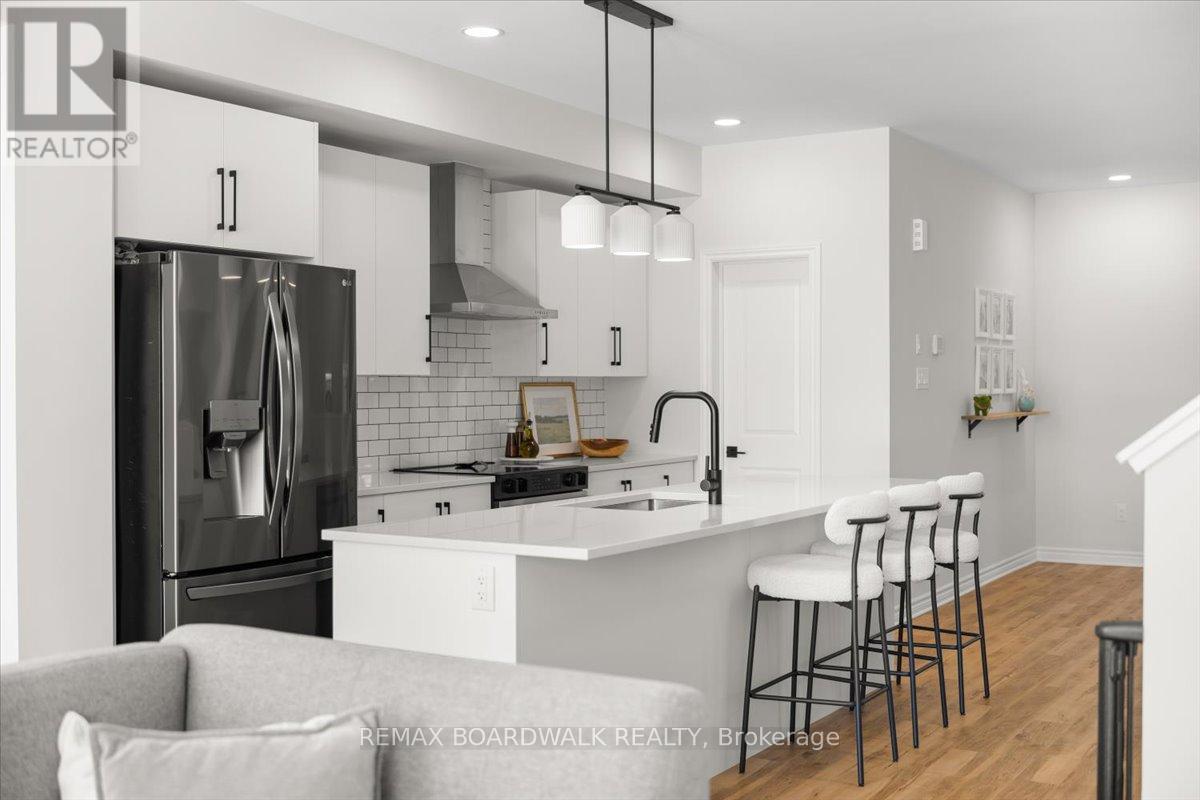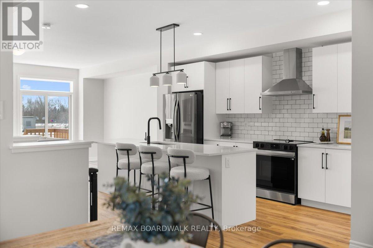 Modern, move-in ready 2025 EQ-built end unit townhome offering over 2,200 sqft of beautifully finished living space with 4 bedrooms and 2.5 bathrooms. Striking exterior blends brick, stone, and vertical siding for added architectural appeal. Deep driveway leads to an inviting covered front porch with glass panelled door and transom window. Spacious sunken foyer with built-in bench adds everyday convenience. The chef-inspired kitchen features an oversized quartz centre island, stylish subway tile backsplash, stainless steel appliances, sleek black hardware, large recessed sink, and a family-sized walk-in pantry. The adjacent dining area offers modern lighting and double windows, while the bright living room showcases wide plank flooring, an electric fireplace, and patio doors leading to the backyard. A powder room and interior access to the garage complete the main level. Upstairs, you'll find four generously sized bedrooms. The primary suite offers a large walk-in closet and a 4-piece ensuite with double undermount sinks and a glass-enclosed shower. Plush berber carpet and flat ceilings run throughout the second level. Convenient laundry room with linen storage and a second full bath with large vanity and tiled flooring upstairs. The fully finished basement provides a versatile and bright rec room, ample storage space, and a bathroom rough-in for future potential. Spacious backyard with no rear neighbours, offering added privacy. Located near parks and schools in the growing community of Embrun, this home offers space, comfort, and value - without compromise. (id:64974)