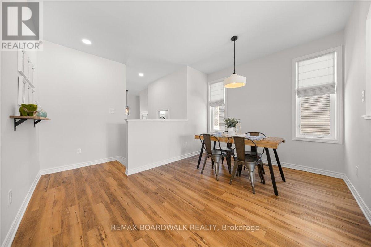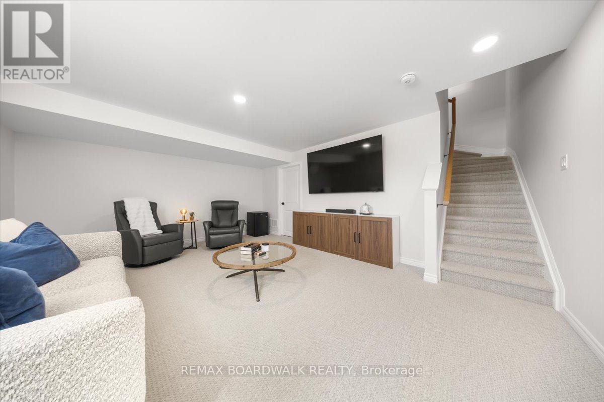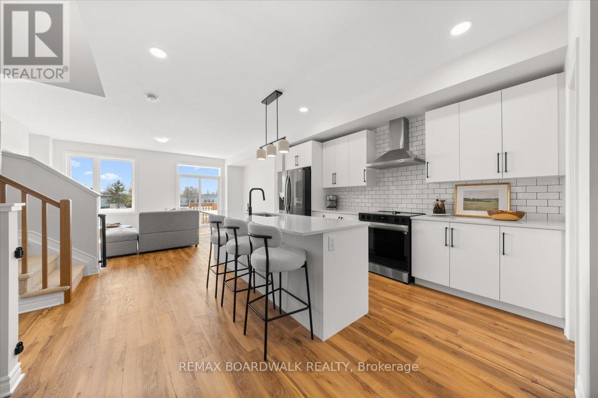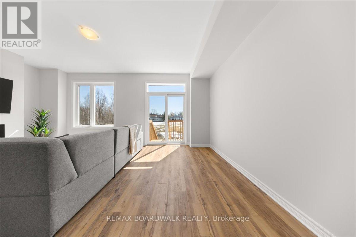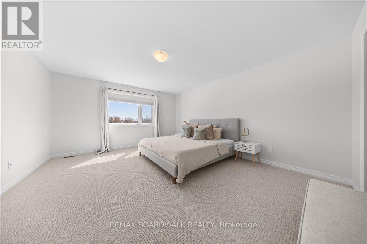 Modern, move-in ready 2025 EQ-built end unit townhome offering over 2,200 sqft of beautifully finished living space with 4 bedrooms and 2.5 bathrooms. Striking exterior blends brick, stone, and vertical siding for added architectural appeal. Deep driveway leads to an inviting covered front porch with glass panelled door and transom window. Spacious sunken foyer with built-in bench adds everyday convenience. The chef-inspired kitchen features an oversized quartz centre island, stylish subway tile backsplash, stainless steel appliances, sleek black hardware, large recessed sink, and a family-sized walk-in pantry. The adjacent dining area offers modern lighting and double windows, while the bright living room showcases wide plank flooring, an electric fireplace, and patio doors leading to the backyard. A powder room and interior access to the garage complete the main level. Upstairs, you'll find four generously sized bedrooms. The primary suite offers a large walk-in closet and a 4-piece ensuite with double undermount sinks and a glass-enclosed shower. Plush berber carpet and flat ceilings run throughout the second level. Convenient laundry room with linen storage and a second full bath with large vanity and tiled flooring upstairs. The fully finished basement provides a versatile and bright rec room, ample storage space, and a bathroom rough-in for future potential. Spacious backyard with no rear neighbours, offering added privacy. Located near parks and schools in the growing community of Embrun, this home offers space, comfort, and value - without compromise. (id:64974)