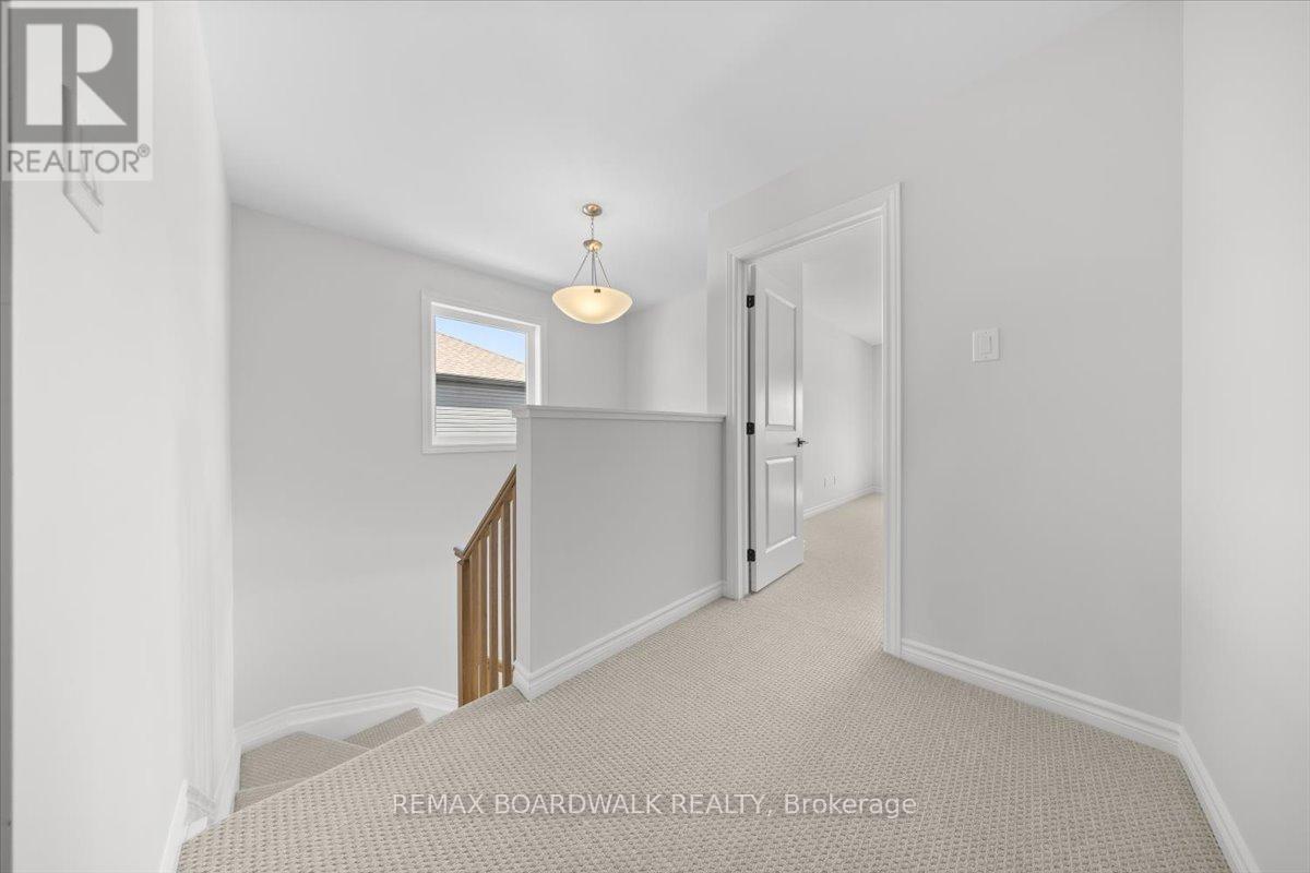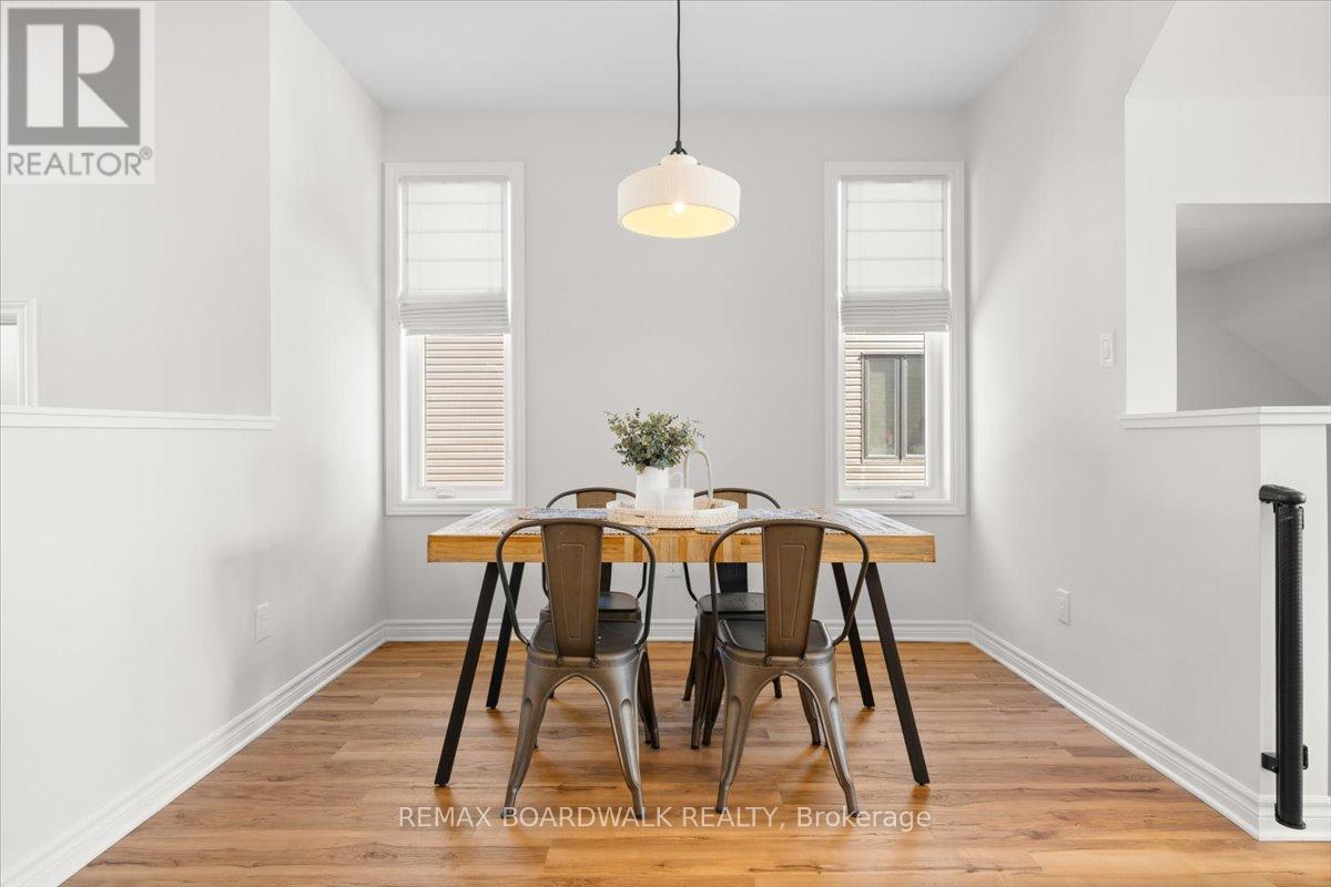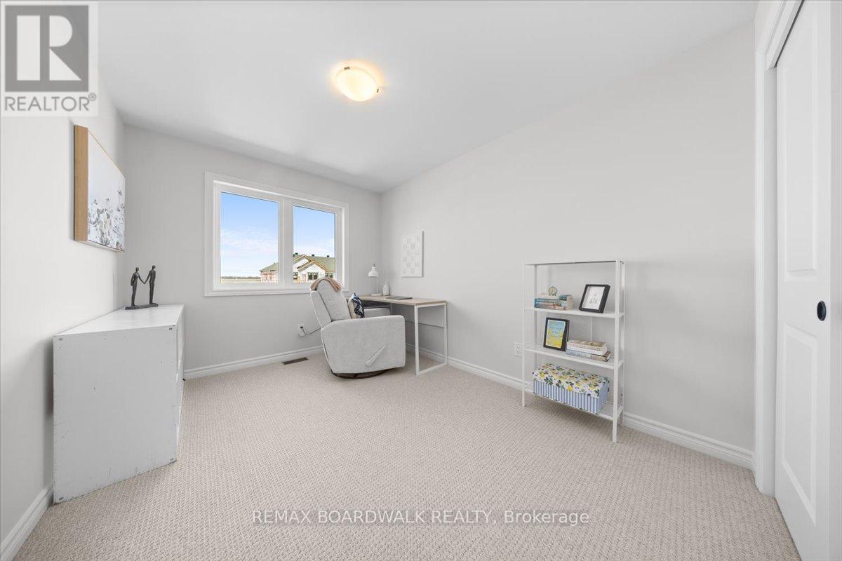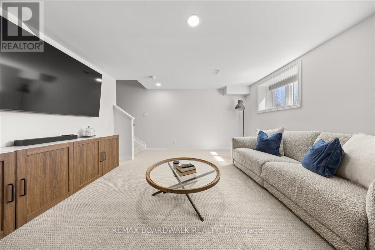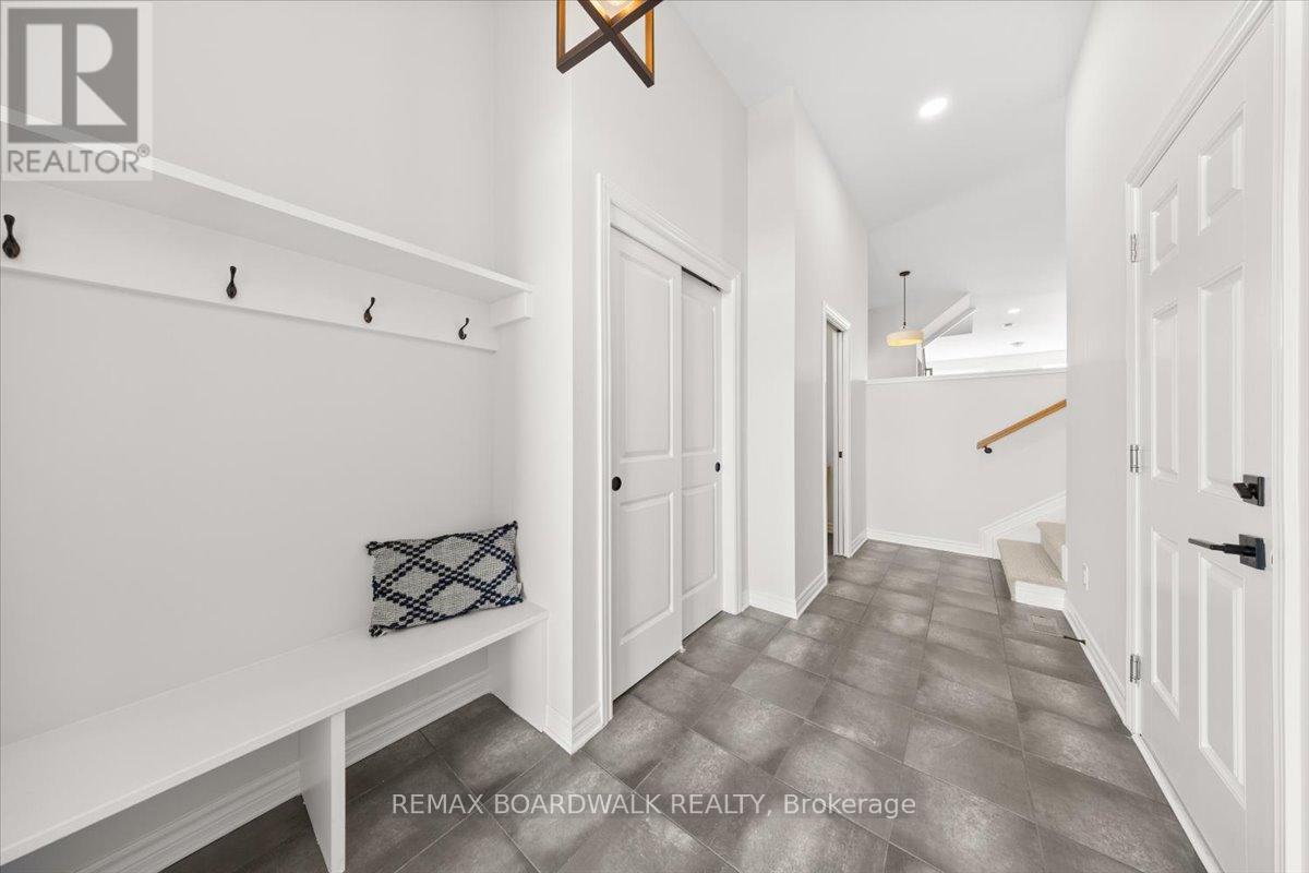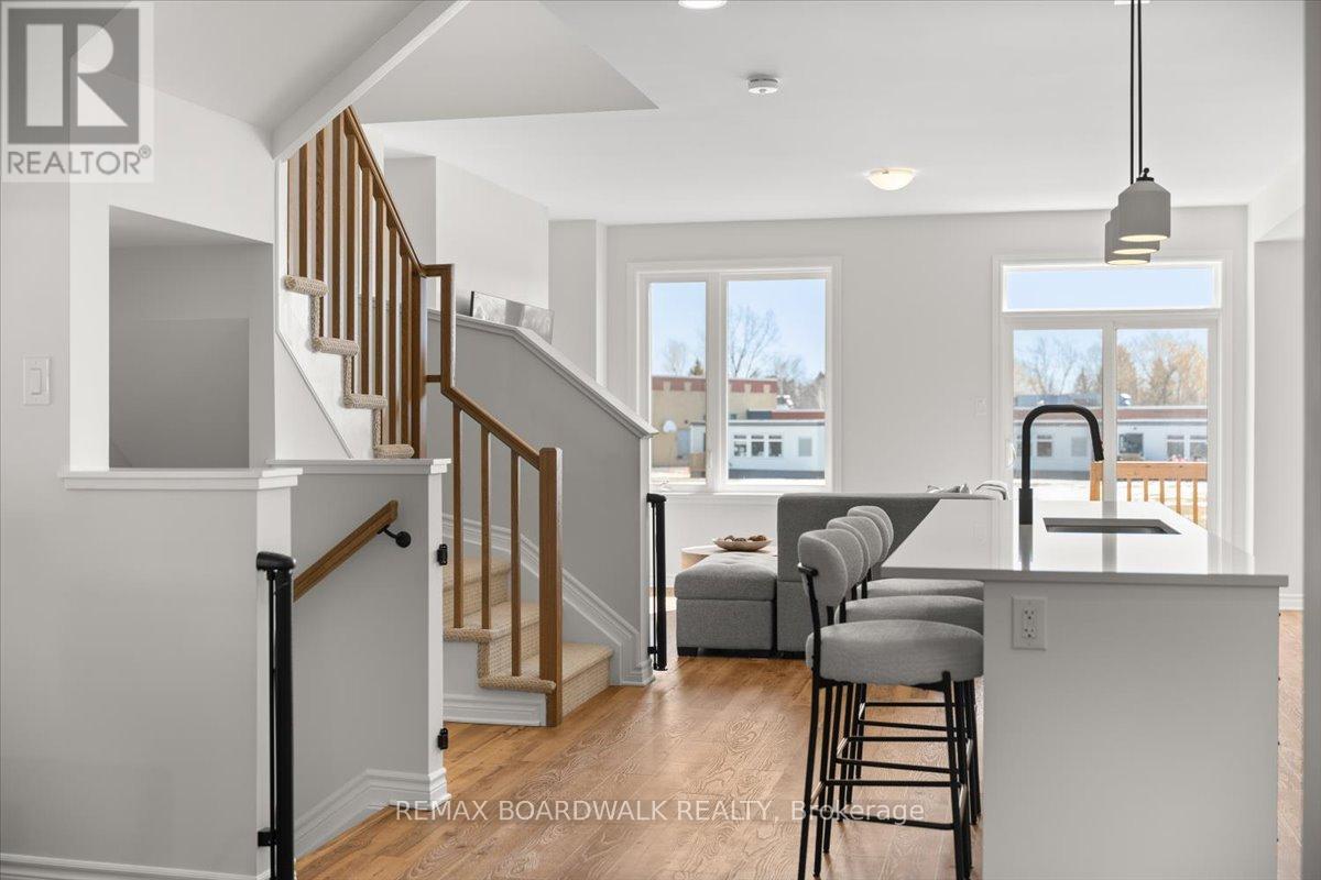 Modern, move-in ready 2025 EQ-built end unit townhome offering over 2,200 sqft of beautifully finished living space with 4 bedrooms and 2.5 bathrooms. Striking exterior blends brick, stone, and vertical siding for added architectural appeal. Deep driveway leads to an inviting covered front porch with glass panelled door and transom window. Spacious sunken foyer with built-in bench adds everyday convenience. The chef-inspired kitchen features an oversized quartz centre island, stylish subway tile backsplash, stainless steel appliances, sleek black hardware, large recessed sink, and a family-sized walk-in pantry. The adjacent dining area offers modern lighting and double windows, while the bright living room showcases wide plank flooring, an electric fireplace, and patio doors leading to the backyard. A powder room and interior access to the garage complete the main level. Upstairs, you'll find four generously sized bedrooms. The primary suite offers a large walk-in closet and a 4-piece ensuite with double undermount sinks and a glass-enclosed shower. Plush berber carpet and flat ceilings run throughout the second level. Convenient laundry room with linen storage and a second full bath with large vanity and tiled flooring upstairs. The fully finished basement provides a versatile and bright rec room, ample storage space, and a bathroom rough-in for future potential. Spacious backyard with no rear neighbours, offering added privacy. Located near parks and schools in the growing community of Embrun, this home offers space, comfort, and value - without compromise. (id:64974)