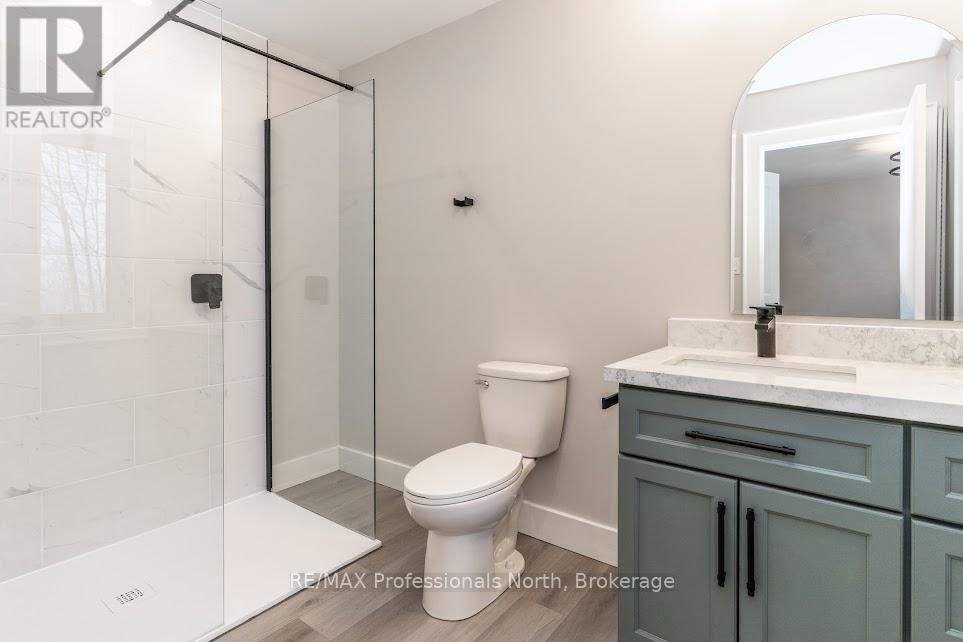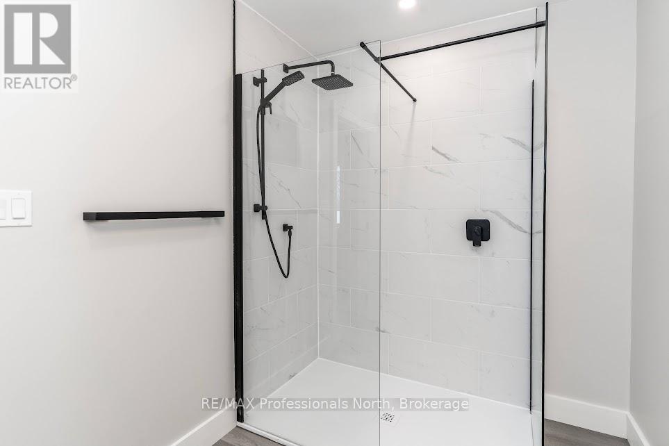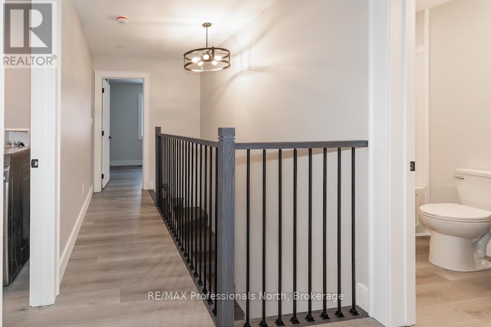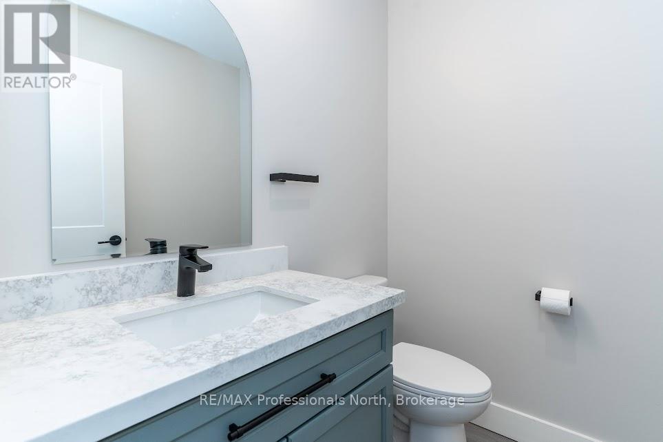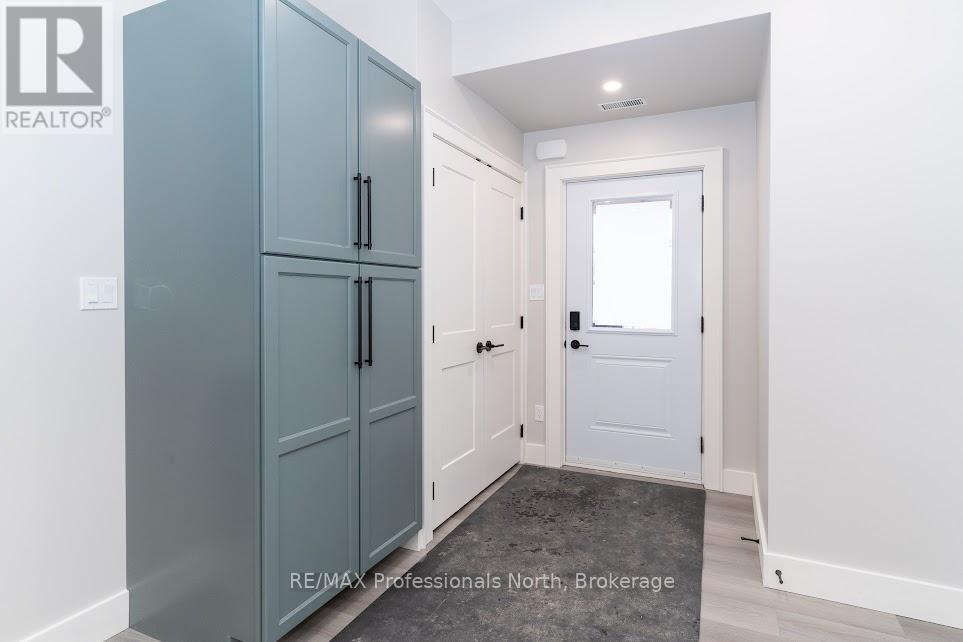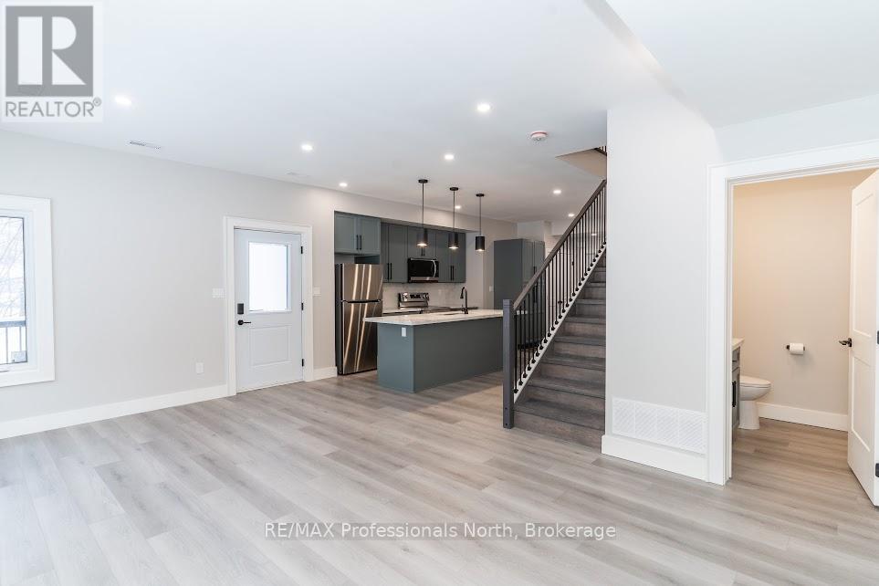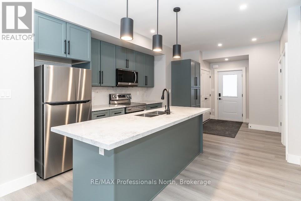 Brand New 3-Bedroom Unit in Gravenhurst 4-Plex - Single Car Garage - Immediate Occupancy! Discover modern Muskoka living in this pristine, never-lived-in 3-bedroom, 2.5-bathroom unit within a brand-new 4-plex building in beautiful Gravenhurst! This spacious, contemporary unit feels like your own home, featuring private entry and high-end finishes throughout: Bright, open-concept main floor with a spacious gourmet kitchen boasting a large centre island, stylish teal cabinetry, sleek black hardware, durable quartz countertops, and a full suite of stainless steel appliances. Generous living and dining areas flow seamlessly together, accented by high ceilings, recessed lighting, modern pendant lights, and large windows offering serene views of wooded surroundings and winter snowscapes. Convenient main-floor 2-piece powder room for guests - ideal for everyday convenience and entertaining. Three bedrooms on the upper level, including a primary suite with abundant natural light, and a private ensuite bathroom for added luxury. Two stylish full bathrooms (upper level): the primary ensuite with sleek glass-enclosed shower plus a second full bath featuring a relaxing tub, arched LED-lit mirrors, floating vanities in soft teal tones, and crisp tile. Convenient upper-level laundry room equipped with front-load washer and dryer, plus a bright window for natural light. Single-car attached garage (dedicated to the unit) plus additional driveway parking. High-end finishes throughout: durable grey-toned laminate flooring, energy-efficient new construction, keyless smart entry, and thoughtful details for comfort and style. This premium unit in a 4-plex blends contemporary elegance with Muskoka charm - centrally located in Gravenhurst with easy access to downtown shops, restaurants, trails, lakes, and outdoor adventures. (id:64974)