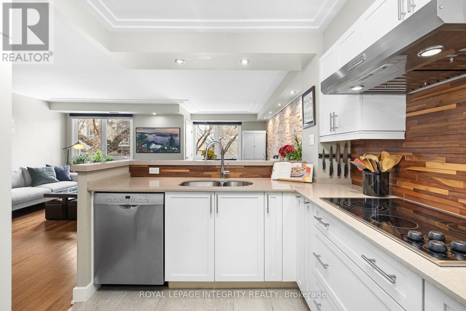 Welcome to the best of downtown Ottawa living-where style, space, and location come together in a rare 2-storey walk-up condo that truly feels like a home. Perfect for young professionals or couples looking to be in the heart of it all, this condo offers unbeatable access to Parliament Hill, the Rideau Centre, Elgin Street, and some of the city's best restaurants, cafés, and nightlife.Tucked into the highly sought-after Golden Triangle, just steps from the Rideau Canal, you get the balance of vibrant city energy and a quiet, tree-lined setting to come home to. With approximately 1,300 sq. ft. of thoughtfully designed space, this 2-bedroom, 3-bathroom condo has been fully redesigned with clean, modern finishes that elevate everyday living.The main level is bright, open, and built for entertaining; whether you're hosting friends before heading out downtown or enjoying a quiet night in. The kitchen is a standout, featuring quartz countertops, a wall oven with microwave, stainless steel appliances, and a generous pantry. Custom built-ins, engineered flooring, and sleek design details carry throughout, giving the space a polished, cohesive feel.Upstairs, you'll find a layout that separates living and rest perfectly. A spacious second-floor lounge offers the ideal spot to unwind, while a skylit den creates a flexible work-from-home setup-something today's buyers truly value. The primary suite is designed as a private retreat, complete with a spa-inspired ensuite and oversized shower. A second bedroom and full bathroom make it ideal for guests, roommates, or future flexibility.With in-suite laundry, heated underground parking, a storage locker, and a well-managed building, this is a low-maintenance lifestyle without compromise. If you've been waiting for a downtown condo that offers space, function, and a true neighbourhood feel-this is it. (id:64974)