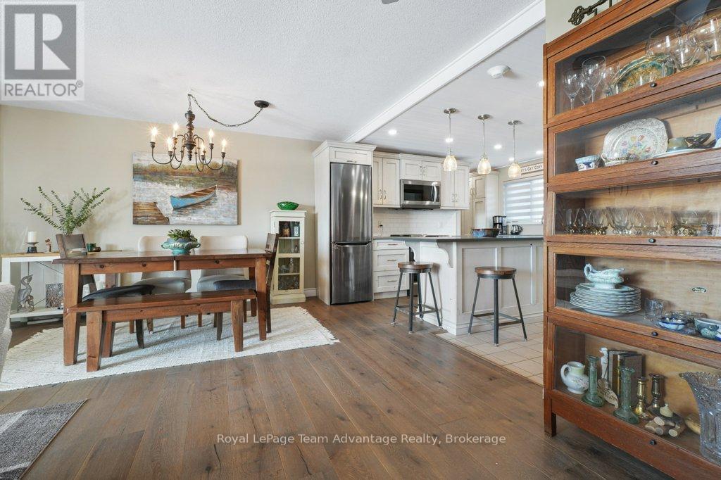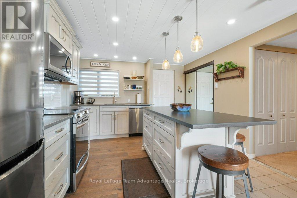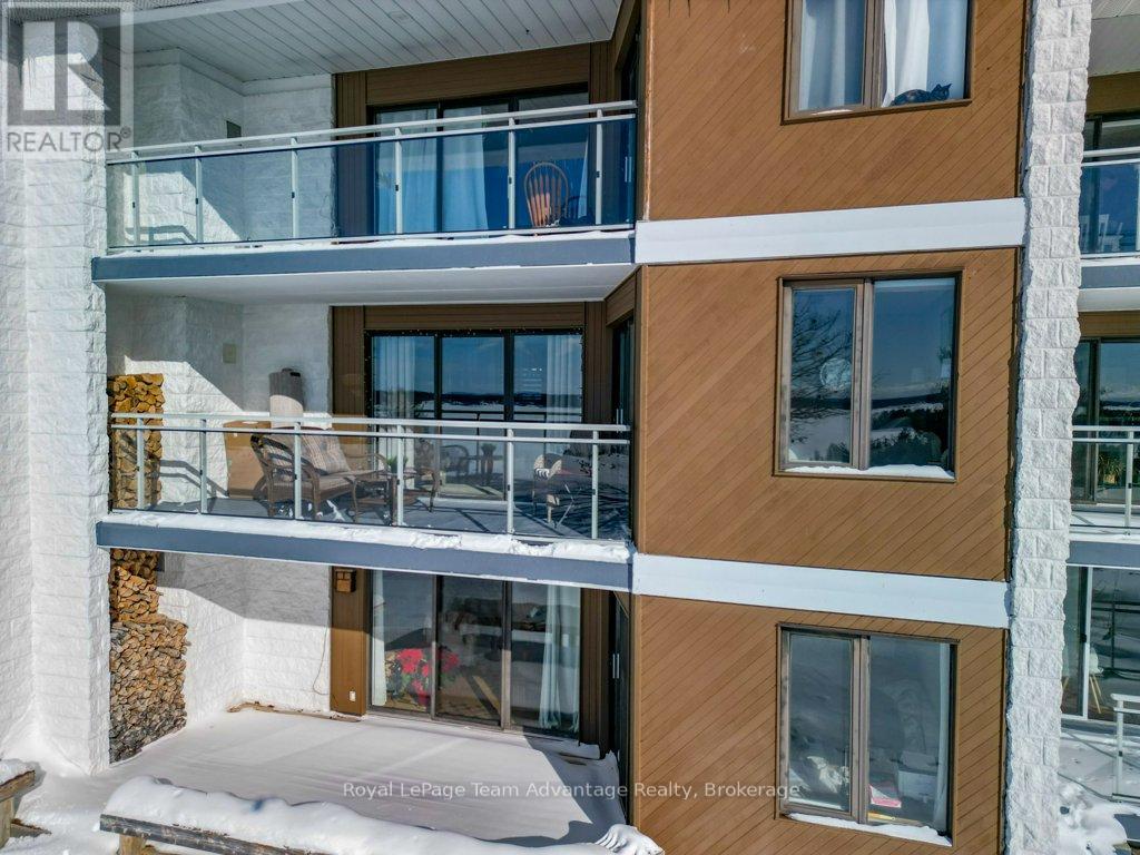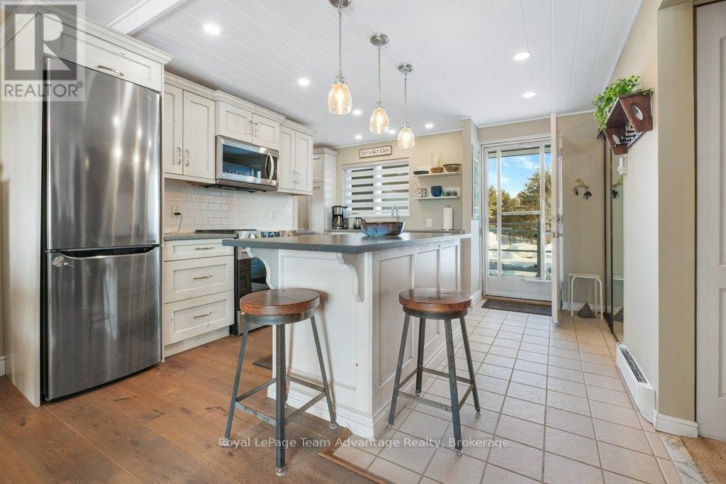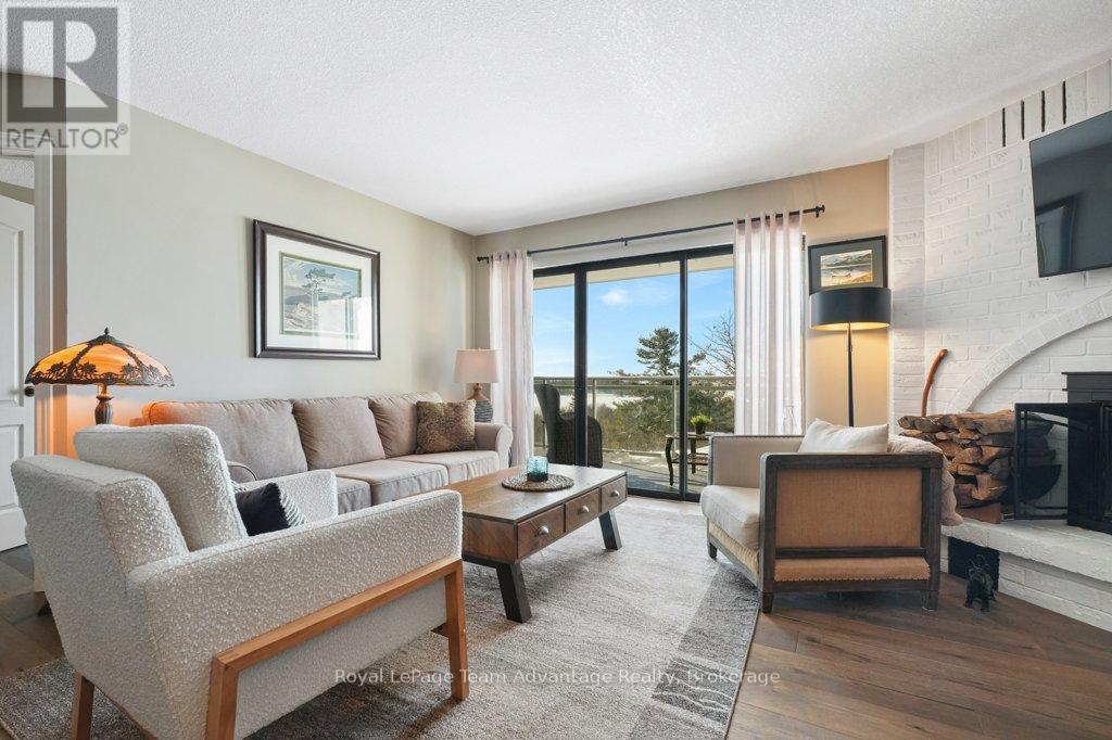 Updated condo living with sunsets included. This beautifully updated condo at Bayhill is all about the space, the flow and the view. The open-concept kitchen is the main event - fully renovated with an island, pantry and extra cabinetry, opening seamlessly to the living area with a wood burning fireplace. The living room flows directly to the balcony, fully taking advantage of the stunning west-facing views across Georgian Bay, delivering unforgettable sunsets and a constant connection to the outdoors. With 2 bedrooms and 2 bathrooms for comfort and convenience, the layout works just as well for everyday living as it does for hosting. Enjoy the ease of a single-car garage plus one outdoor parking space. Located in a quiet 21-unit complex, surrounded by well-kept gardens and steps to the fitness trail with Nobel Beach and the Town of Parry Sound nearby for shopping, dining and amenities. Low-maintenance living. Big views. A rare and peaceful setting.(taxes, condo fees and hydro month avg $1313) affordable (id:64974)