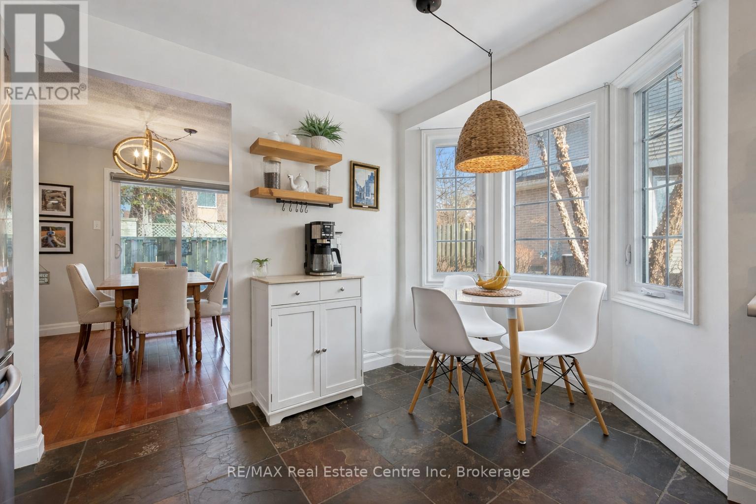 Beautifully renovated 2-bdrm, 3.5-bath townhome offering stylish move-in-ready living in highly desirable community W/in-ground pool & tennis/pickleball courts! From the moment you step inside you'll notice warmth of hardwood flooring & thoughtful updates throughout. Eat-in kitchen W/sleek grey cabinetry, tile backsplash, S/S appliances & lots of counter space. Rustic wood display shelving adds character while the bay window nook creates perfect spot to enjoy morning coffee surrounded by natural light. Formal dining area offers elegant setting for entertaining W/stunning light fixture & sliding doors that lead to private backyard creating seamless indoor-outdoor flow. Living room W/gas fireplace & custom B/I shelving-perfect place to unwind at the end of the day. Convenient 2pc bath completes this level. Upstairs the primary bdrm offers hardwood, large windows & W/I closet. A versatile nook within the room offers perfect space for a dressing area, home office or reading corner. Ensuite is tastefully updated W/stylish vanity. 2nd bdrm offers custom B/Is & is complemented by 4pc bath W/large vanity & shower/tub. Finished lower level offers incredible versatility W/rec area highlighted by stylish shiplap fireplace & rustic wood mantel creating a warm elevated feel. Updated bathroom W/modern vanity & dedicated laundry room complete this level. Meticulously maintained & thoughtfully updated: furnace 2019, water softener 2021 & HWT 2023. Step outside to private fully fenced backyard W/large deck, mature trees & lots of space to relax & entertain. Residents of this well-maintained complex enjoy access to inground pool, tennis & pickleball courts & visitor parking-all the benefits without the maintenance. Nearby walking path connects to Royal Recreational Trail offering riverside pathways leading all the way to Guelph Lake. Short walk to Riverside Park, nearby golf course & amenities. Complete W/attached 1-car garage this is truly a turnkey opportunity-just move in & enjoy (id:64974)