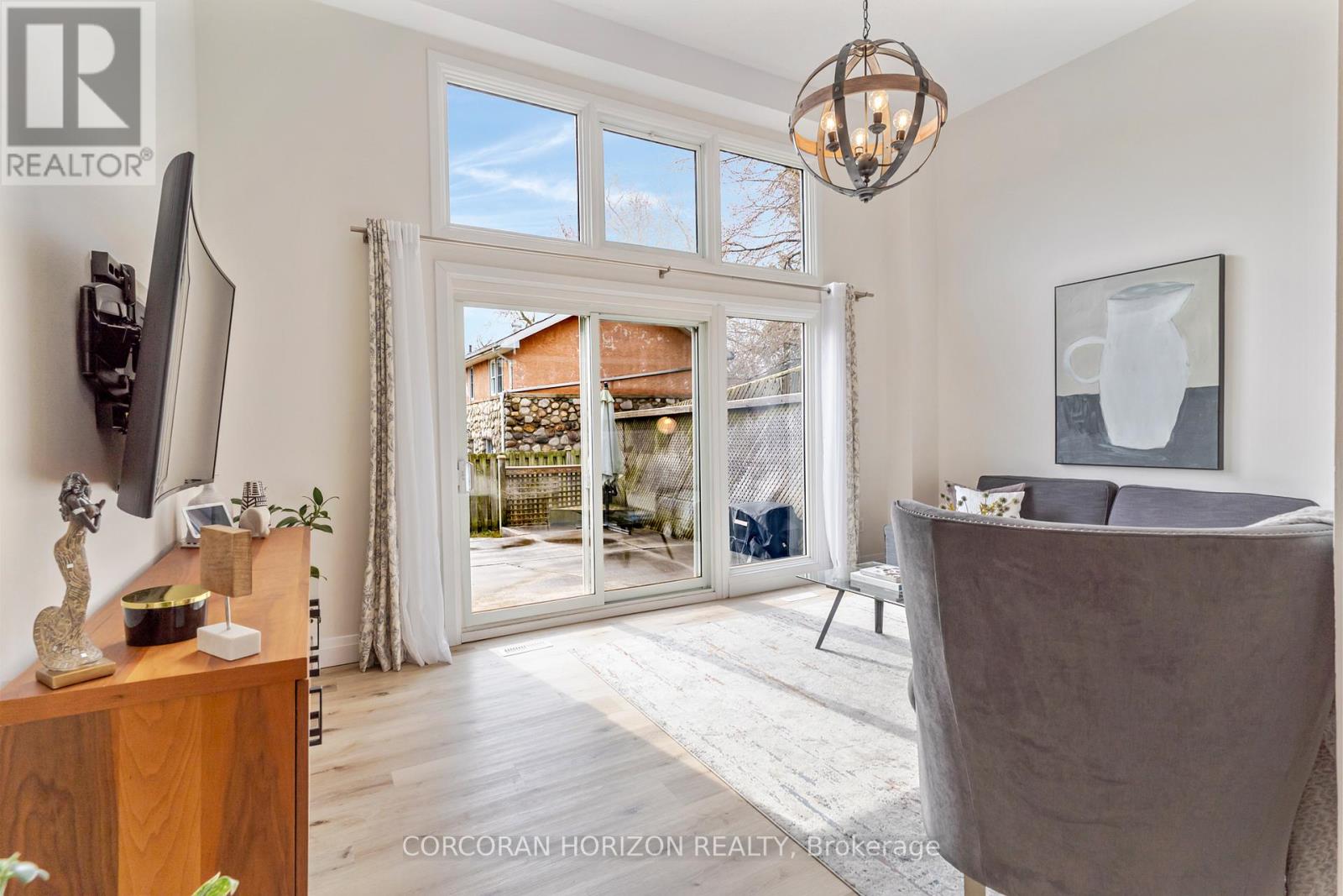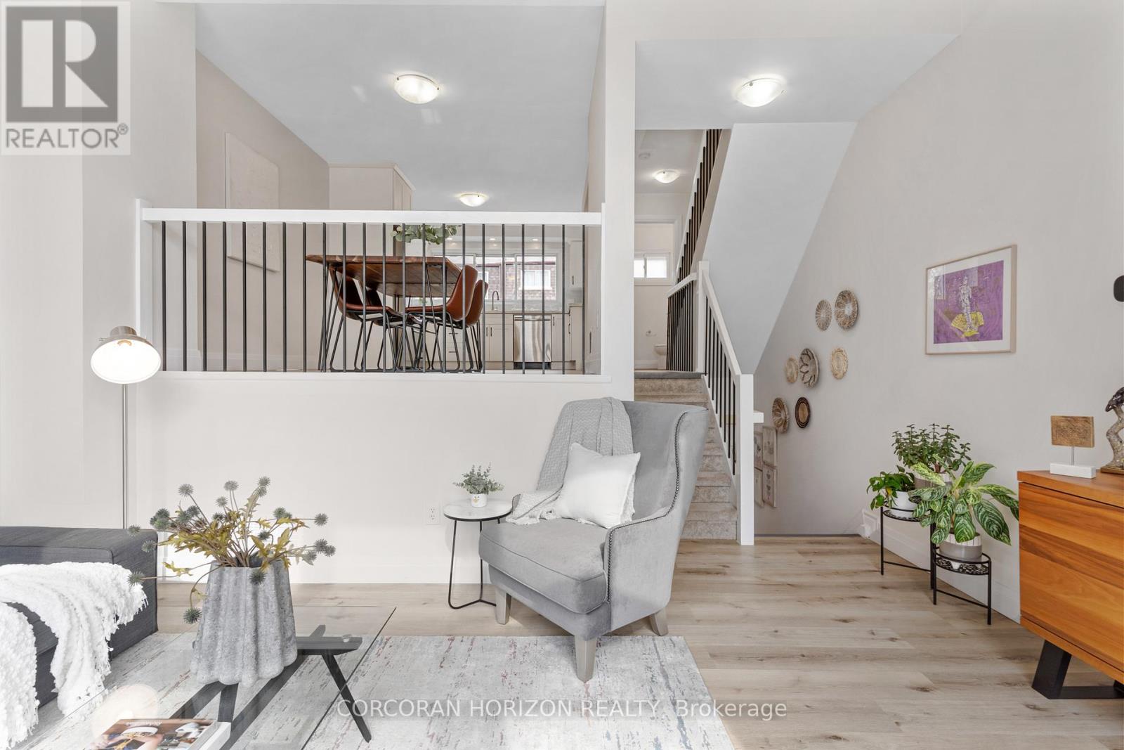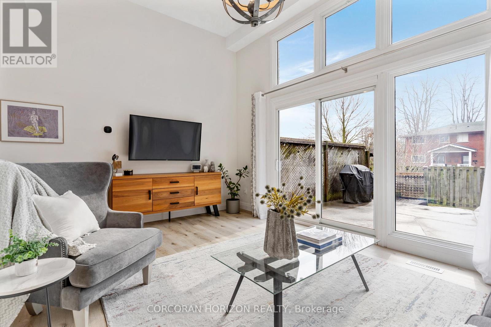 Welcome to 230 Blair Road, a beautifully updated townhome in the sought-after West Galt community offering a low-maintenance lifestyle.From the moment you enter, you're greeted by a bright, open-concept layout with updated vinyl flooring throughout and elegant black wrought iron railings that create a cohesive, modern feel. The impressive 20-foot cathedral ceilings in the living room, combined with floor-to-ceiling windows and sliding glass doors, fill the space with natural light and create a warm, inviting atmosphere.Step outside to your private patio, perfect for relaxing or entertaining, with convenient access to the shared green space.The second level overlooks the living area and features a dedicated dining space and a stylish, updated kitchen complete with stainless steel appliances, quartz countertops, solid wood cabinetry with soft-close drawers, crown moulding, and a contemporary backsplash.A convenient 2-piece powder room completes the main level.Upstairs, you'll find three spacious bedrooms and a well-appointed 4-piece bathroom, offering comfortable living for families, guests, or a home office setup.The partially finished basement provides additional living potential, along with a laundry area and ample storage space.Ideally located close to parks, scenic river trails, public transit, Highway 401 access, schools, and Conestoga College, this home offers both convenience and lifestyle in a well-established neighbourhood. (id:64974)