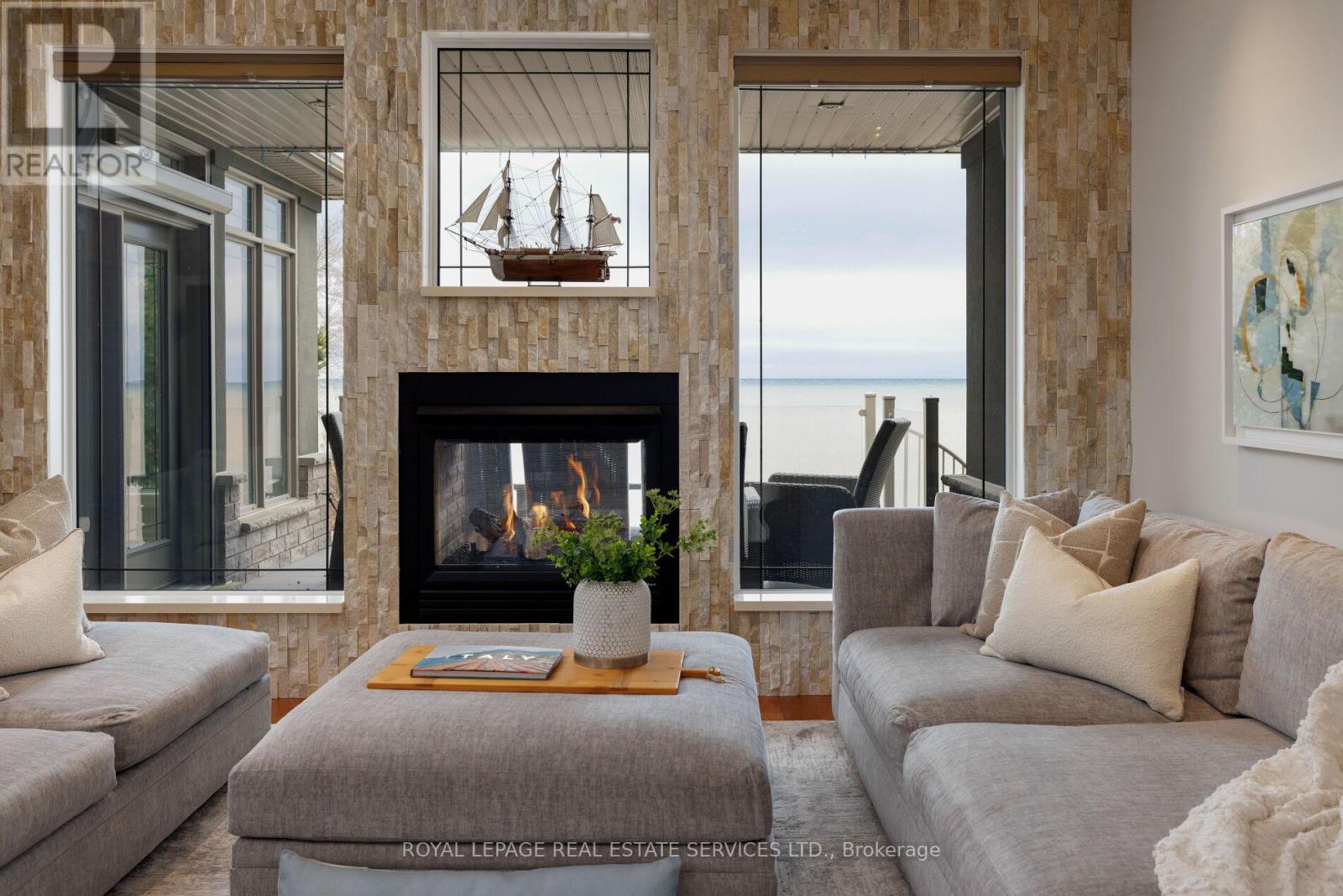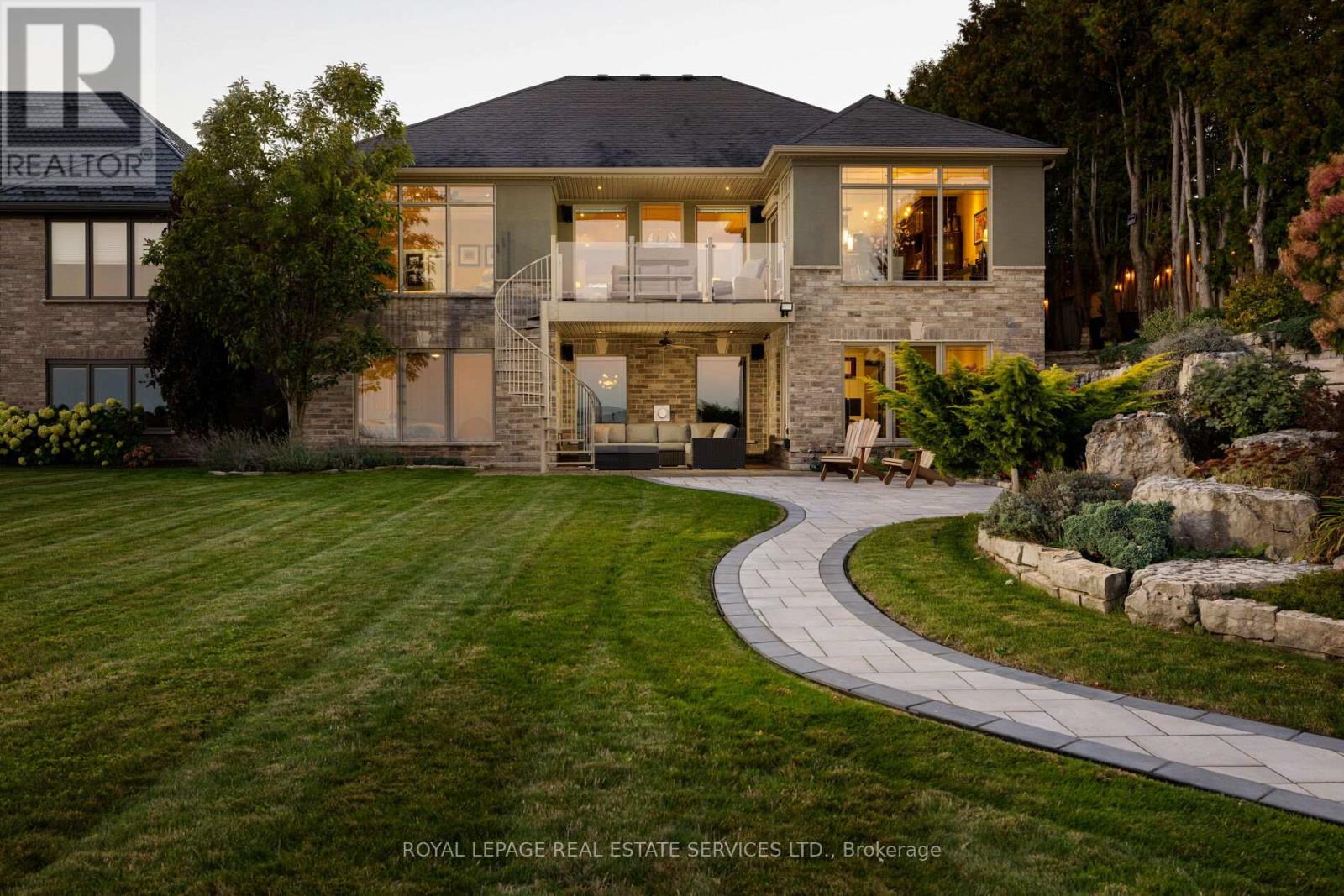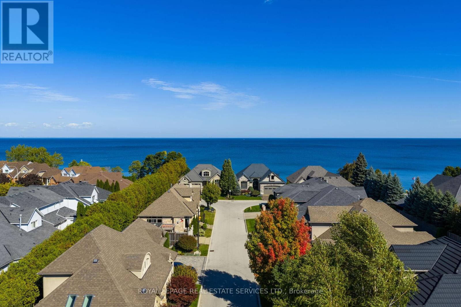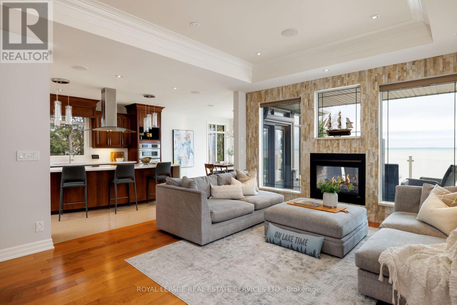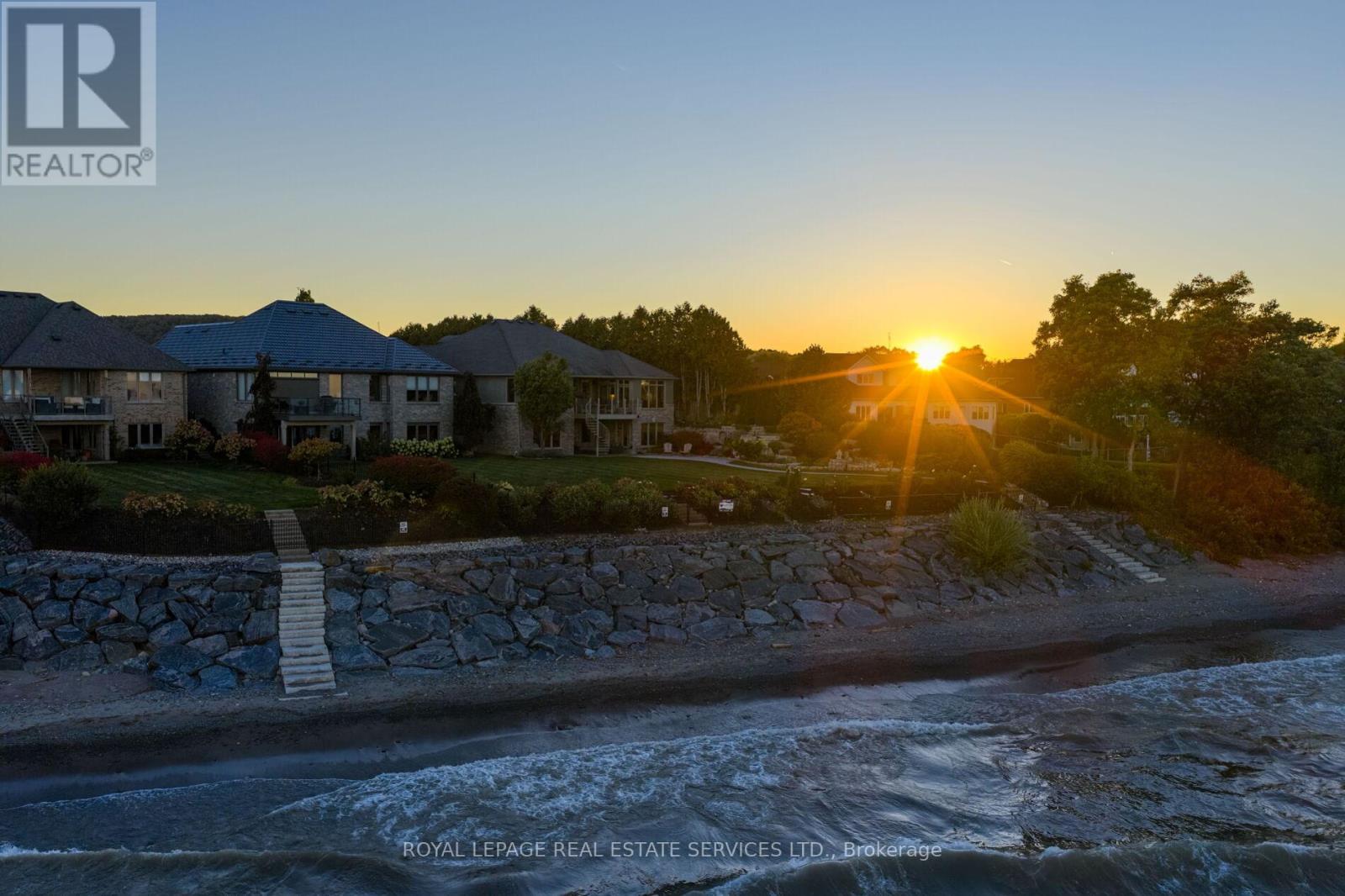 An upscale lakeside lifestyle awaits in Lakeland Landing, an exclusive detached bungalow condominium community in Grimsby on the shores of Lake Ontario. Siding onto a grove of trees, this stunning 4-bedroom residence with a beautifully finished walkout basement is one of only four estates with direct beach access. Enjoy nearby waterfront parks, the Grimsby Waterfront Trail, Forty Mile Creek Park, Foran's Marina, the shops and restaurants of Grimsby on the Lake, and wineries and fine dining minutes away with easy QEW access at the gateway to Ontario's Wine Country. Outstanding curb appeal and magnificent professional landscaping with a cobblestone driveway accommodating 6 cars, extensive use of armour stone, and the backyard is a private lakeside retreat with two terraces designed to capture sweeping water views. Custom-built by DeHaan Homes, the home showcases exceptional craftsmanship with 9 and 10-ft ceilings, engineered hardwood floors, custom millwork, designer lighting, and expansive windows capturing breathtaking lake views. The open-concept main level features functional, elegant living spaces, a great room with a quartzite feature wall, 2-sided gas fireplace and exceptional lake views, a chef's kitchen with upgraded quartz counters, 10' waterfall island with a breakfast bar, and premium appliances, and a dining area with a walkout to a covered terrace with a fireplace, frameless glass railings and a custom wrought iron staircase to the lower terrace. The primary suite offers lake views and a luxurious 5-piece ensuite. The walkout lower level includes a renovated family room with a fireplace, a second kitchen with Thermador appliances, a home theatre, two bedrooms, a 4-piece bath and terrace access. Recent upgrades (2022-2025) include renovated living spaces, updated kitchens, EV charger rough-in, electrical upgrades, and security window film. (id:64974)