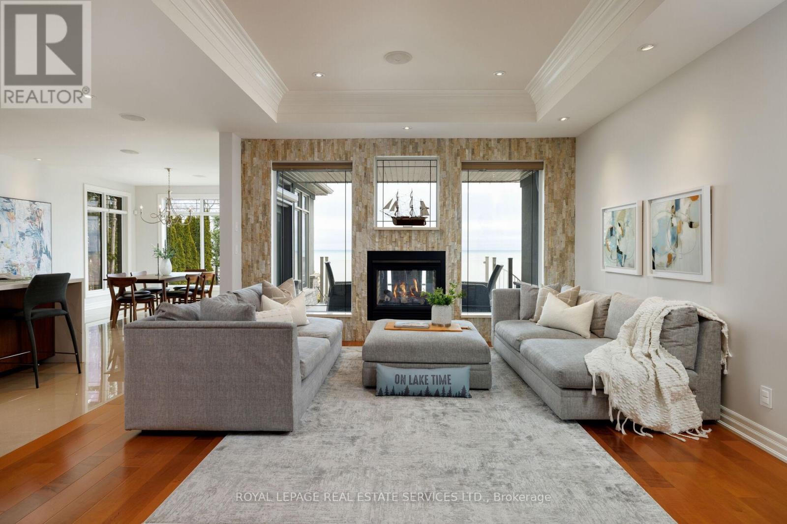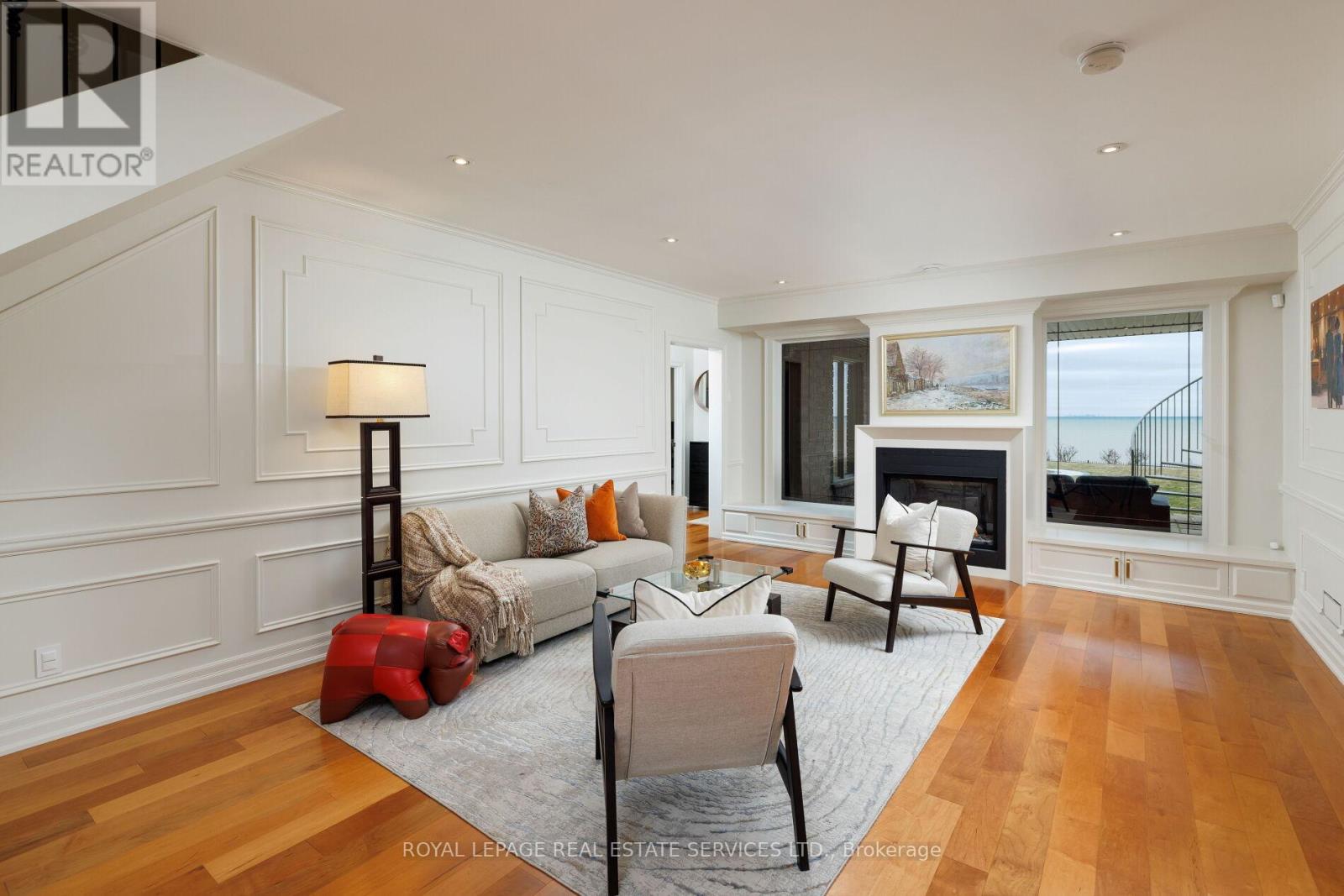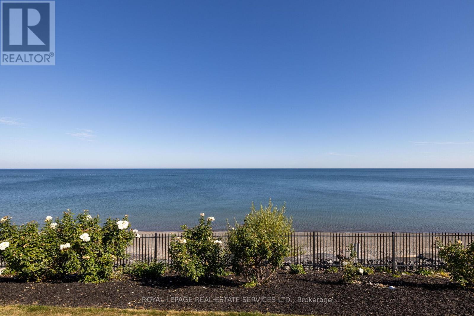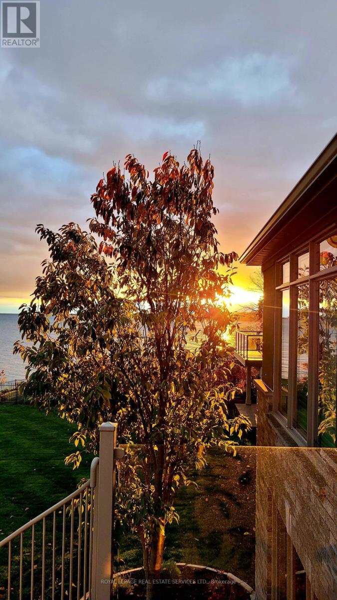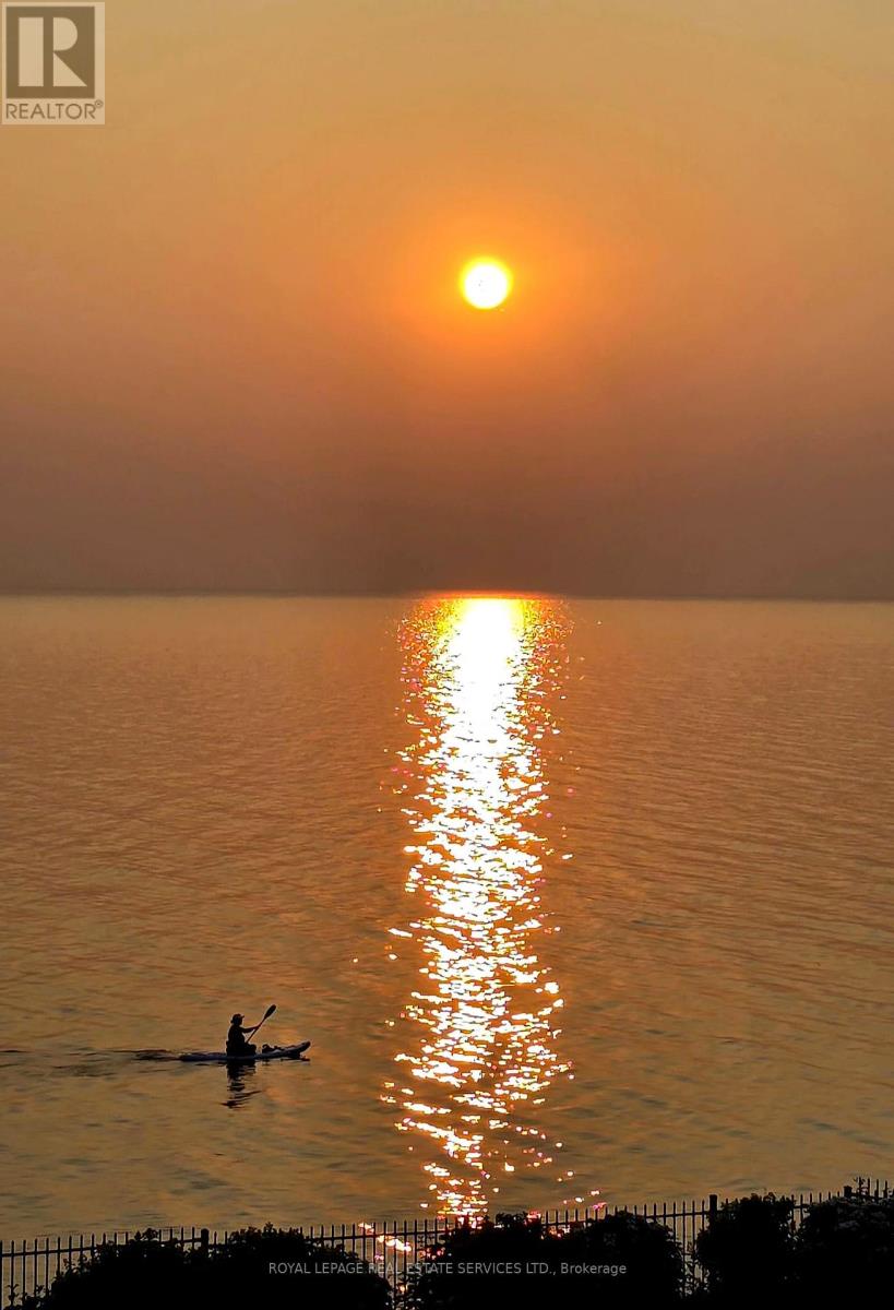 An upscale lakeside lifestyle awaits in Lakeland Landing, an exclusive detached bungalow condominium community in Grimsby on the shores of Lake Ontario. Siding onto a grove of trees, this stunning 4-bedroom residence with a beautifully finished walkout basement is one of only four estates with direct beach access. Enjoy nearby waterfront parks, the Grimsby Waterfront Trail, Forty Mile Creek Park, Foran's Marina, the shops and restaurants of Grimsby on the Lake, and wineries and fine dining minutes away with easy QEW access at the gateway to Ontario's Wine Country. Outstanding curb appeal and magnificent professional landscaping with a cobblestone driveway accommodating 6 cars, extensive use of armour stone, and the backyard is a private lakeside retreat with two terraces designed to capture sweeping water views. Custom-built by DeHaan Homes, the home showcases exceptional craftsmanship with 9 and 10-ft ceilings, engineered hardwood floors, custom millwork, designer lighting, and expansive windows capturing breathtaking lake views. The open-concept main level features functional, elegant living spaces, a great room with a quartzite feature wall, 2-sided gas fireplace and exceptional lake views, a chef's kitchen with upgraded quartz counters, 10' waterfall island with a breakfast bar, and premium appliances, and a dining area with a walkout to a covered terrace with a fireplace, frameless glass railings and a custom wrought iron staircase to the lower terrace. The primary suite offers lake views and a luxurious 5-piece ensuite. The walkout lower level includes a renovated family room with a fireplace, a second kitchen with Thermador appliances, a home theatre, two bedrooms, a 4-piece bath and terrace access. Recent upgrades (2022-2025) include renovated living spaces, updated kitchens, EV charger rough-in, electrical upgrades, and security window film. (id:64974)