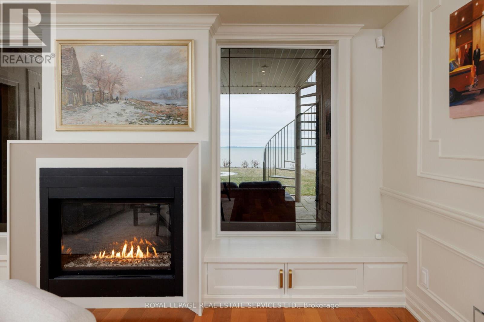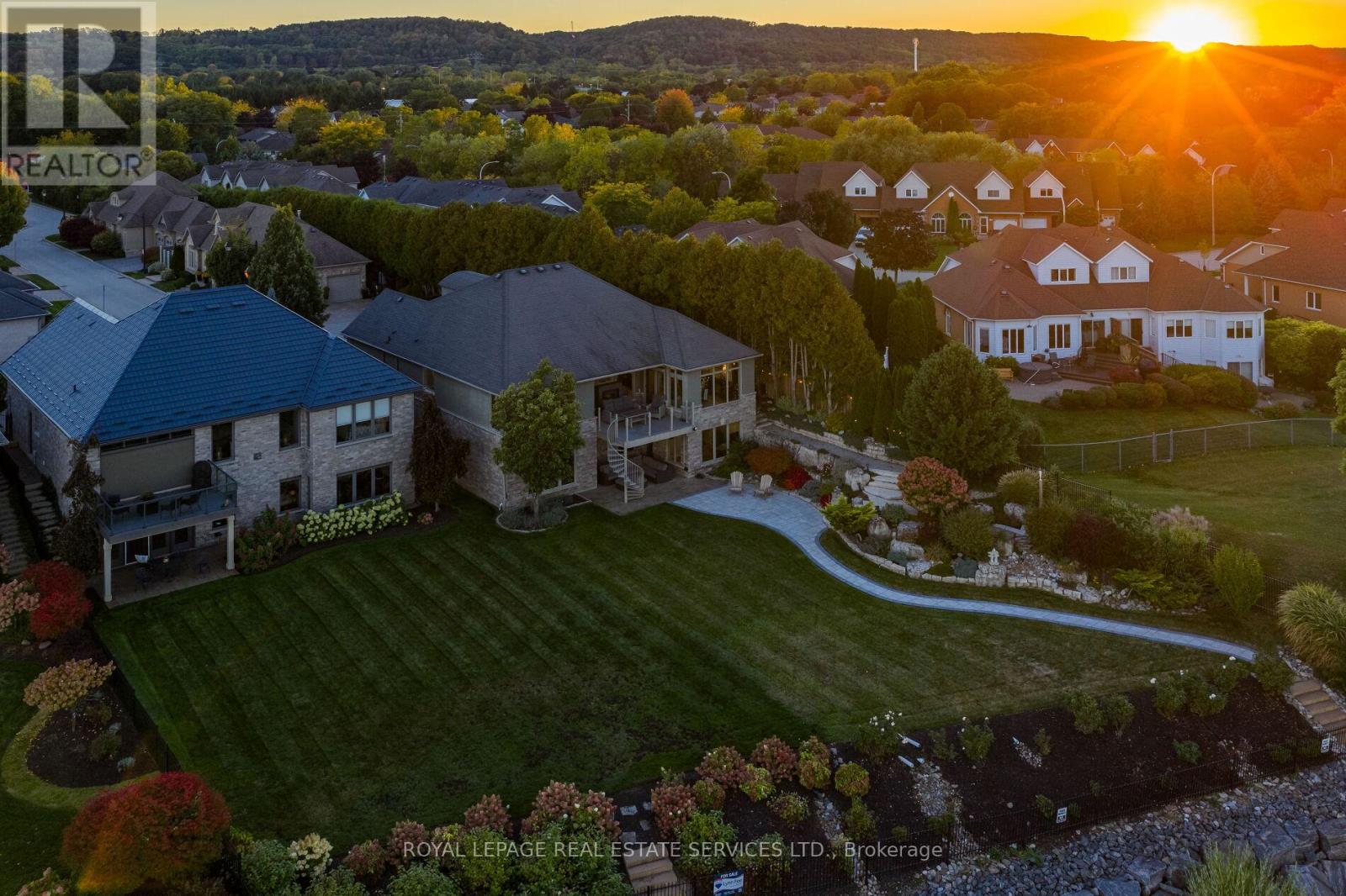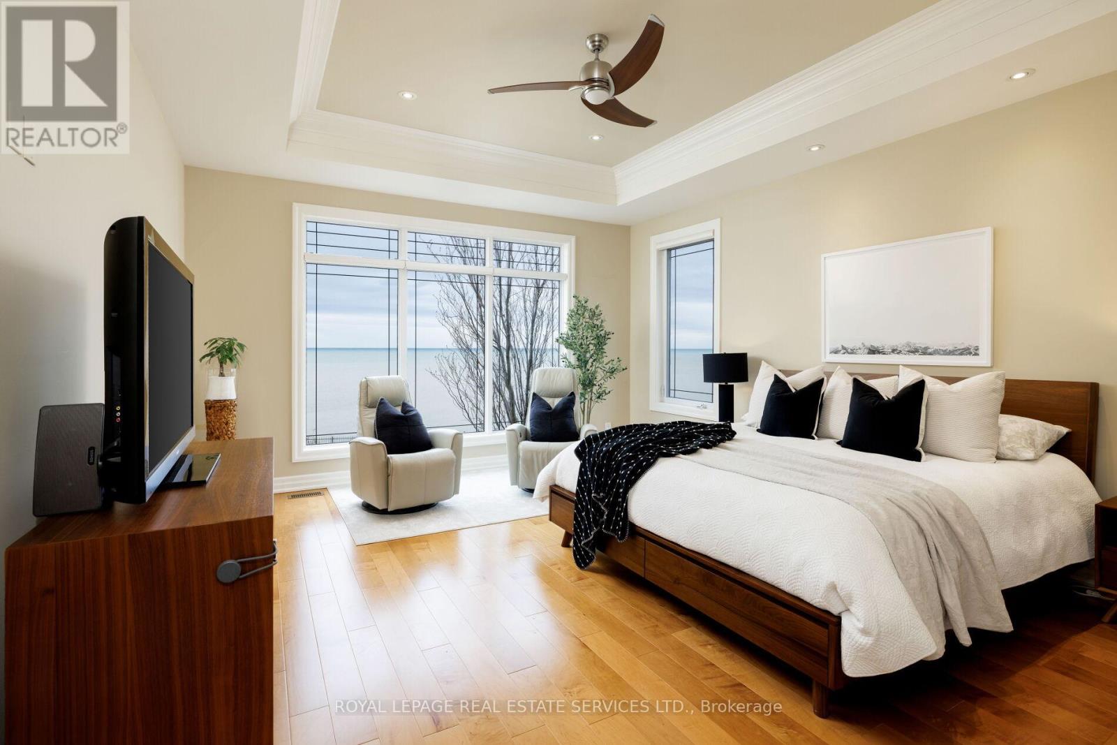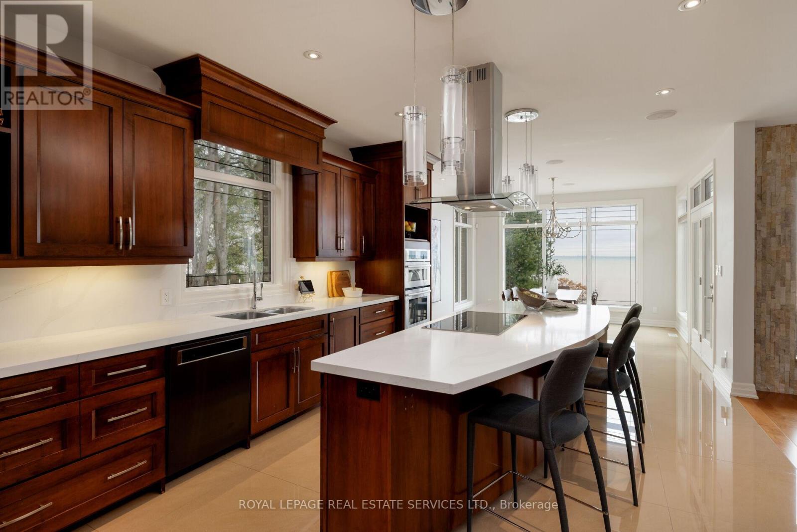 An upscale lakeside lifestyle awaits in Lakeland Landing, an exclusive detached bungalow condominium community in Grimsby on the shores of Lake Ontario. Siding onto a grove of trees, this stunning 4-bedroom residence with a beautifully finished walkout basement is one of only four estates with direct beach access. Enjoy nearby waterfront parks, the Grimsby Waterfront Trail, Forty Mile Creek Park, Foran's Marina, the shops and restaurants of Grimsby on the Lake, and wineries and fine dining minutes away with easy QEW access at the gateway to Ontario's Wine Country. Outstanding curb appeal and magnificent professional landscaping with a cobblestone driveway accommodating 6 cars, extensive use of armour stone, and the backyard is a private lakeside retreat with two terraces designed to capture sweeping water views. Custom-built by DeHaan Homes, the home showcases exceptional craftsmanship with 9 and 10-ft ceilings, engineered hardwood floors, custom millwork, designer lighting, and expansive windows capturing breathtaking lake views. The open-concept main level features functional, elegant living spaces, a great room with a quartzite feature wall, 2-sided gas fireplace and exceptional lake views, a chef's kitchen with upgraded quartz counters, 10' waterfall island with a breakfast bar, and premium appliances, and a dining area with a walkout to a covered terrace with a fireplace, frameless glass railings and a custom wrought iron staircase to the lower terrace. The primary suite offers lake views and a luxurious 5-piece ensuite. The walkout lower level includes a renovated family room with a fireplace, a second kitchen with Thermador appliances, a home theatre, two bedrooms, a 4-piece bath and terrace access. Recent upgrades (2022-2025) include renovated living spaces, updated kitchens, EV charger rough-in, electrical upgrades, and security window film. (id:64974)