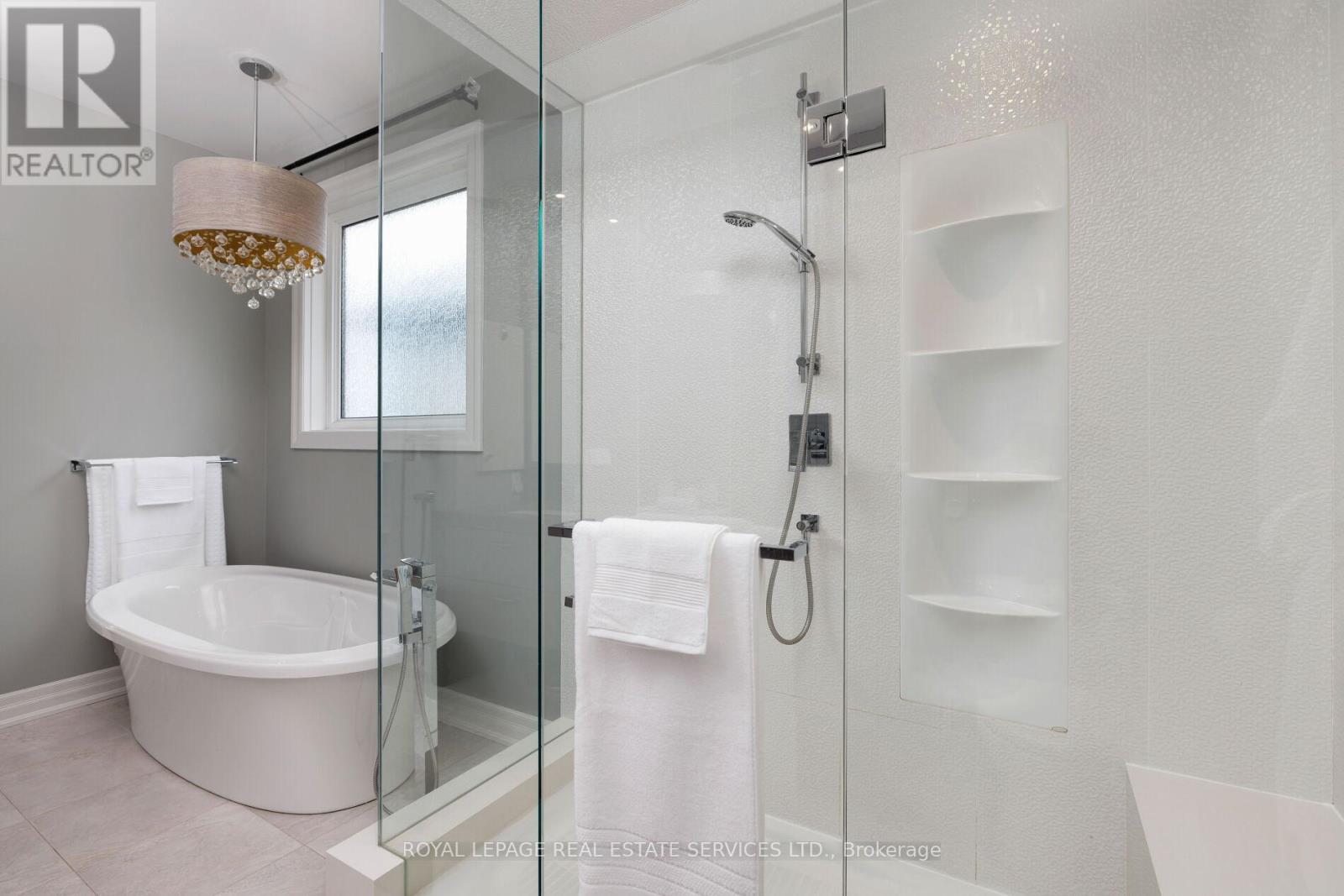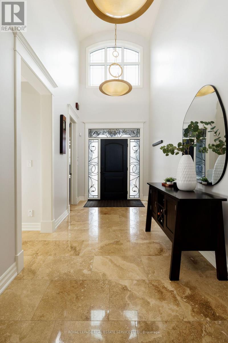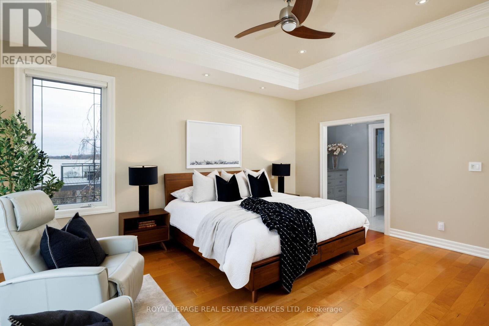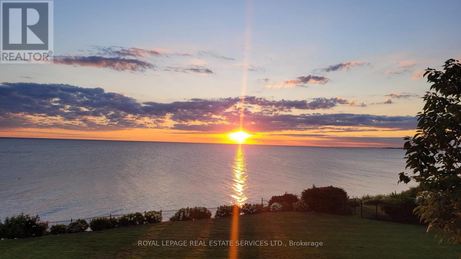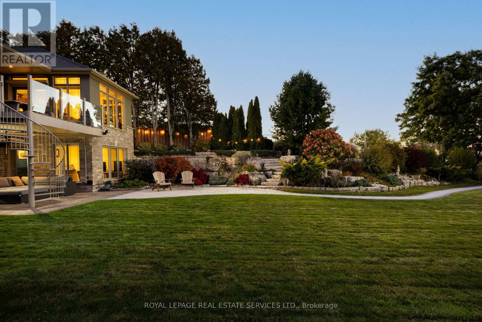 An upscale lakeside lifestyle awaits in Lakeland Landing, an exclusive detached bungalow condominium community in Grimsby on the shores of Lake Ontario. Siding onto a grove of trees, this stunning 4-bedroom residence with a beautifully finished walkout basement is one of only four estates with direct beach access. Enjoy nearby waterfront parks, the Grimsby Waterfront Trail, Forty Mile Creek Park, Foran's Marina, the shops and restaurants of Grimsby on the Lake, and wineries and fine dining minutes away with easy QEW access at the gateway to Ontario's Wine Country. Outstanding curb appeal and magnificent professional landscaping with a cobblestone driveway accommodating 6 cars, extensive use of armour stone, and the backyard is a private lakeside retreat with two terraces designed to capture sweeping water views. Custom-built by DeHaan Homes, the home showcases exceptional craftsmanship with 9 and 10-ft ceilings, engineered hardwood floors, custom millwork, designer lighting, and expansive windows capturing breathtaking lake views. The open-concept main level features functional, elegant living spaces, a great room with a quartzite feature wall, 2-sided gas fireplace and exceptional lake views, a chef's kitchen with upgraded quartz counters, 10' waterfall island with a breakfast bar, and premium appliances, and a dining area with a walkout to a covered terrace with a fireplace, frameless glass railings and a custom wrought iron staircase to the lower terrace. The primary suite offers lake views and a luxurious 5-piece ensuite. The walkout lower level includes a renovated family room with a fireplace, a second kitchen with Thermador appliances, a home theatre, two bedrooms, a 4-piece bath and terrace access. Recent upgrades (2022-2025) include renovated living spaces, updated kitchens, EV charger rough-in, electrical upgrades, and security window film. (id:64974)