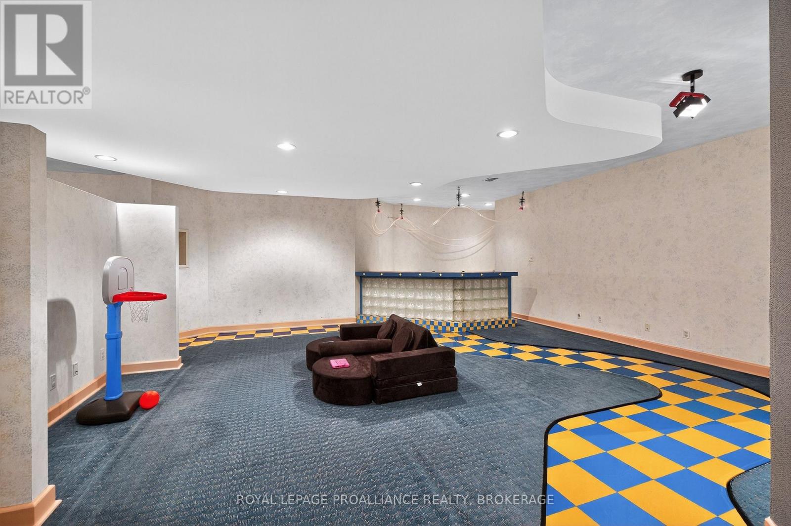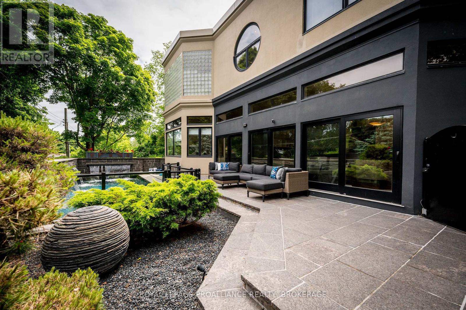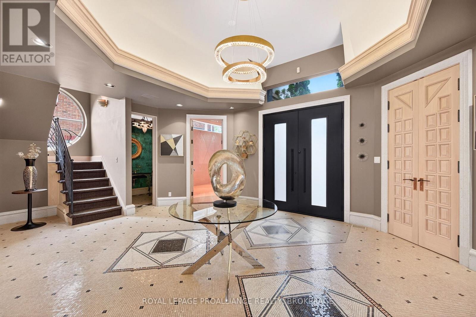 A rare blend of luxury, comfort, and family-focused design-this custom-built masterpiece in Kingston's Calvin Park has it all. Located on a quiet cul-de-sac just minutes from Lake Ontario's waterfront trails, this 4+1 bedroom, 6-bath home offers over 6,000 square feet of sophisticated living, tailor-made for modern families. The striking two-tone exterior is elevated by newly refreshed stucco (2024), while the interior showcases expert craftsmanship with rich custom mouldings, elegant panel work, and impeccable finishes. The 2-car garage has been fully drywalled and painted for a clean, polished look. On the lower level you will find flexibility meets function: it features a spacious bedroom, full bath, family room, wet bar, and a comfortable area for children to play-ideal for families who need adaptable space that grows with them. Upstairs, the primary suite is a true retreat with a walk-in closet and a luxurious ensuite featuring a professionally restored marble countertop (2024). Step outside into a private backyard oasis where an inground pool with cascading waterfalls is framed by stone walls and a new safety fence. A stone patio and backyard handrail create an ideal setting for outdoor entertaining and relaxed family time. This home has been extensively updated inside and out: new pool pump and irrigation controller (2024), outdoor AC unit (2023, with warranty), dual furnace heat exchanger replacements, and a new hot water tank (2024). Smart Nest thermostats and an upgraded security system add everyday ease and peace of mind. Close to Queen's University, KGH, and vibrant downtown Kingston, this home balances thoughtful luxury with family-first comfort-an exceptional space to grow, gather, and thrive. (id:64974)