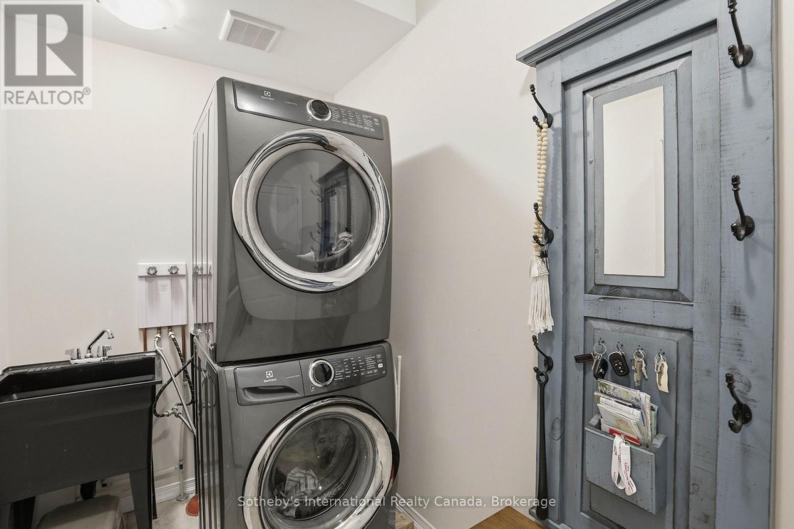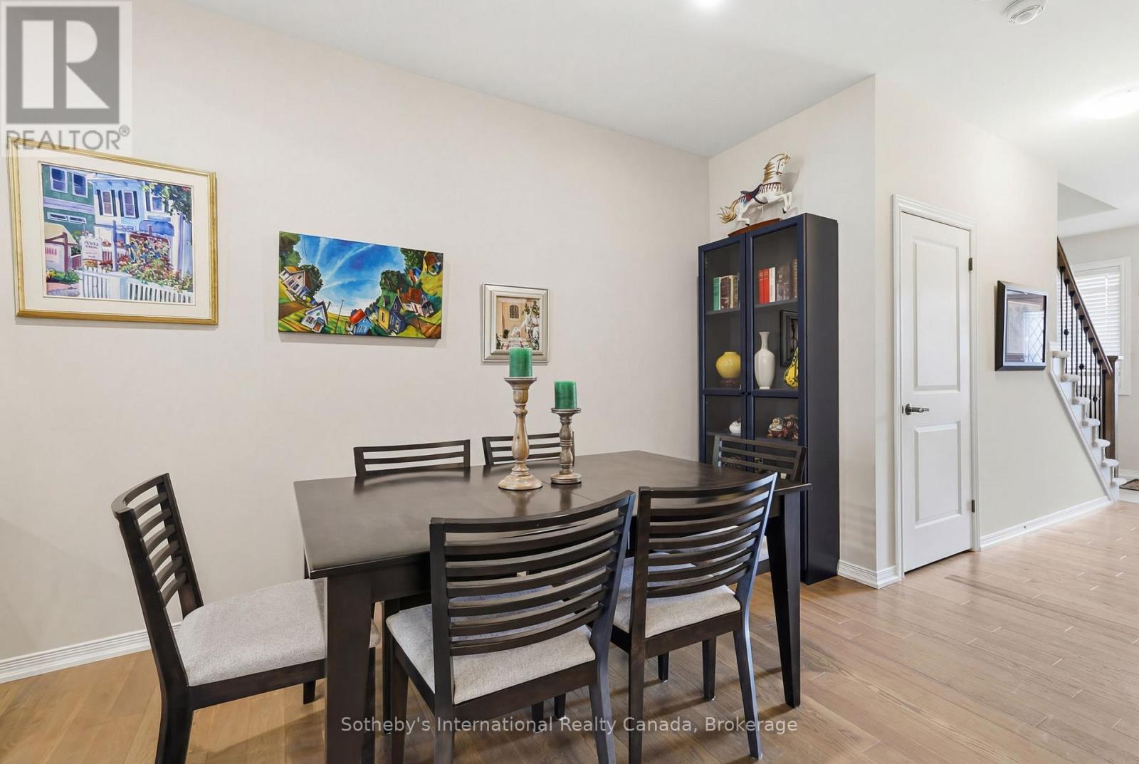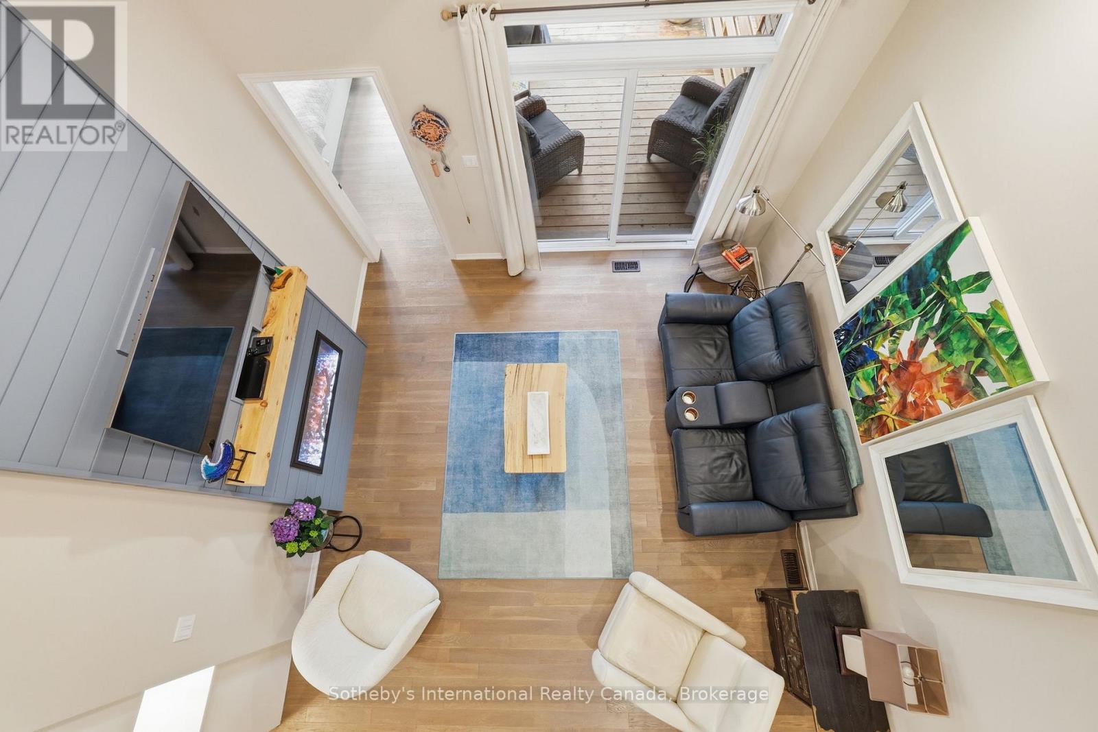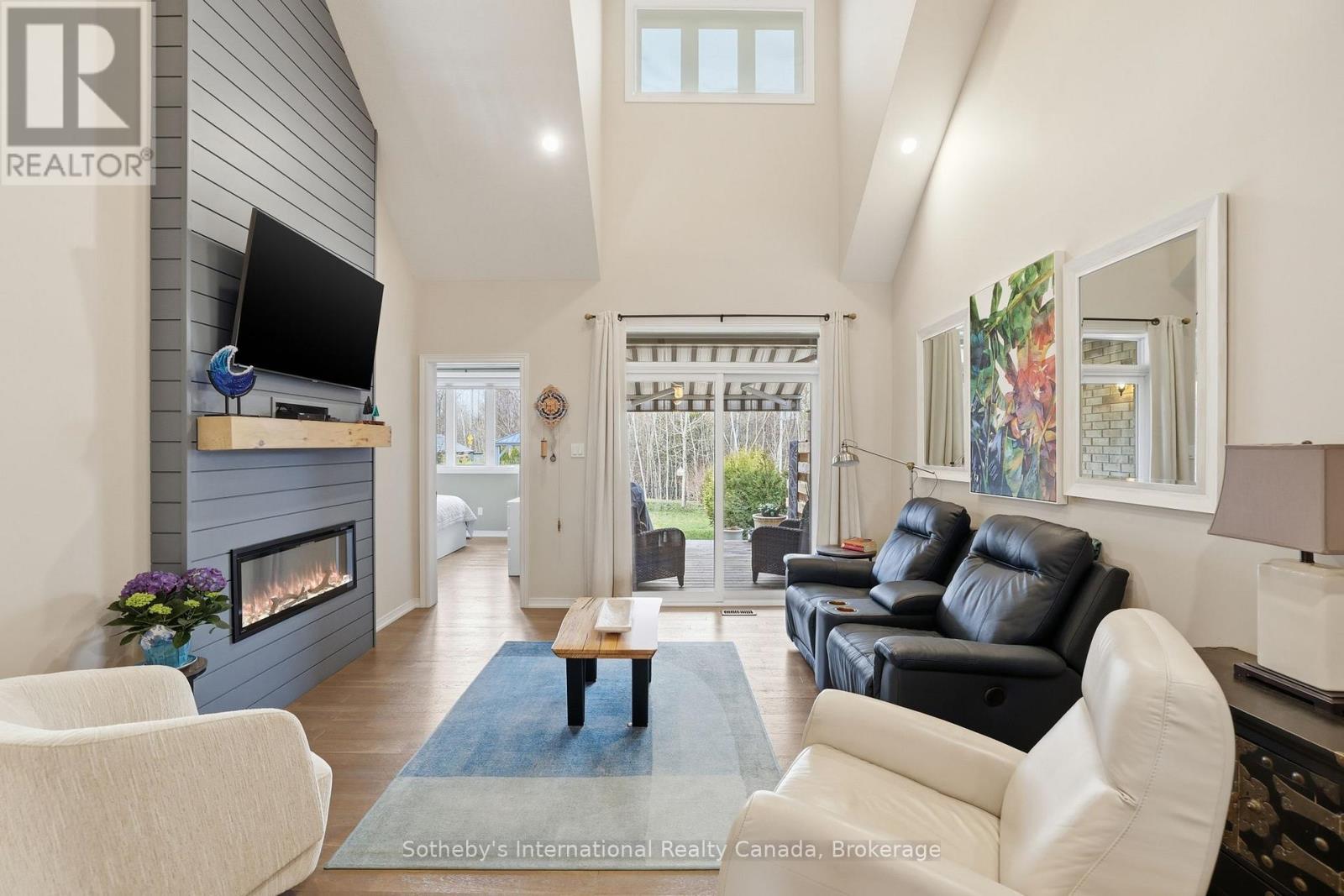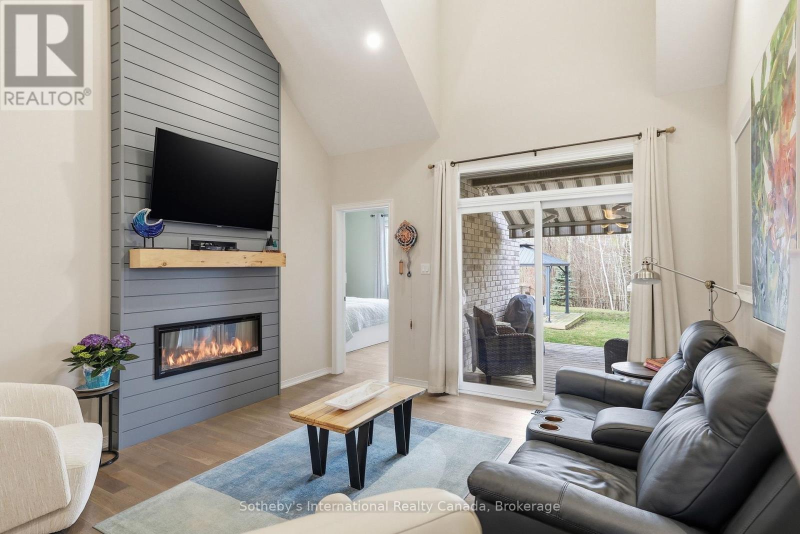 Stunning Sunvale bungaloft townhome set on an extra-deep premium lot backing onto the scenic railway trail and a serene forested area. Designed for effortless main-floor living, this home features a bright open-concept kitchen, dining, and living space highlighted by a soaring vaulted ceiling, oak hardwood flooring and a beautiful fireplace as the focal point.The living area seamlessly extends to a covered porch-perfect for relaxing or entertaining-while a separate deck overlooks the beautifully landscaped, expansive backyard. The main-floor primary suite offers a walk-in closet, a 4-piece ensuite, and peaceful views of the lush rear yard.Upstairs, a lofted space open to below creates an airy feel and is complemented by a dedicated office, two additional bedrooms, and a 4-piece bathroom-ideal for family or guests. Additional features include a 1.5 car garage with inside entry, parking for two vehicles in the driveway, main floor laundry and a full unfinished basement ready for your customization.Ideally located close to downtown Collingwood, local schools, and an abundance of trails, this home offers the perfect blend of comfort, style, and convenience. (id:64974)