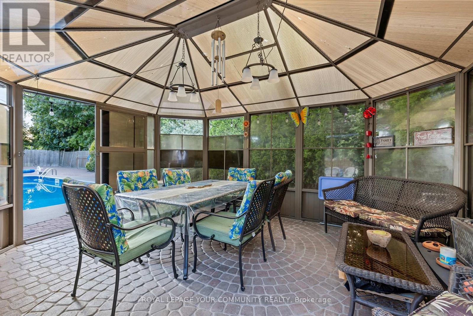 Discover luxury living on a quiet court in Hamilton's desirable West Mountain. This impressive home features a double-car garage, a 4-car driveway, and a huge premium pie-shaped lot stretching 171 feet deep. Spend summer days relaxing in your inground pool or entertain guests in the enclosed outdoor cabana with space for BBQs and evening drinks. At the rear of the property, there's ample room to park your boat, RV, or trailer. Inside, you're welcomed by an open front foyer showcasing a solid oak circular staircase. The beautiful kitchen offers abundant cabinetry, an eat-in dinette, and a vaulted ceiling, with a separate formal dining room perfect for family gatherings. The main floor family room (17' x 14') features a cozy fireplace, while a quiet living room sits off to the side for peaceful evenings. Upstairs you'll find 4 spacious bedrooms and 2.5 bathrooms. The stunning primary suite (17' x 14') includes a custom moon-shaped window flooding the room with natural light, a 4-piece ensuite with soaker tub and separate shower, and a walk-in closet. Three additional bedrooms and a computer room complete the upper level. Beautiful hardwood floors run throughout. Ideal for families, this kid-friendly location is close to schools, shopping, and parks. Minutes to the Linc and quick access to the 403 toward Toronto. (id:64974)