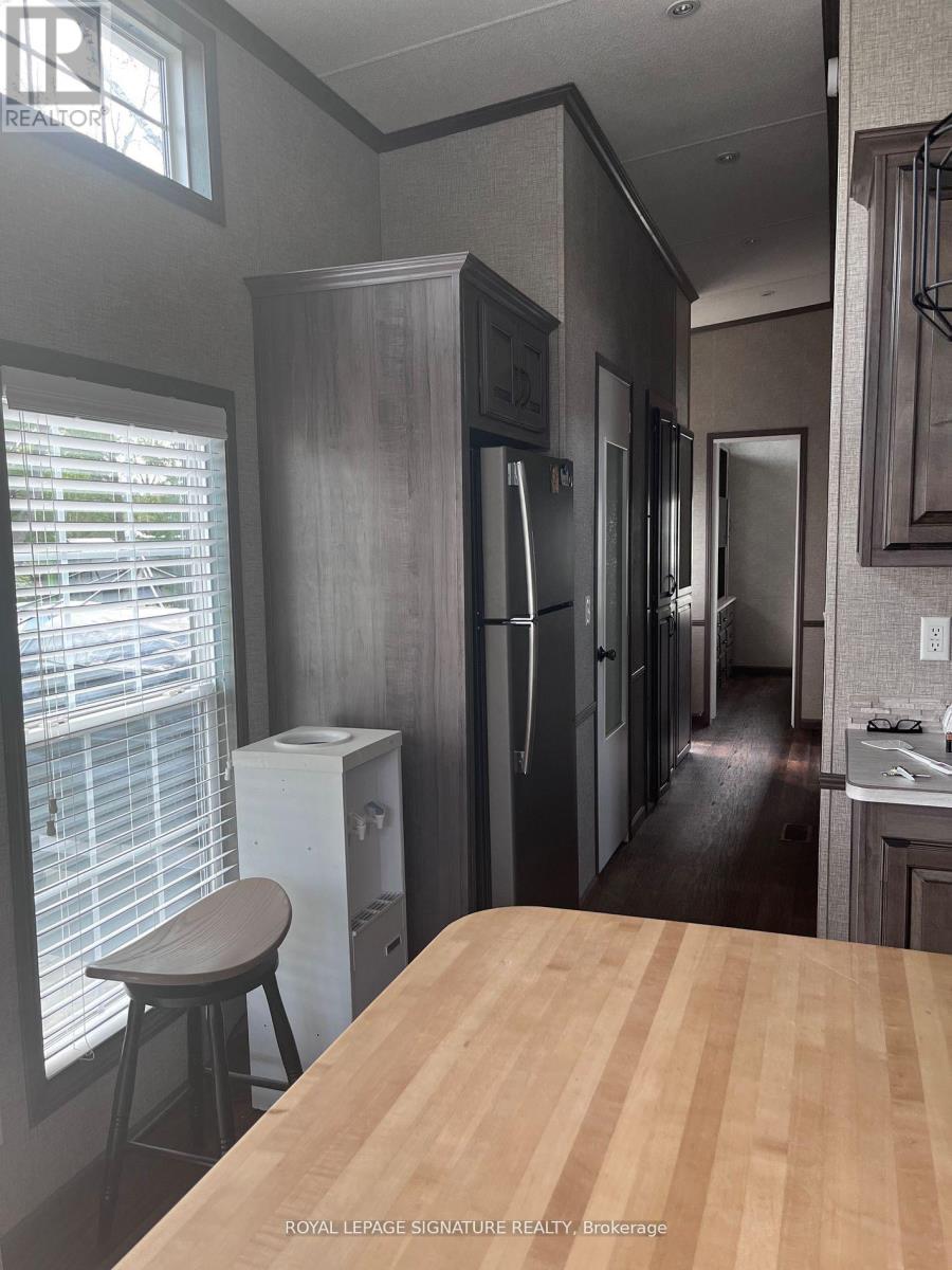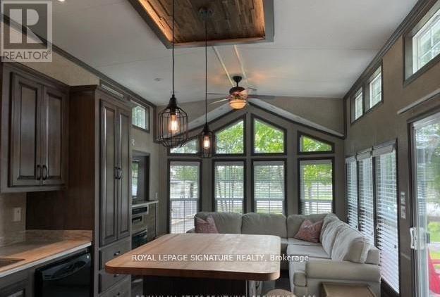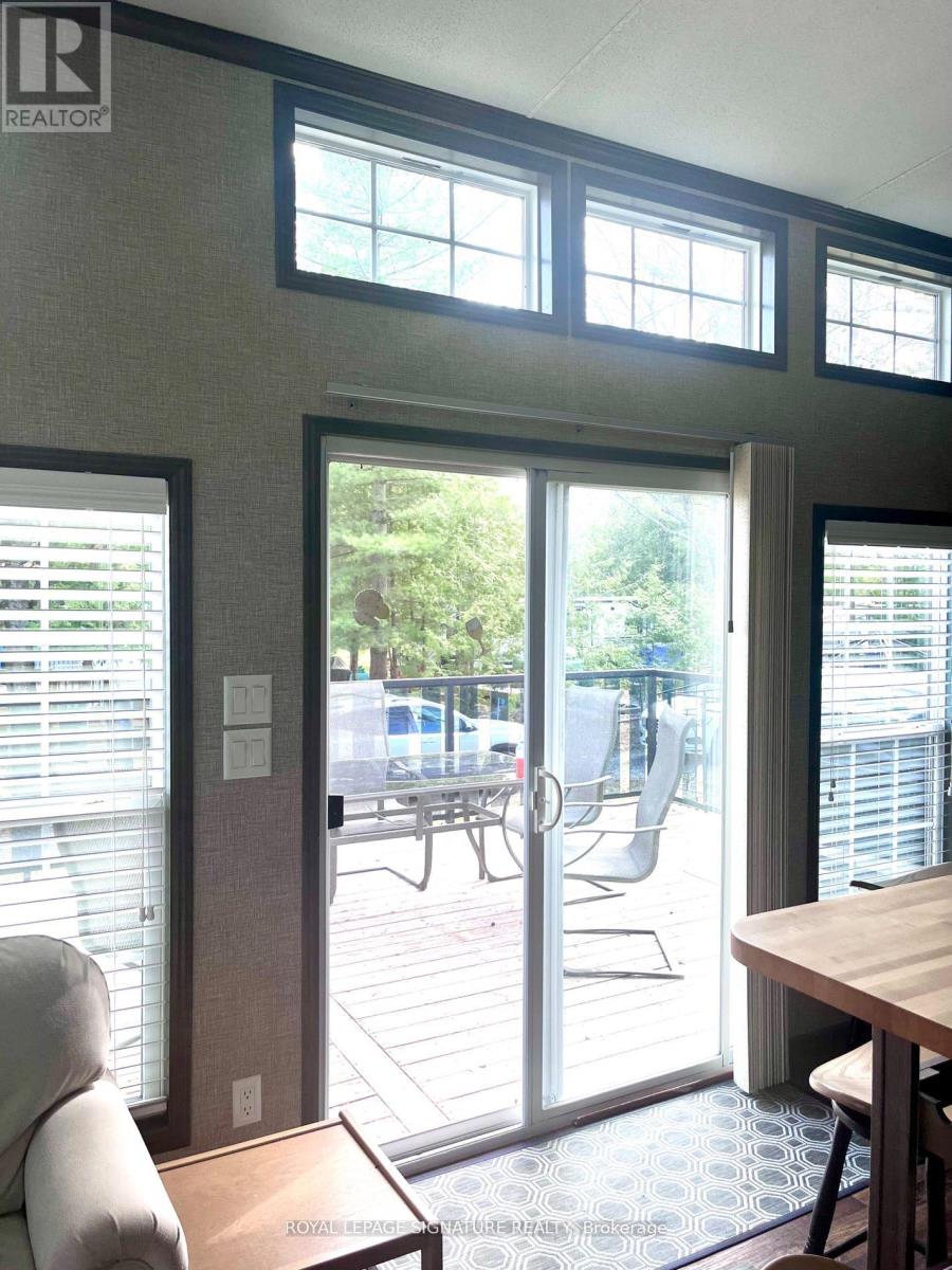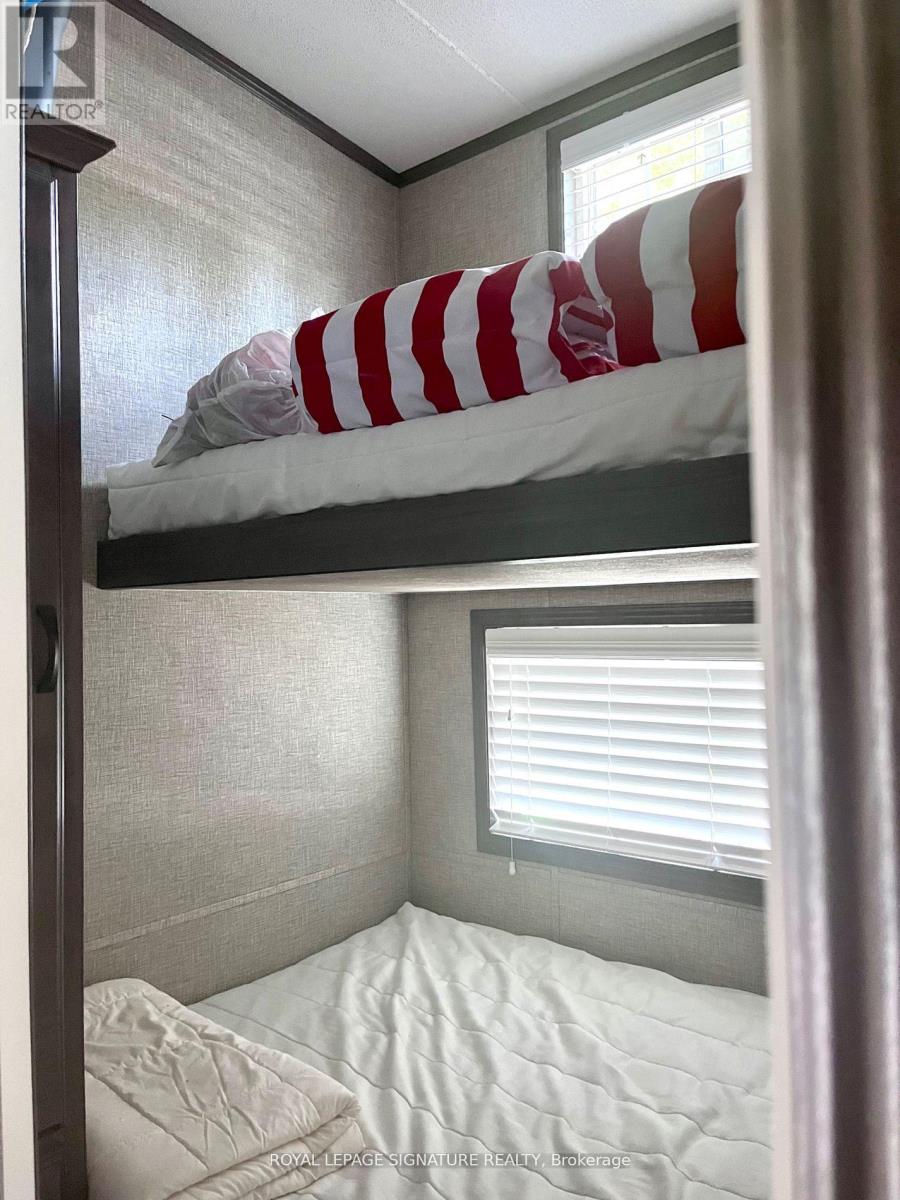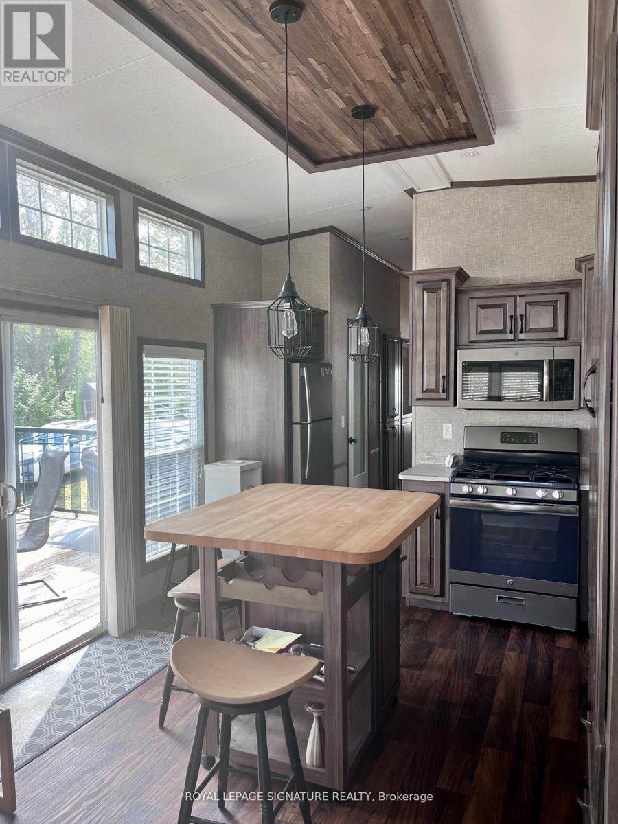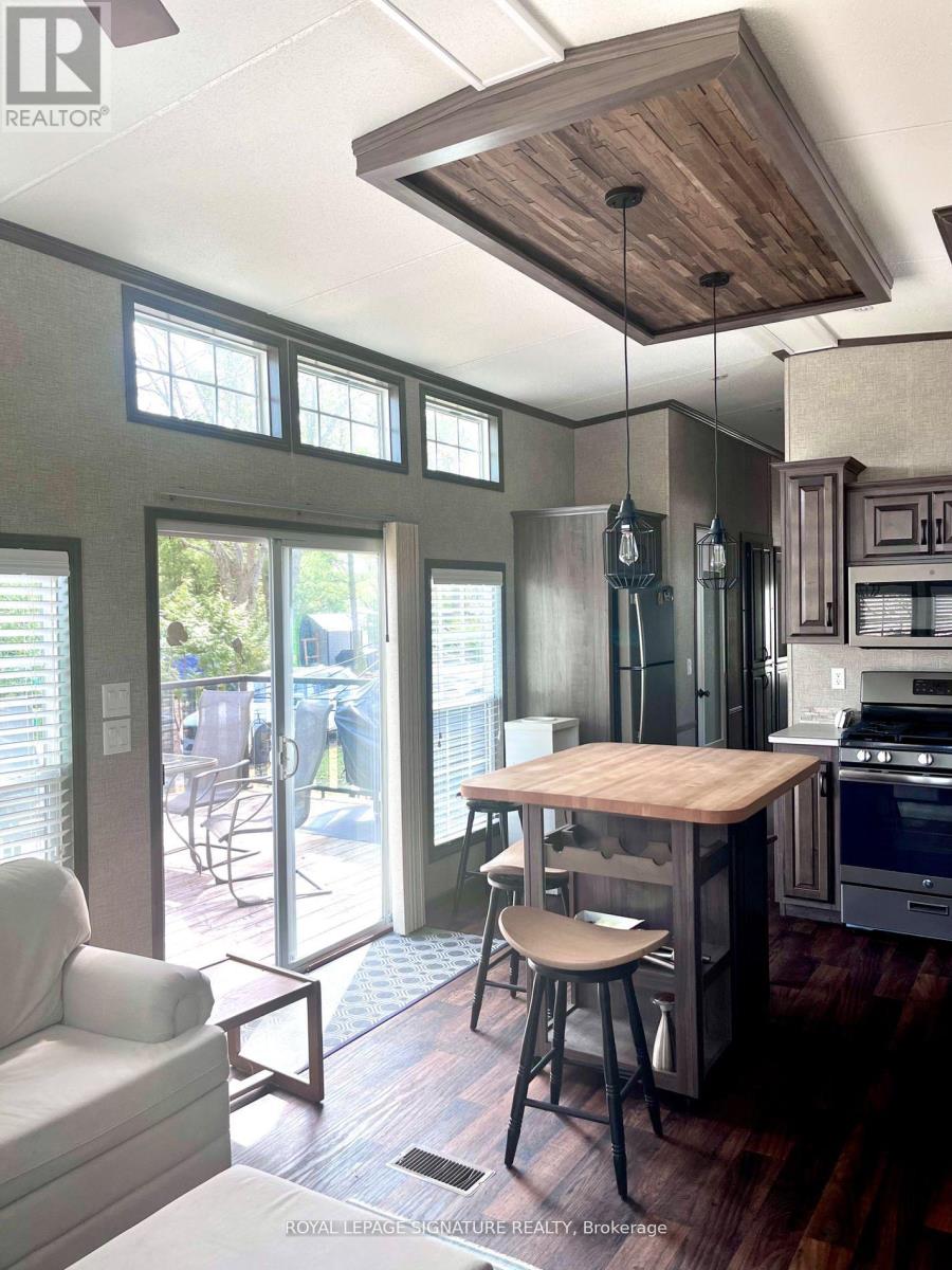 KICK-BACK & RELAX AT AMENITY -RICH "NESTLE IN" RESORT ALONG EMILY CREEK- Discover an affordable way to enjoy the Summer Season with this 2018 Frontier modular unit by General coach gives you 540 sq ft of open concept living featuring vaulted ceilings. This unit comes fully furnished & is bright & spacious, modern & inviting for May-Oct season. The kitchen is massive & features a peninsula with bar stools for casual eating. By any measure, this is one of the best kitchens you can have with full appliances, double sink, windows & a built-in microwave for all your needs. There are 2 bedrooms & 1 3-piece bath that all have tons of storage, clean vinyl plank flooring. Bedroom 2 has a custom bunk bed with easy to access stairs with storage for safety & functionality. Outside the huge deck coverage partially by sizable. (id:64974)
