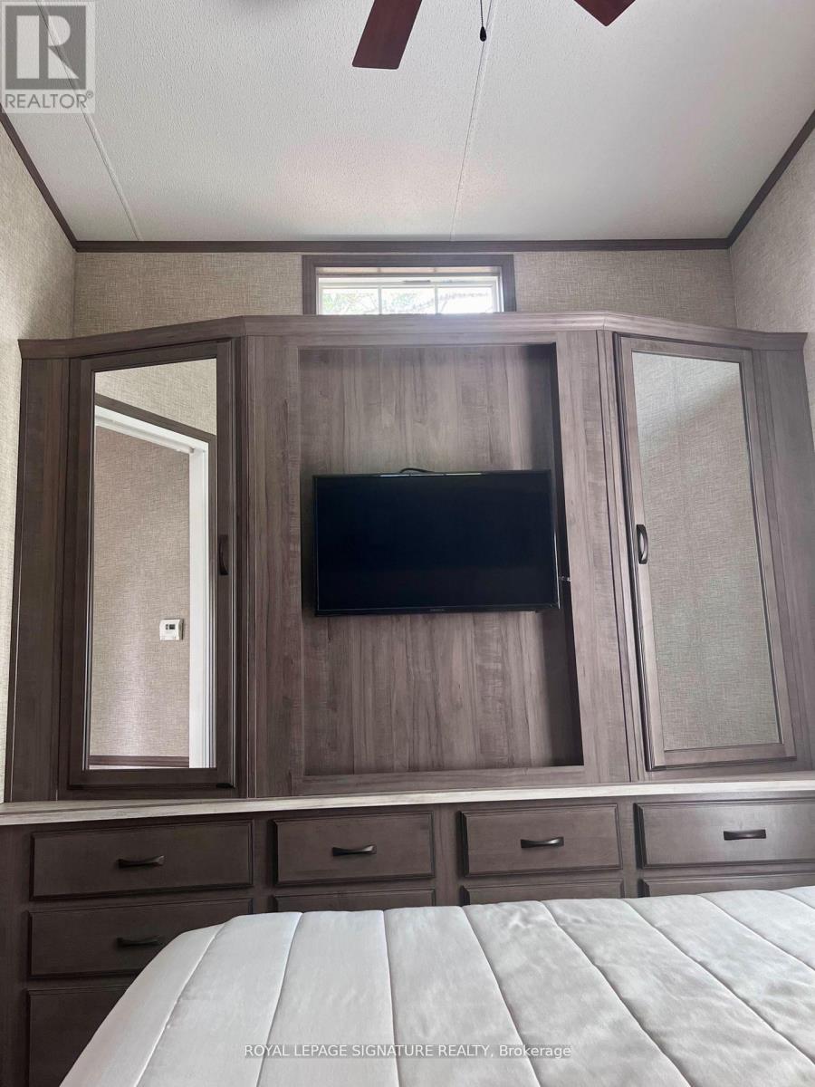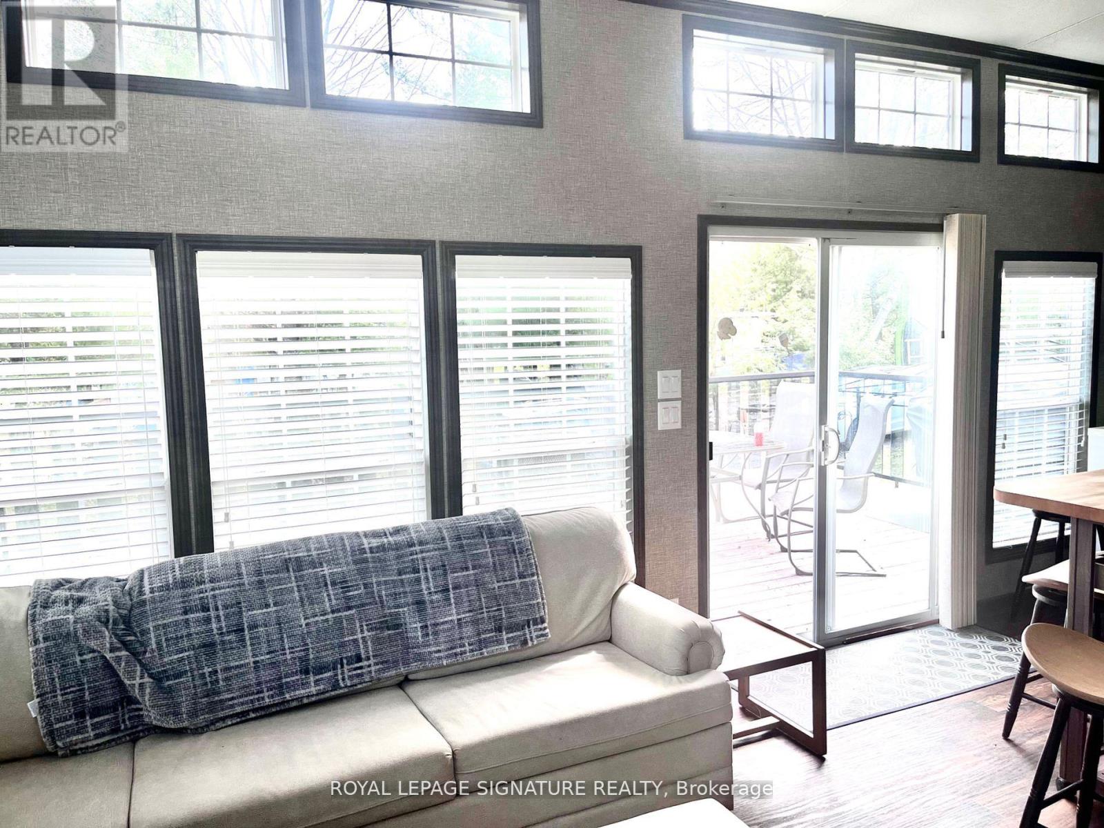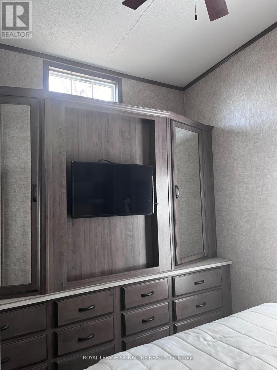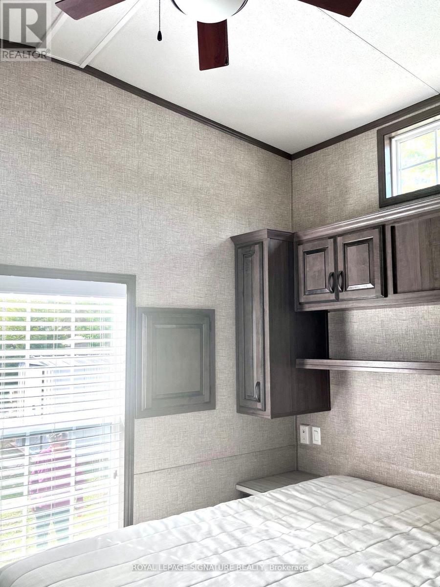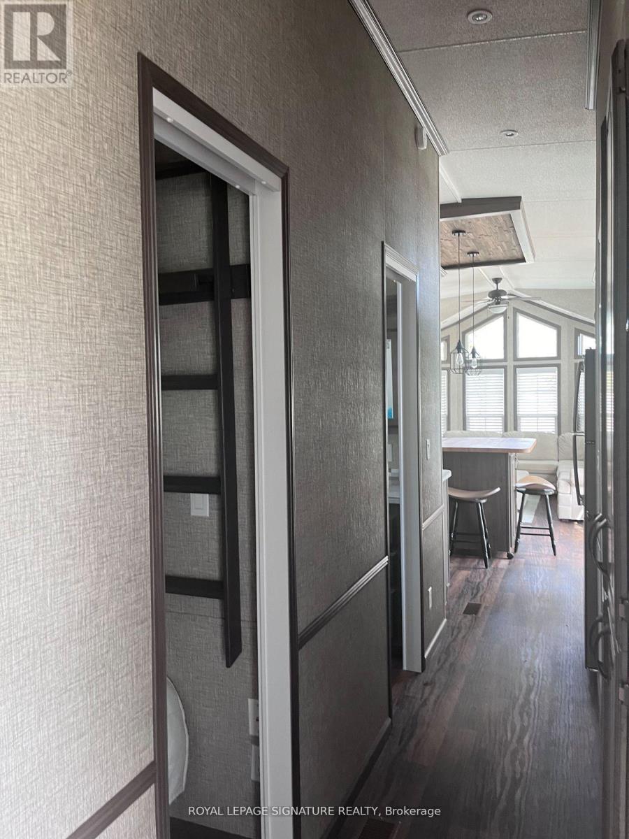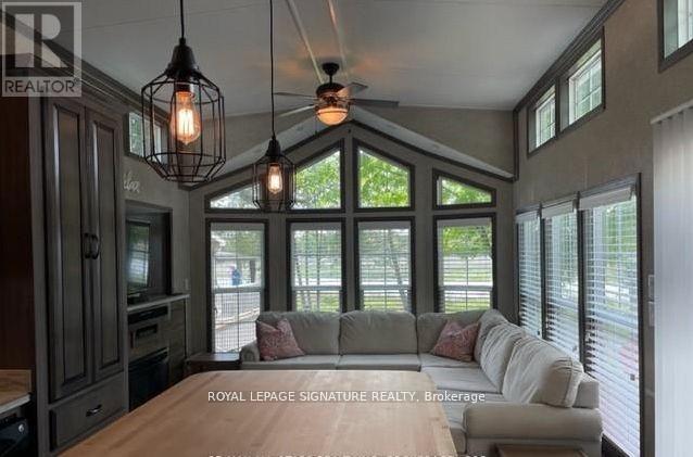 KICK-BACK & RELAX AT AMENITY -RICH "NESTLE IN" RESORT ALONG EMILY CREEK- Discover an affordable way to enjoy the Summer Season with this 2018 Frontier modular unit by General coach gives you 540 sq ft of open concept living featuring vaulted ceilings. This unit comes fully furnished & is bright & spacious, modern & inviting for May-Oct season. The kitchen is massive & features a peninsula with bar stools for casual eating. By any measure, this is one of the best kitchens you can have with full appliances, double sink, windows & a built-in microwave for all your needs. There are 2 bedrooms & 1 3-piece bath that all have tons of storage, clean vinyl plank flooring. Bedroom 2 has a custom bunk bed with easy to access stairs with storage for safety & functionality. Outside the huge deck coverage partially by sizable. (id:64974)