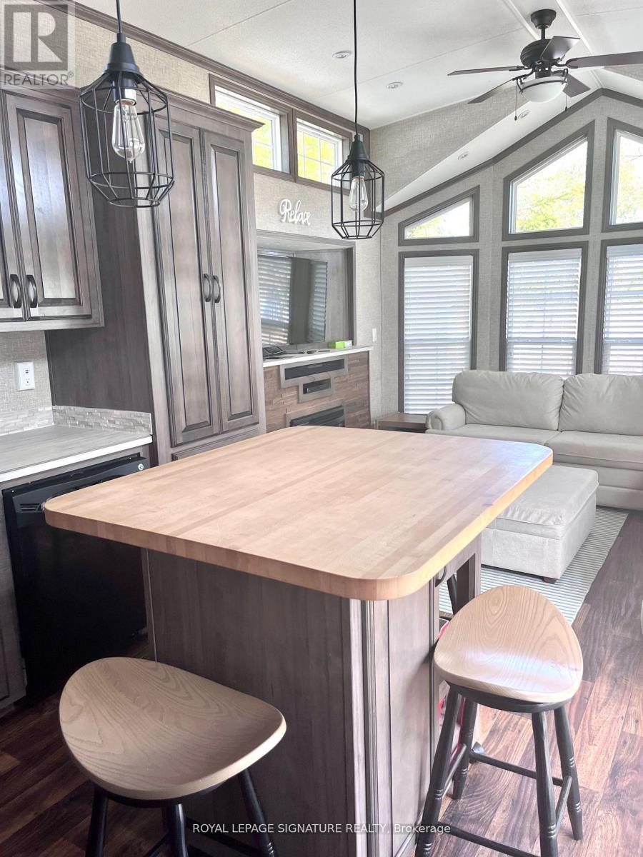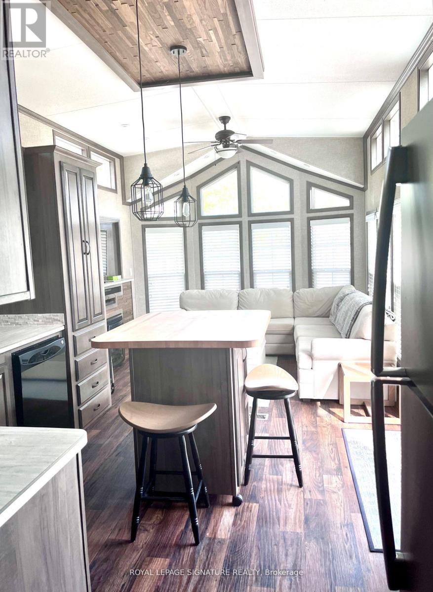 KICK-BACK & RELAX AT AMENITY -RICH "NESTLE IN" RESORT ALONG EMILY CREEK- Discover an affordable way to enjoy the Summer Season with this 2018 Frontier modular unit by KROPF CANADIAN gives you 540 sq ft of open concept living featuring vaulted ceilings and tons of light with oversized windows. This unit comes fully furnished & is bright & spacious, modern & inviting for May - Oct season. The kitchen is massive & features a peninsula with bar stools for casual eating. By any measure, this is one of the best kitchens you can have with full size appliances, propane stove/oven, refrigerator, built-in microwave, dishwasher, and double sink for all your needs. There are 2 bedrooms & one 3-piece bath that all have tons of storage, clean vinyl plank flooring. Bedroom 2 has a custom bunk bed with easy to access stairs with storage for safety & functionality. Outside the huge deck coverage partially by sizable deck, and gazebo. Unit comes withs a full size shed, BBQ, Patio furniture, Propane tanks and Lawn mower. Just bring your personal needs and move right in! (id:64974)