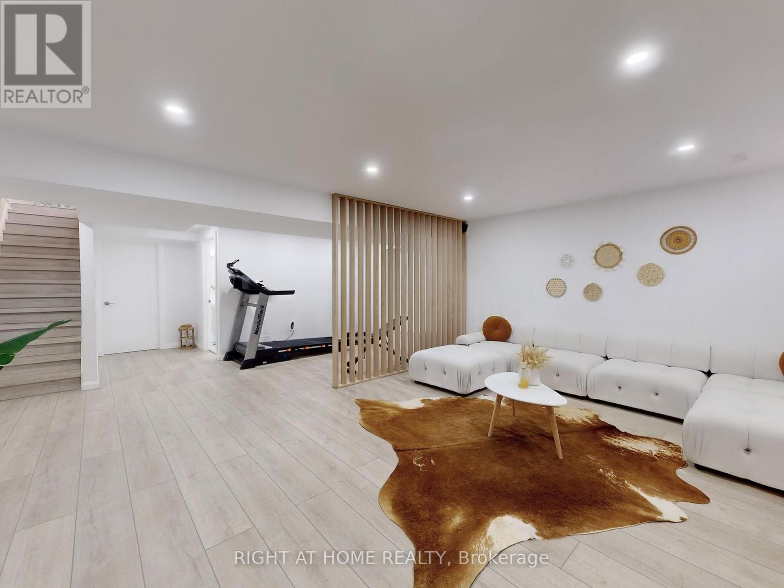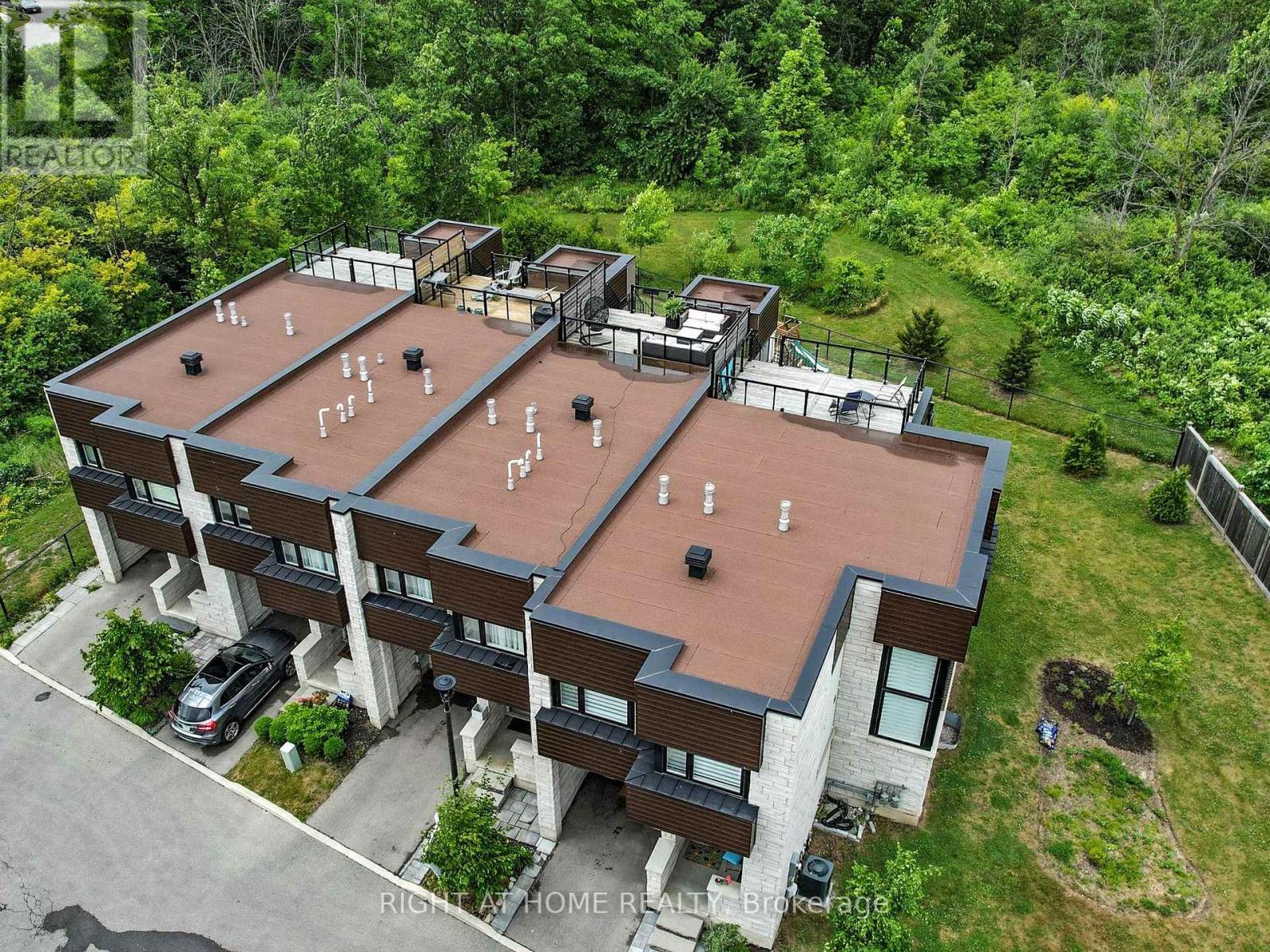 This exquisite executive townhome features 3 bedrooms and 4 bathrooms, combining modern luxury with functionality. The main floor offers an open-concept living area bathed in natural light. Elegant finishes throughout include a TV custom-built stone wall with an electric fireplace, 9-foot ceilings, pot lights, modern light fixtures, heavy duty vinyl flooring on all three levels, expansive wall-to-wall windows on main floor and a floating staircase that adds a dramatic touch. The gourmet kitchen is a chef's dream, boasting a large island with quartz countertops, newer high-end appliances, double oven/air fryer, and plenty of storage. A mudroom provides easy access from the garage. On the second floor, the spacious office can easily be converted into an additional bedroom if needed. The master suite is a true retreat, complete with a spa-like ensuite featuring a walk-in shower, a generous walk-in closet, and direct access to the 240 sq. ft. rooftop terrace, offering breathtaking views. A conveniently located second-floor laundry room completes this level. The fully finished basement adds even more living space, with a rec room, gym, full bathroom and a large storage room. The private backyard, overlooking a serene ravine, is perfect for relaxation and entertaining, with a large patio, a hot tub and green space. With countless upgrades throughout, this home is truly a must-see! (id:64974)