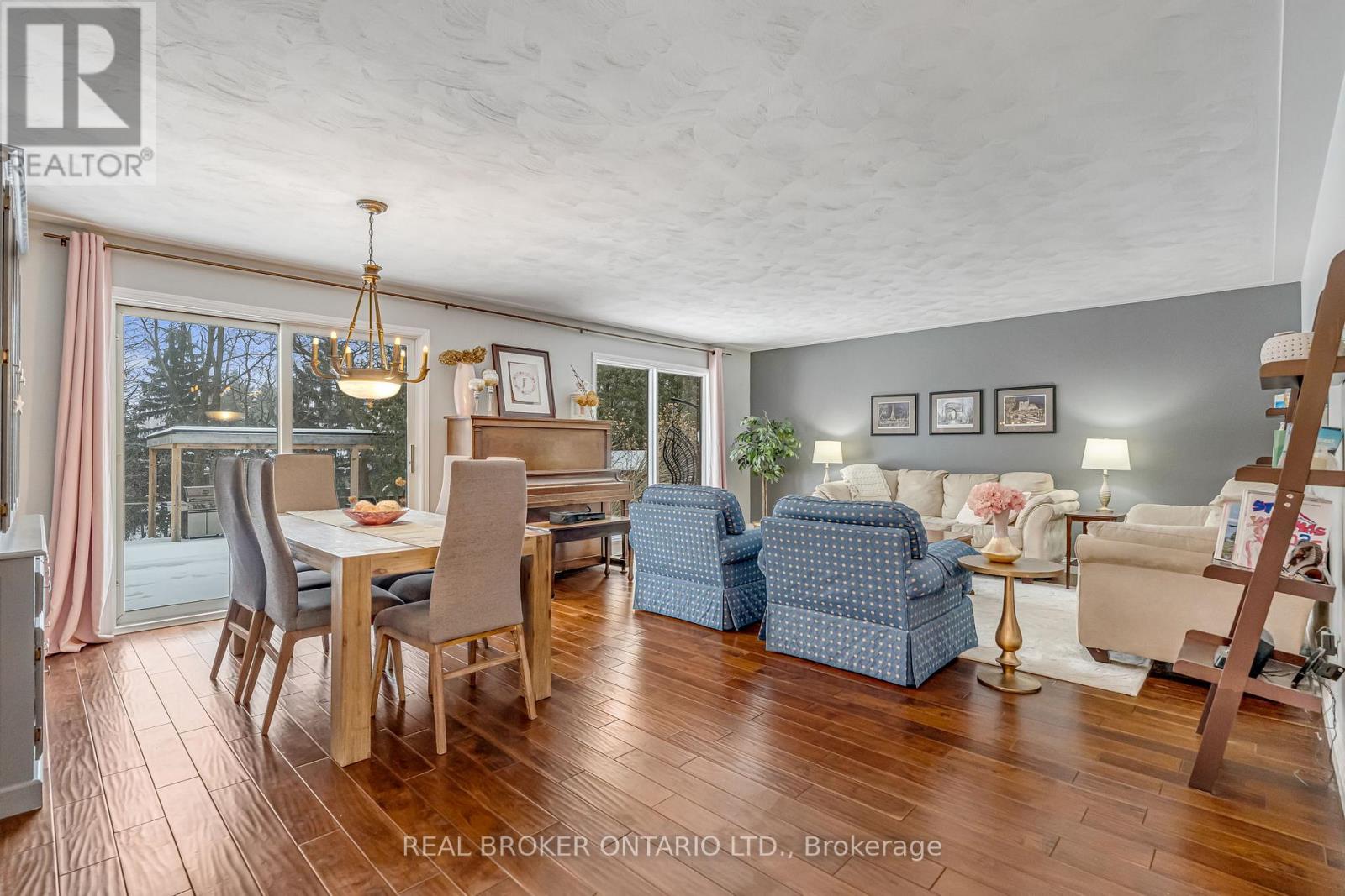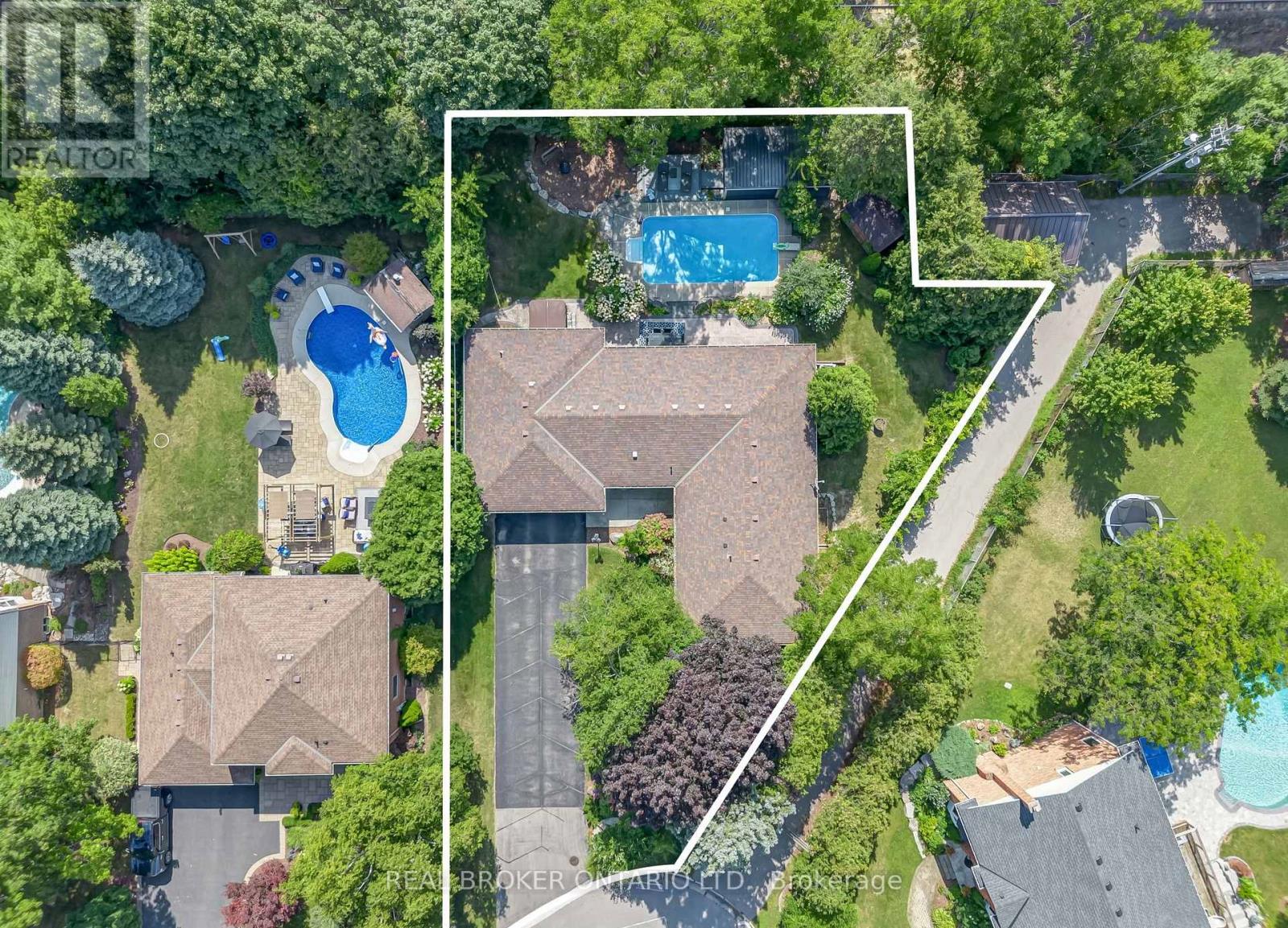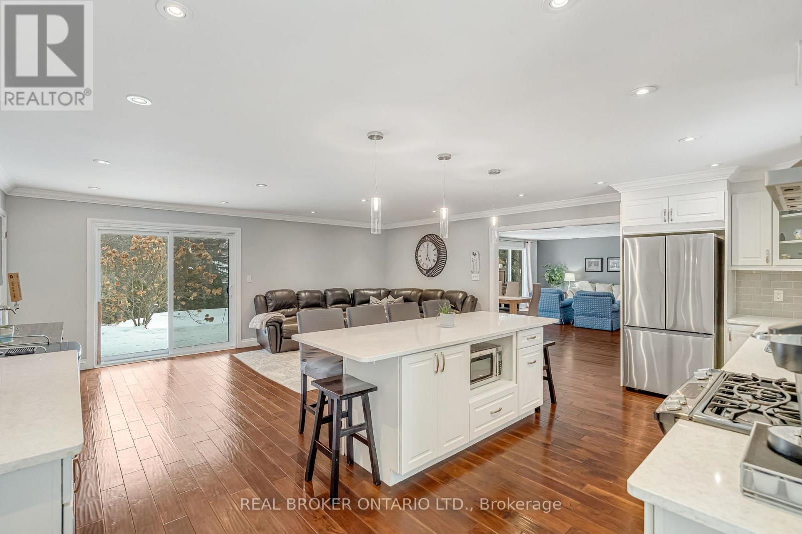 Welcome to a rare opportunity in one of Waterdown's most peaceful, family-oriented neighbourhoods. Tucked away from through traffic, this quiet and private sprawling bungalow offers almost 4,000 total sq ft of thoughtfully designed living space on a mature, beautifully landscaped lot. Inside, you'll find acacia engineered hardwood flooring, quartz kitchen countertops, updated bathrooms, newer windows and patio doors, along with a new furnace and A/C. The spacious recreation room with custom bar is perfect for entertaining, while the backyard oasis features a heated saltwater pool, stamped concrete patio, and lush perennial gardens. An extra-long driveway and full-sized double garage provide ample parking, with space for an RV or boat. A true family home in a one-of-a-kind Waterdown setting. (id:64974)