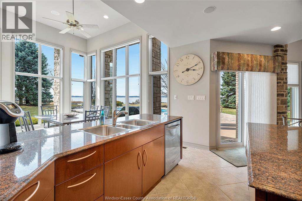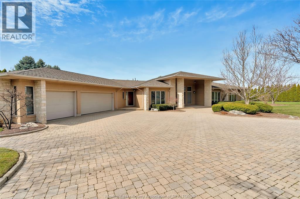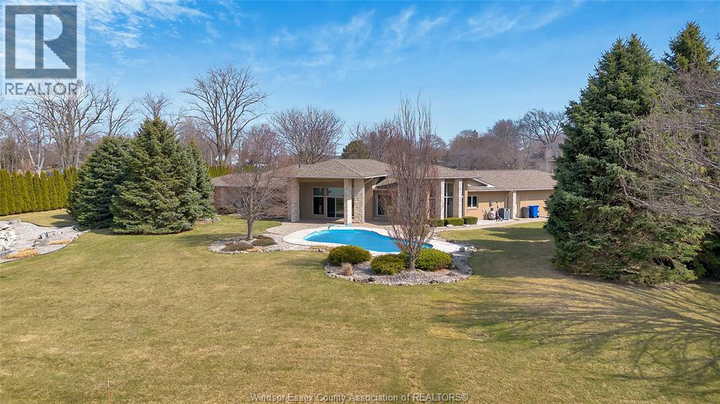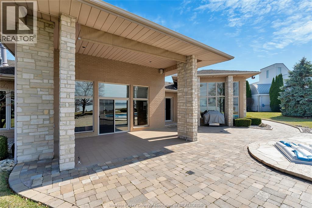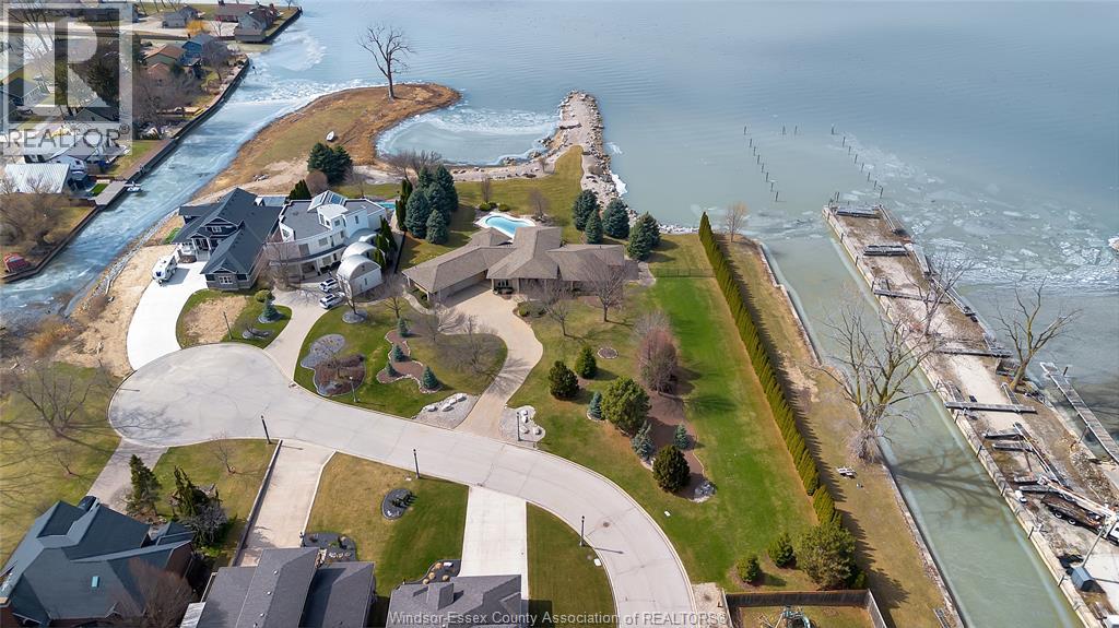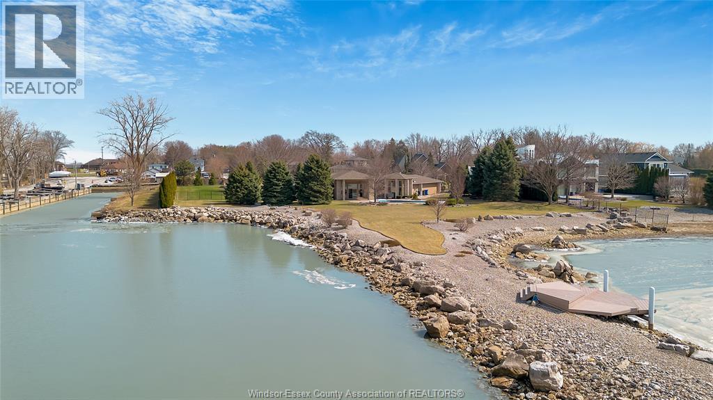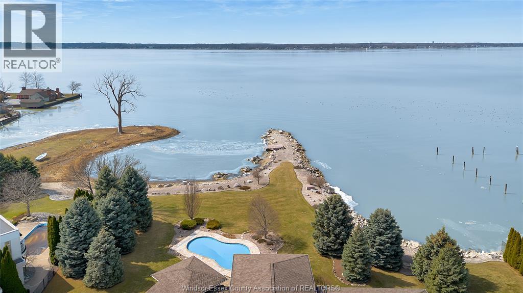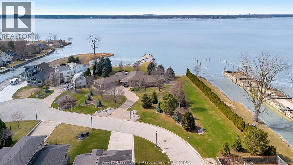 Rare opportunity to own one of Amherstburg's most distinctive waterfront properties. This custom-built executive ranch offers approximately 3,200 sq. ft. of beautifully maintained living space and is perfectly positioned across two expansive building lots with exceptional frontage and depth along a private shoreline. Tucked away on a quiet, one-of-a-kind private waterfront cul-de-sac, this property offers a rare level of privacy and tranquility. Quality craftsmanship is evident throughout with custom cabinetry, spacious principal rooms, and beautiful water views from multiple areas of the home. Professionally engineered shoreline protection provides lasting peace of mind while preserving the natural waterfront setting. Step outside to your own private retreat featuring professionally landscaped grounds and a saltwater inground pool-perfect for relaxing or entertaining. Western exposure captures breathtaking sunsets over the water. ADDITIONAL PHOTOS AVAILABLE UPON REQUEST. SEE DOCUMENTS FOR FEATURE SHEET (id:64974)