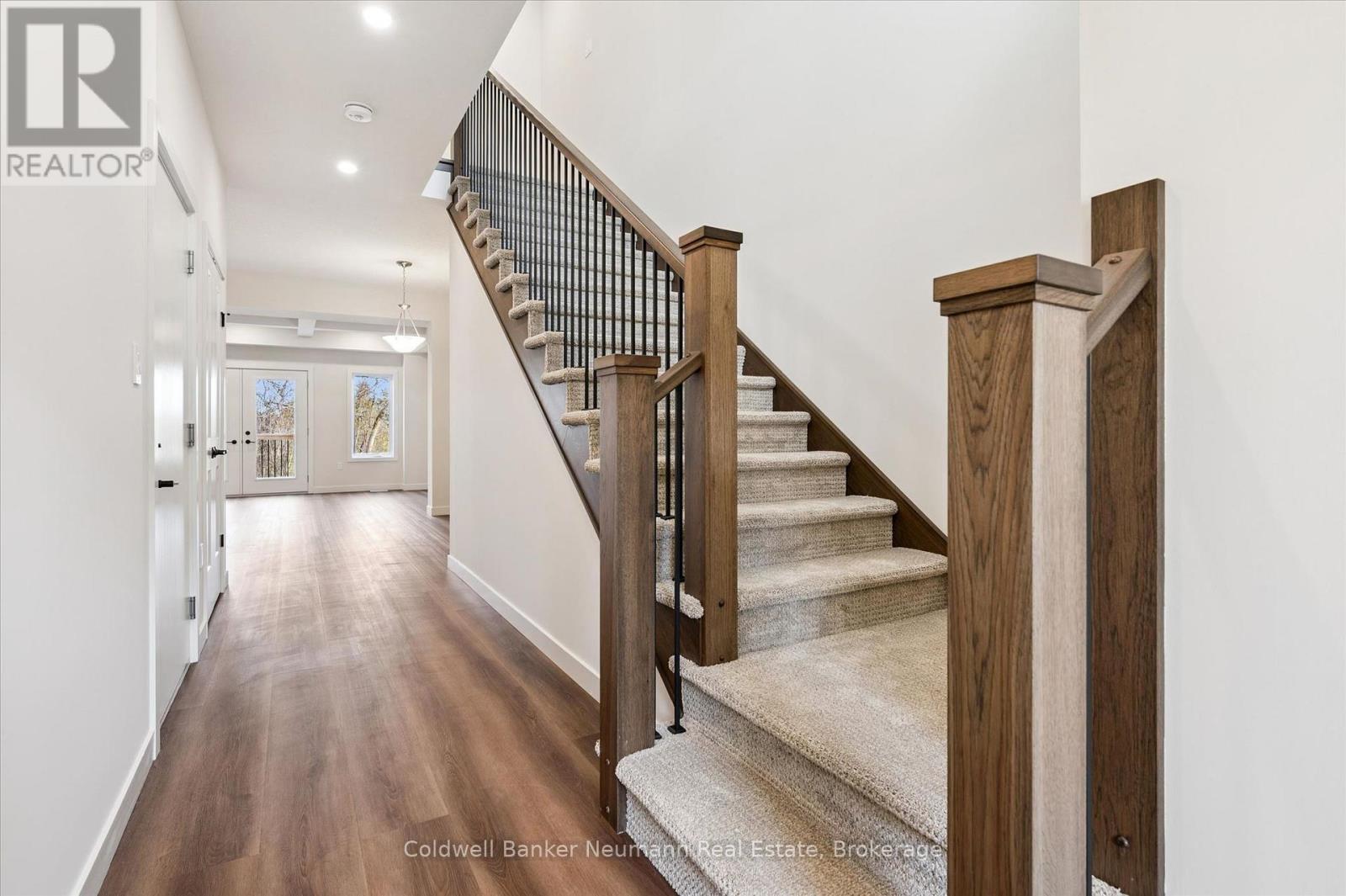 Set within the South River community in Elora by Granite Homes, this 1,637 sq. ft. townhome blends thoughtful design with a setting that feels calm and connected to nature. Offering three bedrooms, 2.5 bathrooms, and a layout designed for everyday living. The main floor features 9' ceilings and luxury vinyl plank flooring throughout. At the centre of the home, the kitchen is finished with quartz countertops, upgraded cabinetry, under-cabinet lighting, and an extended breakfast bar that transitions easily from everyday use to entertaining. The living room adds warmth with a coffered ceiling detail, while designer trim carries a clean, cohesive finish throughout. Upstairs, you'll find three bedrooms, including a primary suite with a walk-in closet and a private ensuite featuring a walk-in tiled shower with frameless glass. Second-floor laundry adds everyday convenience. Step outside to a private deck backing onto greenspace, offering a quiet backdrop to unwind or entertain. All while being just minutes from Elora's charming downtown, local restaurants, scenic trails, and a state-of-the-art hospital, with Guelph, Kitchener, and Waterloo easily within reach. **The HST rebate for all eligible buyers has been announced and is awaiting final approval. Listing price reflects the price after HST rebates. The price listed assumes eligibility for the proposed full HST rebate, please speak with Granite Homes Sales Representatives for more information and to see if you qualify** (id:64974)