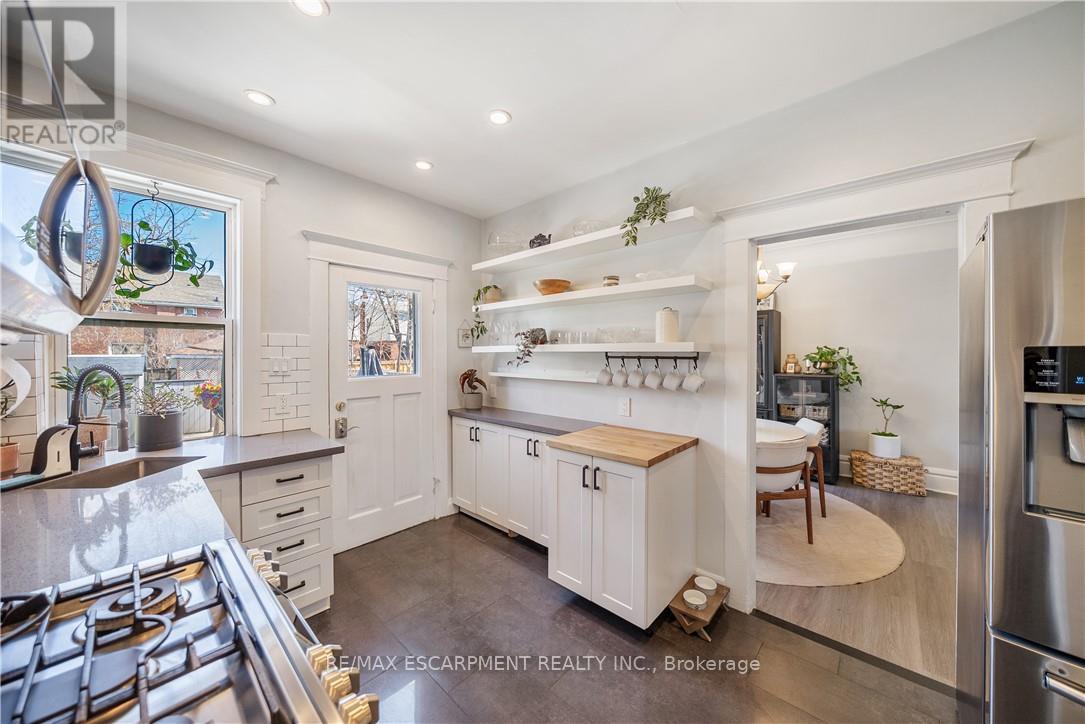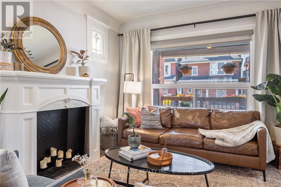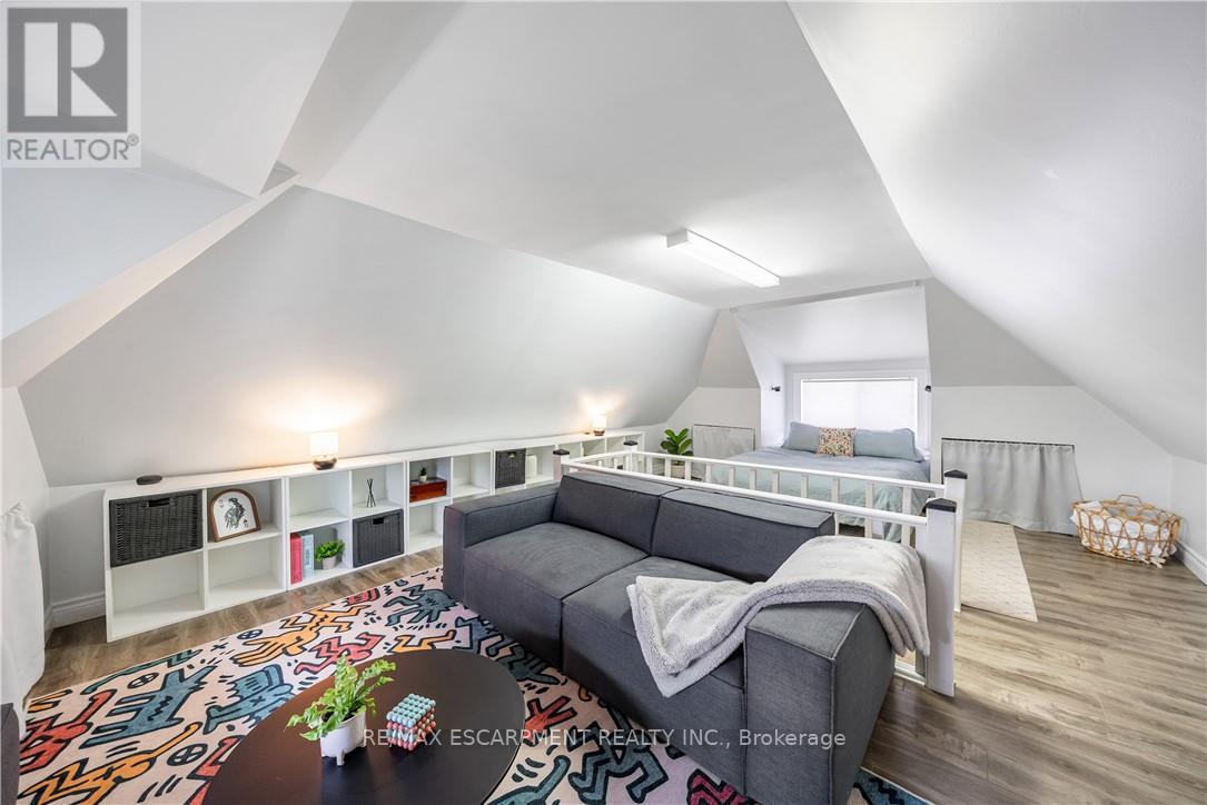 Over a century old and better than ever. This solid brick Hamilton home is the kind of property that earns a second look, and a third. Original stained glass windows frame a beautiful living room with soaring ceilings and ornate white millwork. High ceilings throughout. Thoughtfully styled and genuinely well cared for, every room tells you this home has been loved! The layout offers serious flexibility_ Three bedrooms on the second floor, a massive third-floor loft that functions as an entire additional level. The loft could be used as a fourth bedroom, home office, or secondary living space. The home also has a fully self-contained basement suite with its own private entrance, full kitchen, bedroom, and bathroom. The basement has just been fully renovated (2026) and a brand new furnace installed (2026) - move in and enjoy it from day one. Two full bathrooms across three levels means everyone has what they need. Out back, a private patio surrounded by mature landscaping, lush garden beds, and a fully fenced yard. The fence was replaced in 2023, a gated driveway added in 2021, and a detached shed and utility shed are already in place. In a neighbourhood where private parking is almost unheard of, the wide concrete driveway makes this property stand out before you even step inside. (id:64974)