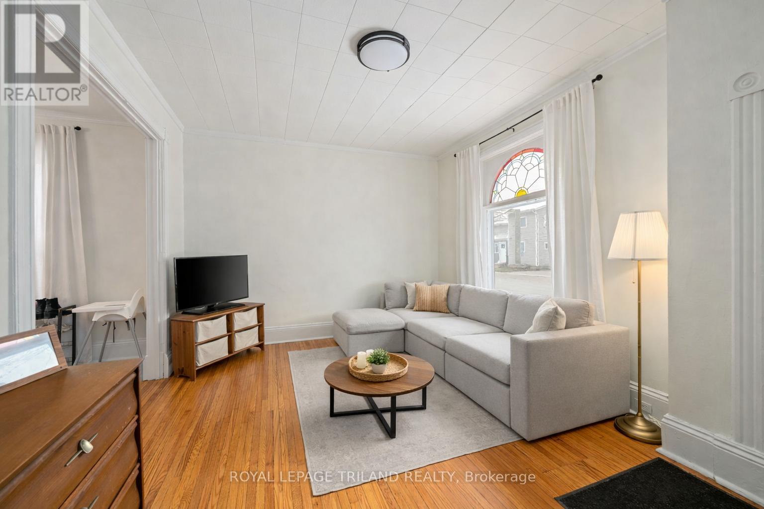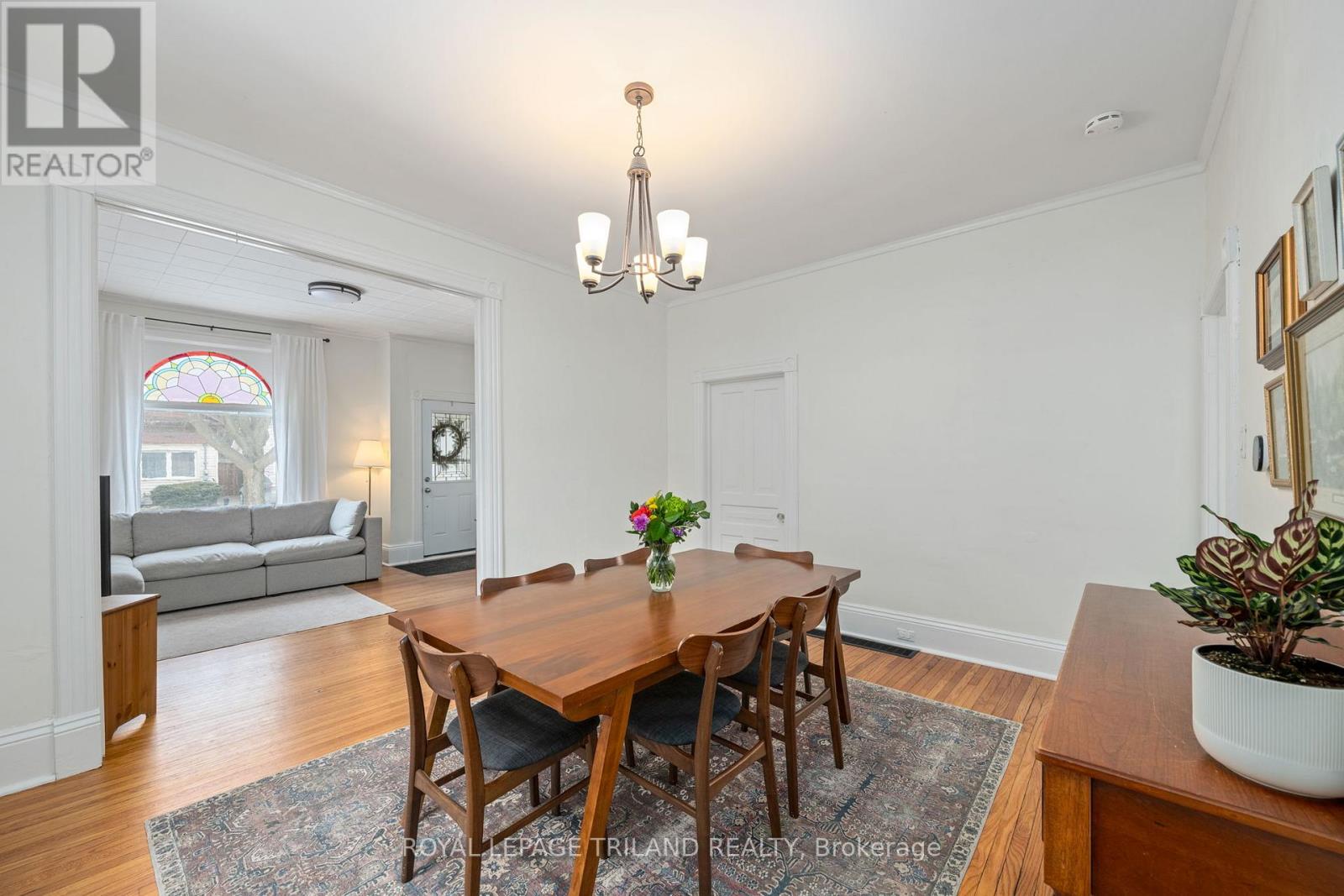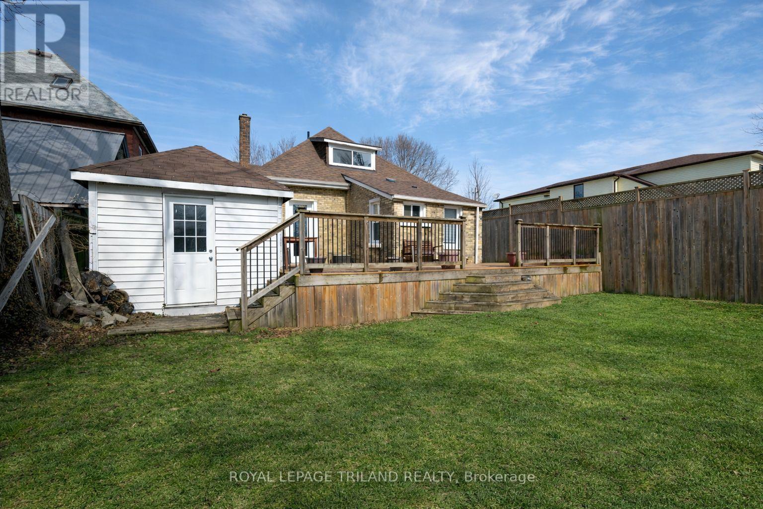 Charming yellow brick home with a welcoming covered front porch, ideally located just a short walk from downtown St. Thomas. This 4 bedroom, character-filled home features high ceilings, large windows and original hardwood flooring throughout the elegant living room, formal dining room and three spacious bedrooms main floor bedrooms. The bright U-shaped kitchen anchors the home. It is a true working kitchen that offers ceramic flooring, tile backsplash, newer cabinetry and plenty of counter space. The renovated main floor 3-piece bathroom conveniently includes laundry. Upstairs you'll find an oversized loft space that works beautifully as a primary bedroom retreat, complete with its own 3-piece bathroom and relaxing soaker tub. Outside, you'll love the brand new deck and the fully fenced backyard - perfect for entertaining. The shed offers additional storage. St. Thomas continues to grow as new industry and development move into the area, making this a great opportunity to buy while the community remains affordable. With a strong walk score and close proximity to downtown, shopping, restaurants and everyday amenities, this home is ideal for first-time buyers, investors or anyone looking for a great place to call home in a vibrant and evolving neighbourhood. (id:64974)