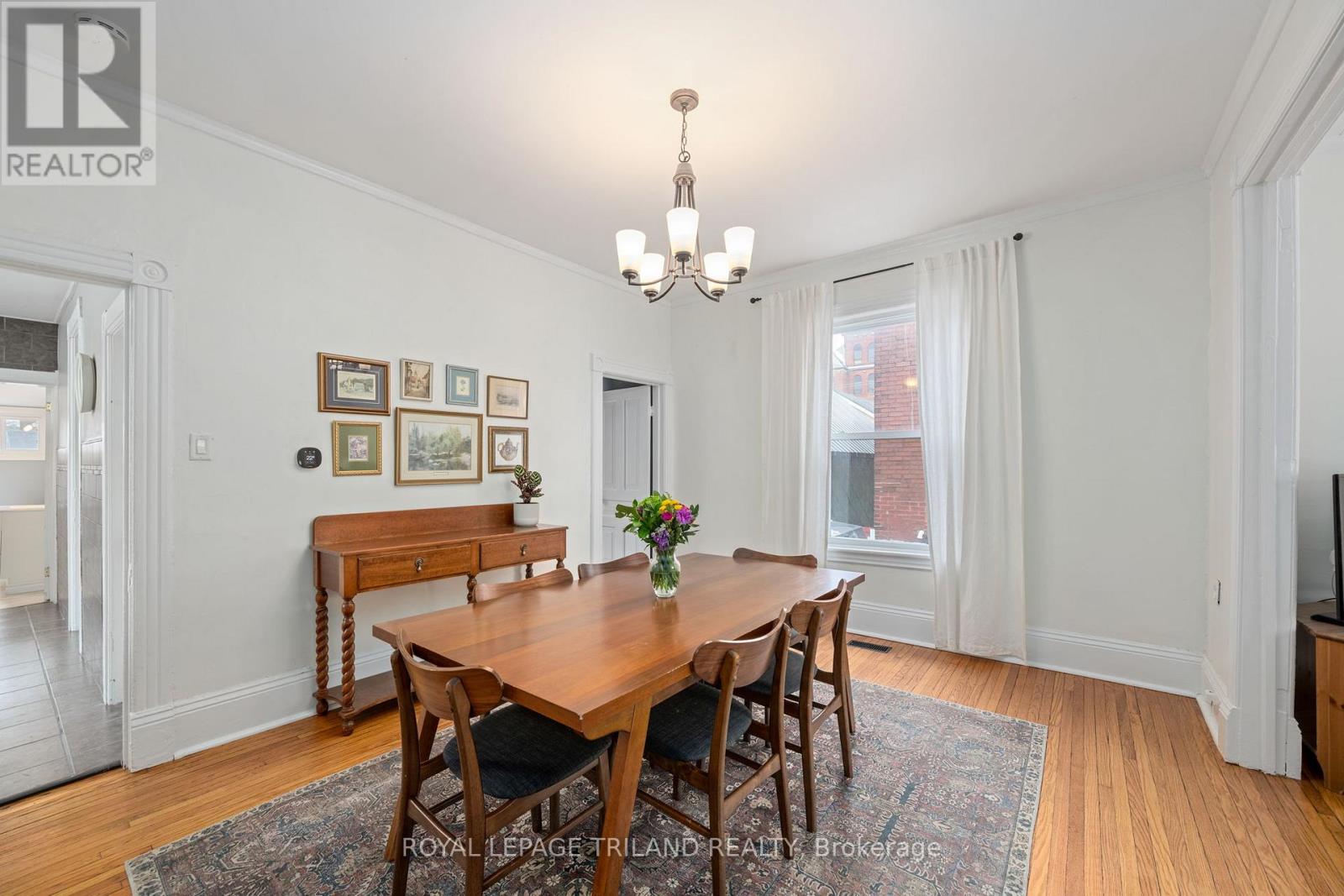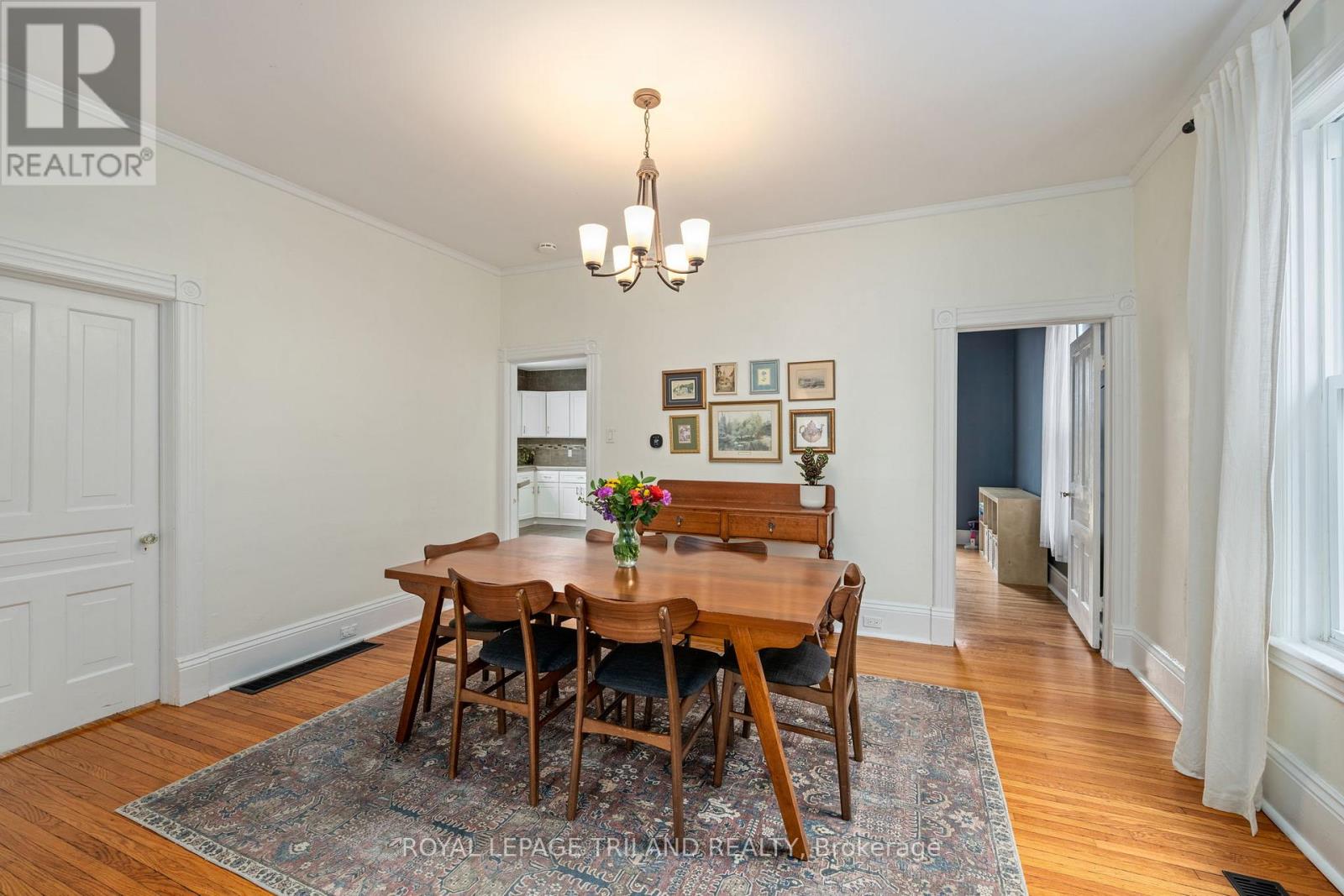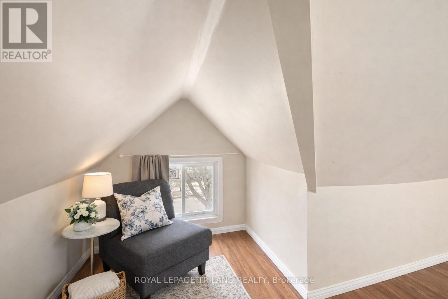 Charming yellow brick home with a welcoming covered front porch, ideally located just a short walk from downtown St. Thomas. This 4 bedroom, character-filled home features high ceilings, large windows and original hardwood flooring throughout the elegant living room, formal dining room and three spacious bedrooms main floor bedrooms. The bright U-shaped kitchen anchors the home. It is a true working kitchen that offers ceramic flooring, tile backsplash, newer cabinetry and plenty of counter space. The renovated main floor 3-piece bathroom conveniently includes laundry. Upstairs you'll find an oversized loft space that works beautifully as a primary bedroom retreat, complete with its own 3-piece bathroom and relaxing soaker tub. Outside, you'll love the brand new deck and the fully fenced backyard - perfect for entertaining. The shed offers additional storage. St. Thomas continues to grow as new industry and development move into the area, making this a great opportunity to buy while the community remains affordable. With a strong walk score and close proximity to downtown, shopping, restaurants and everyday amenities, this home is ideal for first-time buyers, investors or anyone looking for a great place to call home in a vibrant and evolving neighbourhood. (id:64974)
