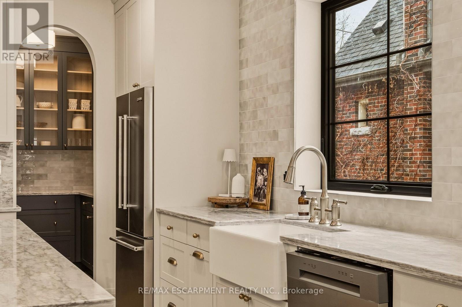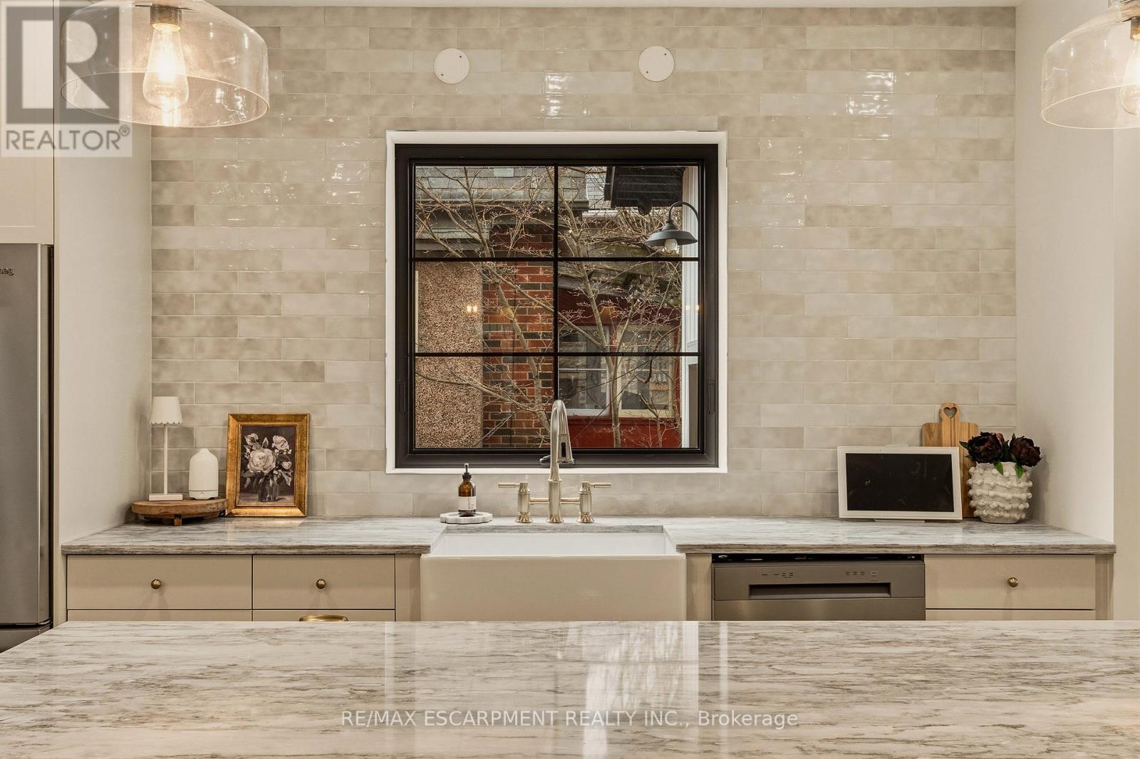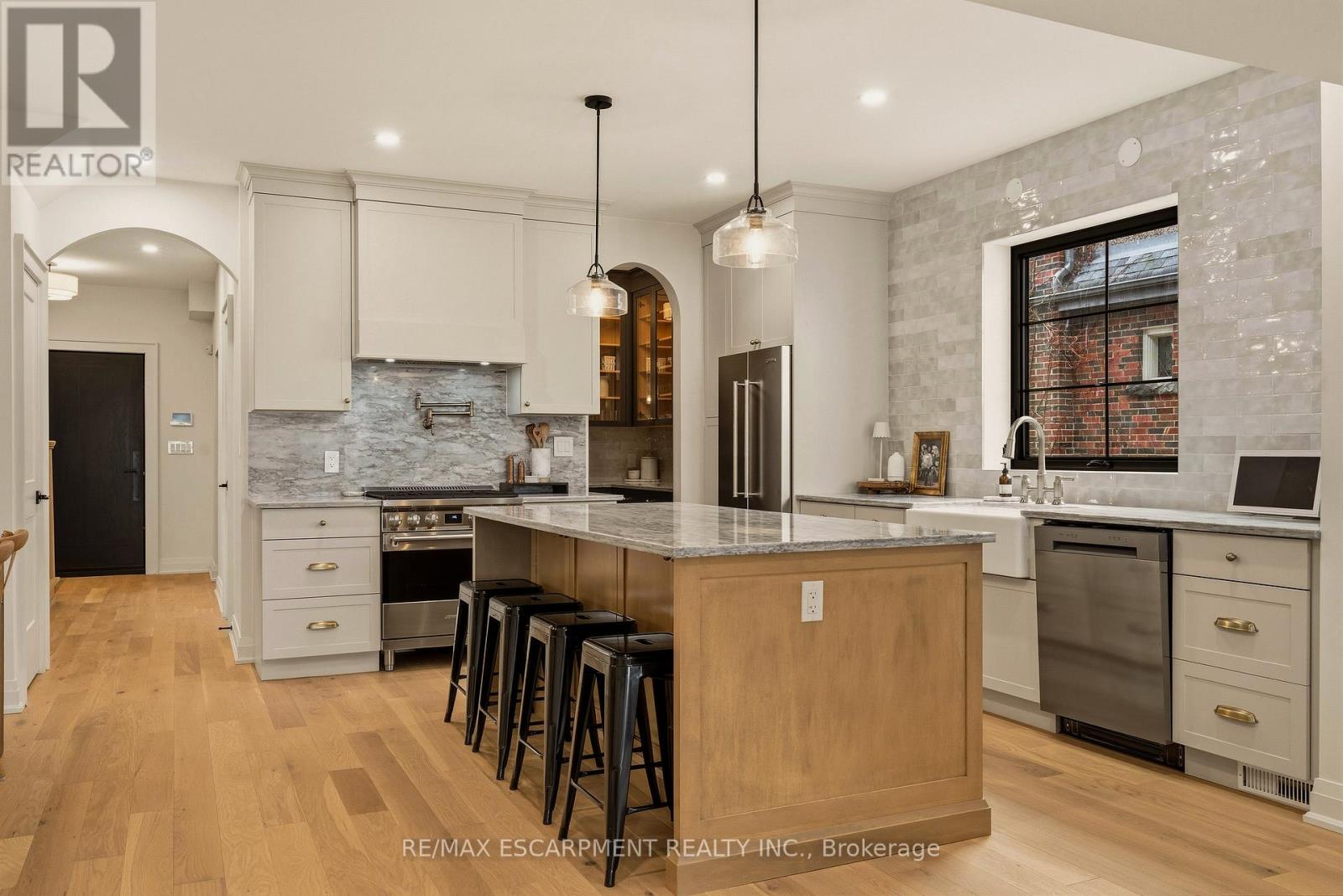 Step into a beautifully reimagined turn-of-the-century 2.5-storey brick home, where extensive renovations and thoughtful additions have transformed it into a stunning blend of historic charm and modern living-all perfectly set in the heart of downtown Dundas. A charming interlock walkway winds through lush perennial gardens to a welcoming covered front porch-an ideal spot to enjoy your morning coffee while taking in the peaceful, highly sought-after neighbourhood. Inside, timeless character blends beauty with thoughtful modern updates. The fully renovated main floor, complete with a seamless addition, showcases a dream kitchen designed to inspire both everyday living and effortless entertaining. Rich hardwood floors, beautiful office space, a warm and inviting living room, and a dedicated dining area create the perfect backdrop for gathering with family and friends, while a convenient mudroom offers easy access to the 3/4 garage. Upstairs, a stunning second-floor addition and renovation elevate the home with a beautifully finished primary retreat, featuring a spacious walk-in closet and a spa-like 5-piece ensuite. Additional bedrooms are generously sized and complemented by a well-appointed main bathroom. The third level offers even more versatility, with two extra bedrooms, perfect for that growing family or as exercise and creative spaces. This move-in ready gem offers the perfect balance of historic charm and modern living-an exceptional opportunity in one of Dundas' most desirable locations. (id:64974)
