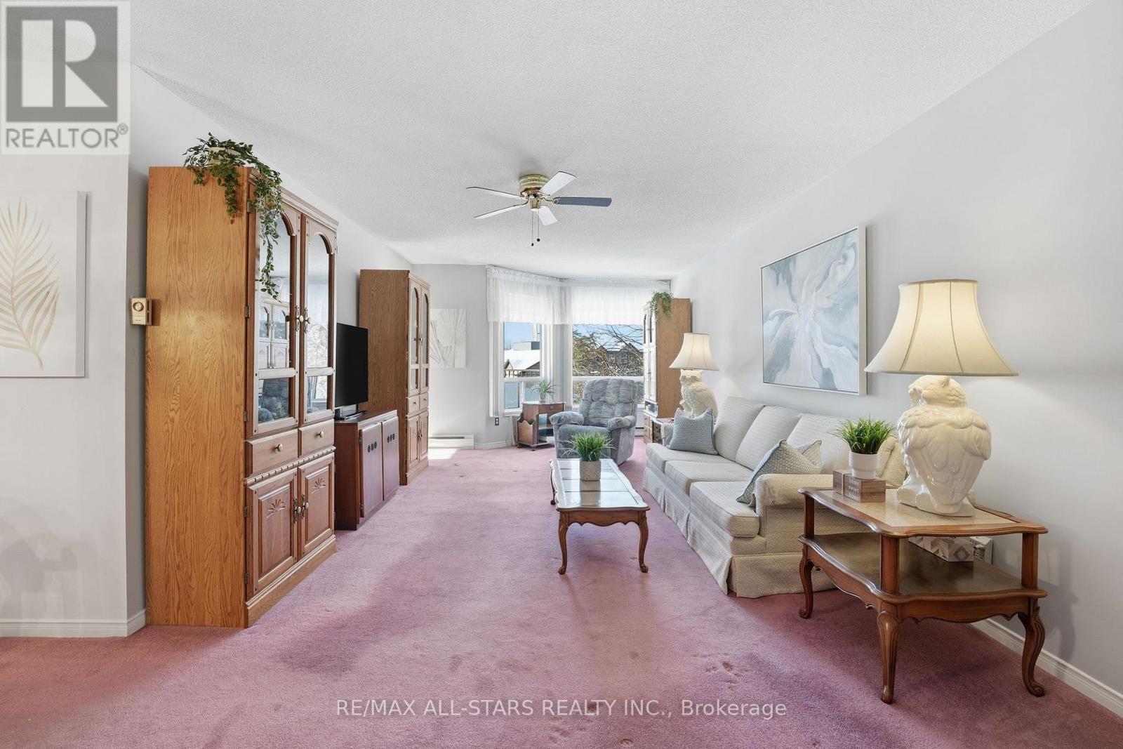 Welcome to The Oaks, a well maintained & secure adult condo building in the heart of historic Jackson's Point. This bright 3rd floor end unit overlooks beautifully landscaped gardens and features two generously sized bedrooms & two bathrooms. The primary bedroom has a large walk-in closet and 4 pc ensuite. Lots of counter & cabinet space in the kitchen with a walkout to a quiet balcony with garden views. Convenient in-suite laundry and storage room. The building offers an inviting lobby, elevator, community room, a gym and is within walking distance to The Briars Golf Club, shopping and local restaurants. (id:64974)