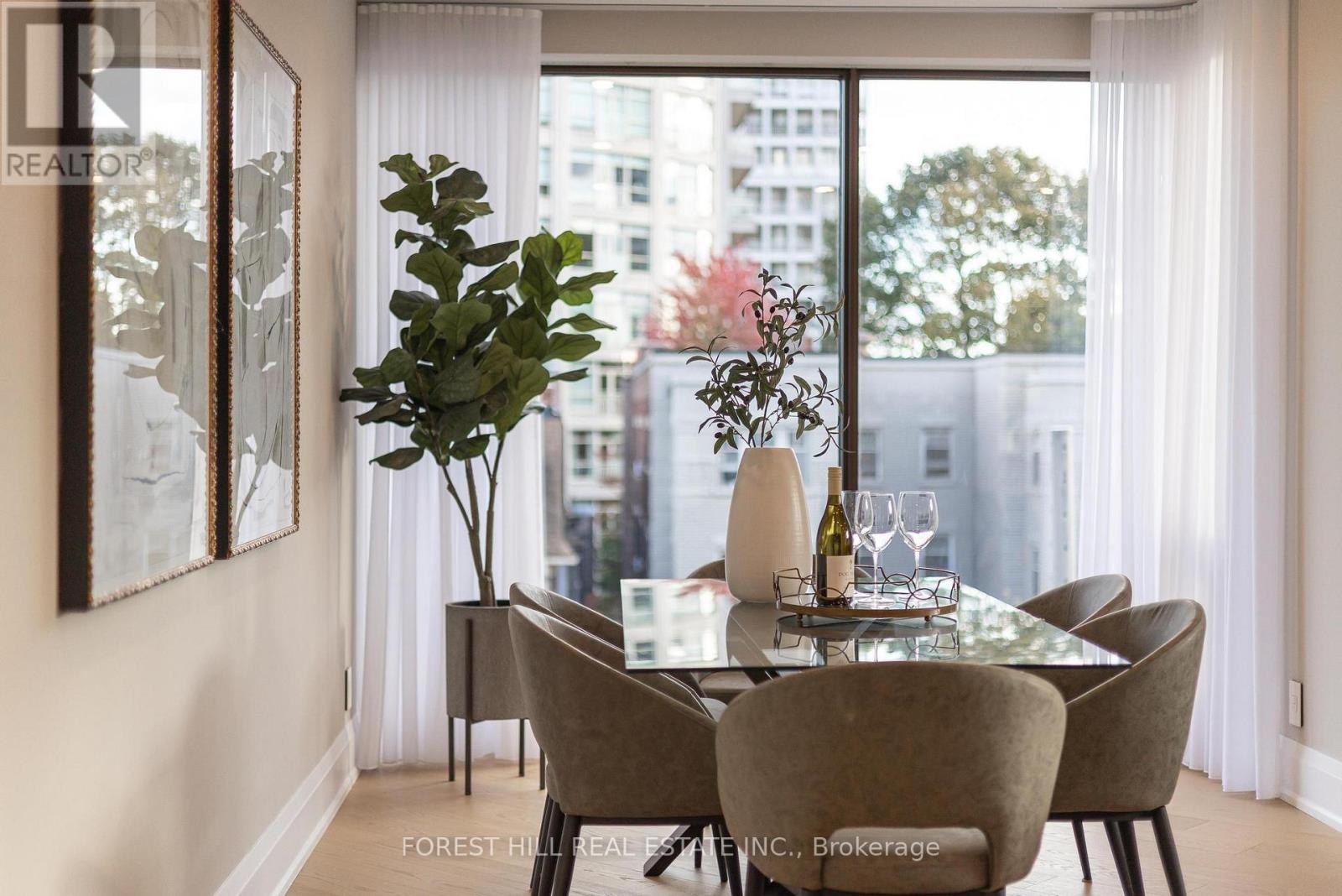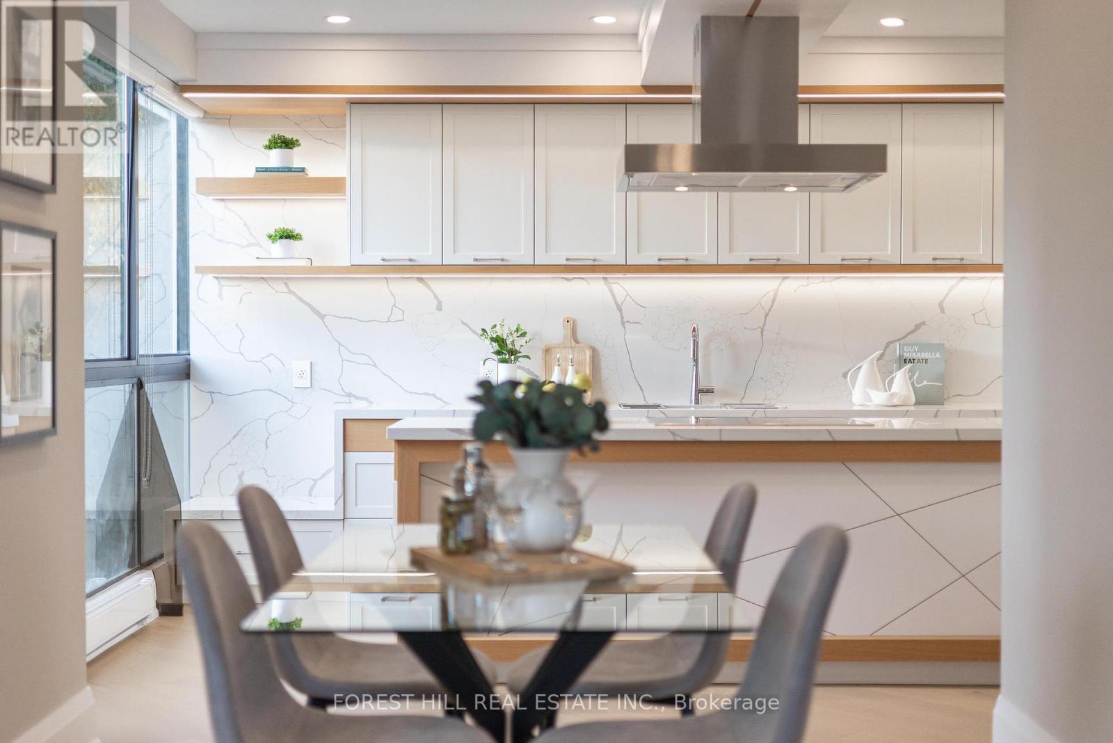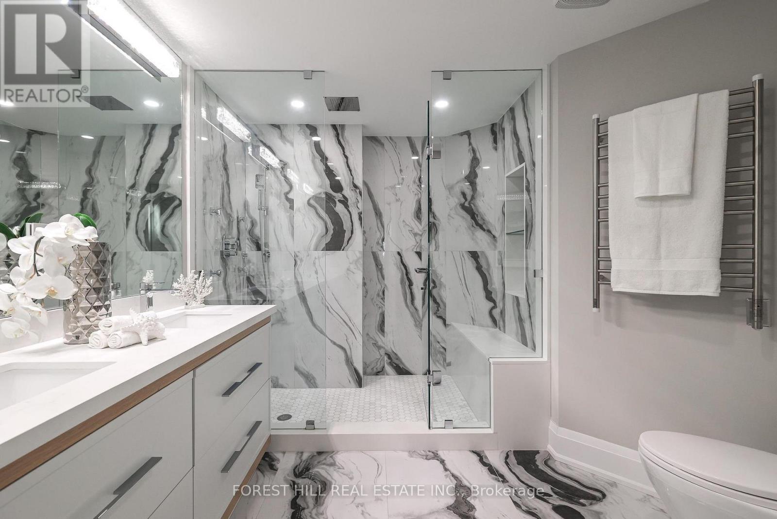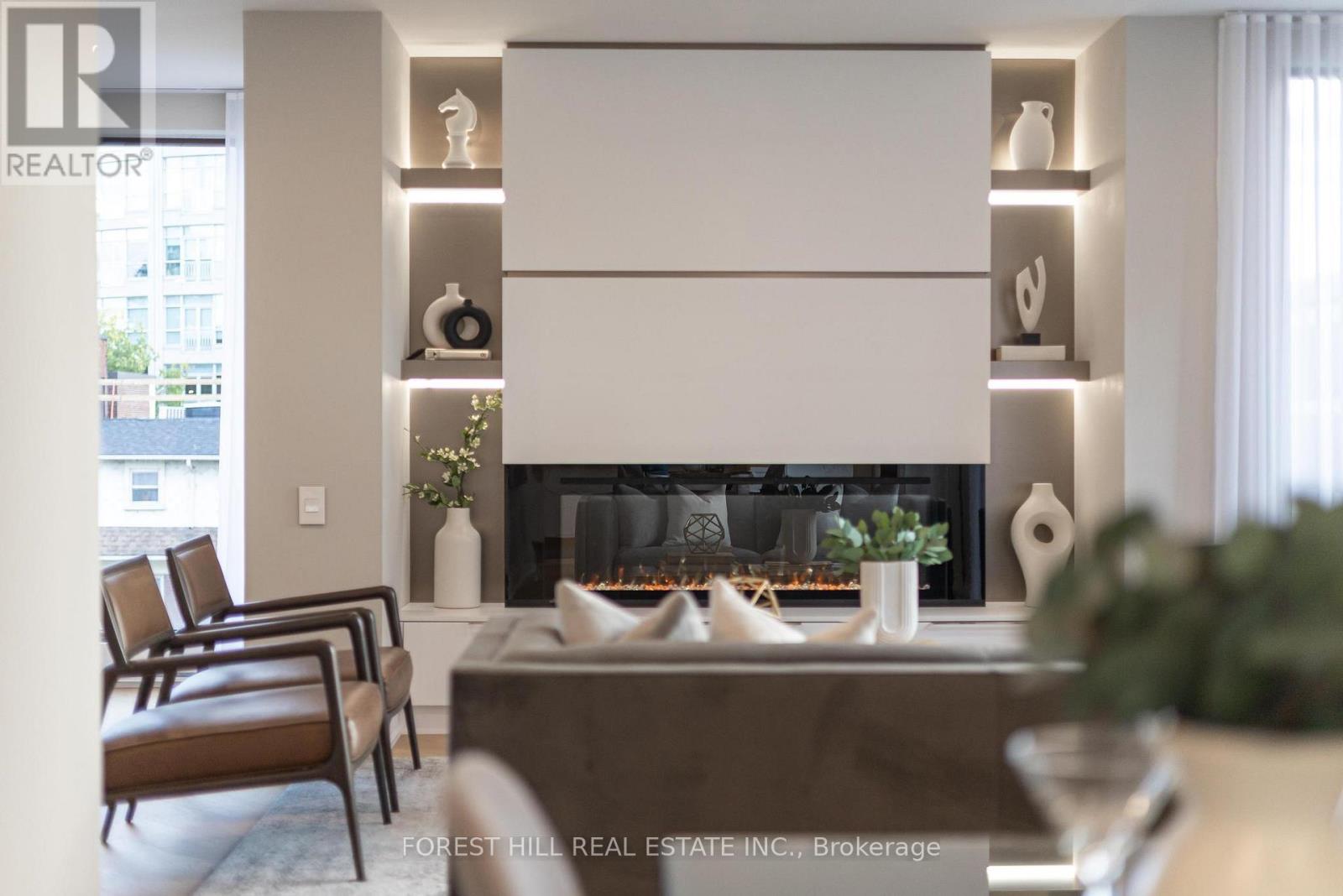 Nestled in a boutique residence of only 20 suites in prestigious Forest Hill Village in this meticulously renovated 1,750 SF corner suite. This turnkey residence showcases 2 spacious bedrooms & 2 bathrooms, boasting bespoke finishes that elevate everyday living. Bathed in natural light, the suite features floor-to-ceiling glass creating a bright and airy atmosphere. The sumptuous light wood floors add a sophisticated touch to every room. A striking fireplace with custom built-ins & integrated lighting, serves as the anchor of the main living space. The thoughtfully designed split floor plan offers a seamless flow ideal for entertaining. The chef's kitchen is equipped with high-end Miele appliances, a stunning quartz center island with overhead hood fan & ample cabinetry. Breathtaking views of the surrounding tree canopy. Retreat to the gracious primary suite, featuring custom built-in cabinetry & a spa-like ensuite, complete with double sinks, a spacious walk-in shower with bench, heated floors & heated towel rack & exquisite finishes that exude opulence. The generous second bedroom is the epitome of comfort & style, while the additional bathroom boasts a luxurious soaker tub, heated floors & towel rack. This impressive suite also includes a full laundry room with sink and extra storage. Completing the package are 2 parking spaces & large locker. Situated just steps away from The Village, Loblaws, boutique shops & fine dining options, as well as Winston Churchill Park & scenic ravines. Public transit is conveniently around the corner. This exceptional residence harmonizes exquisite design with an unbeatable location, setting the stage for an enviable lifestyle in one of Toronto's most sought-after neighbourhoods. (id:64974)