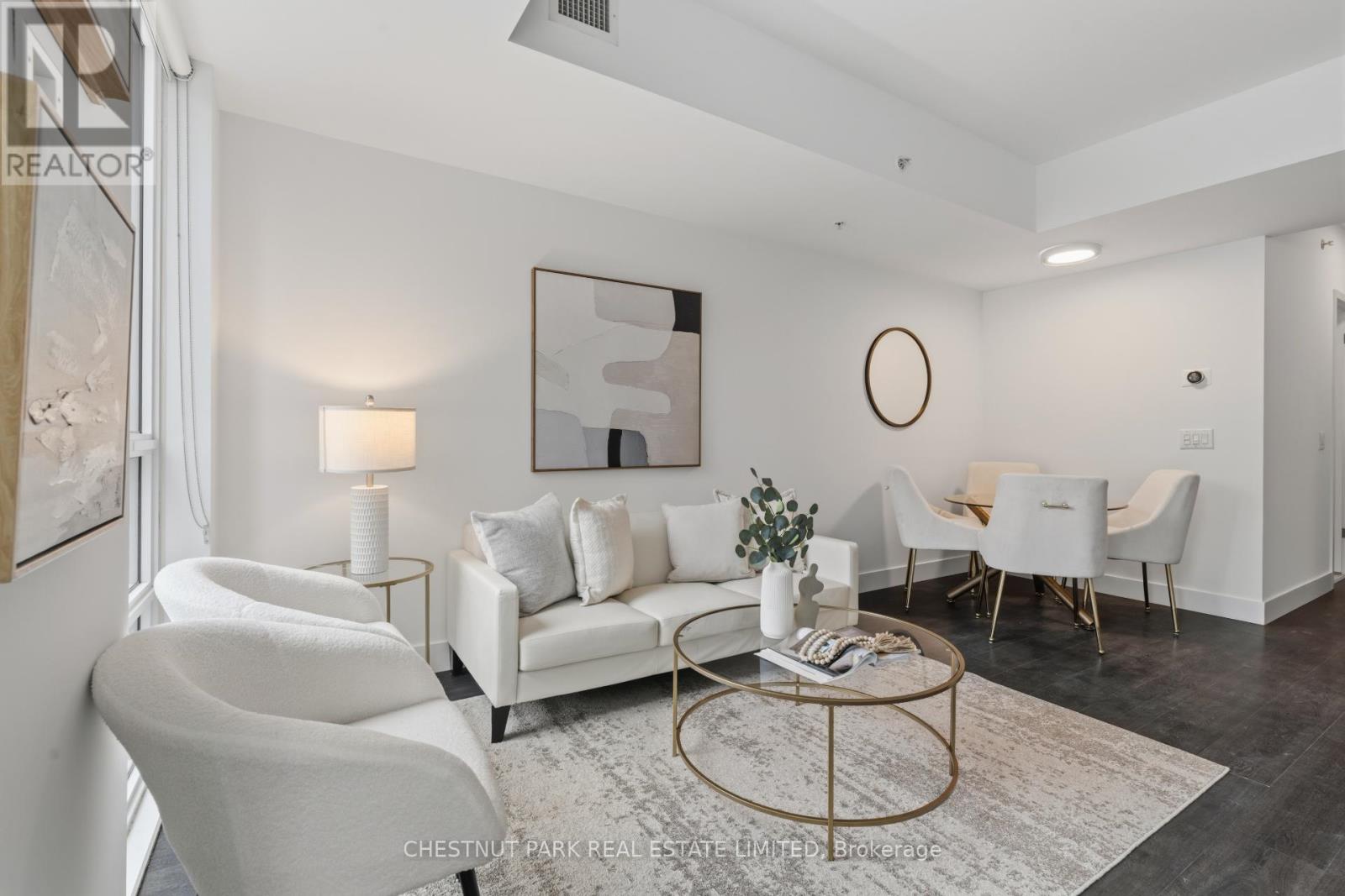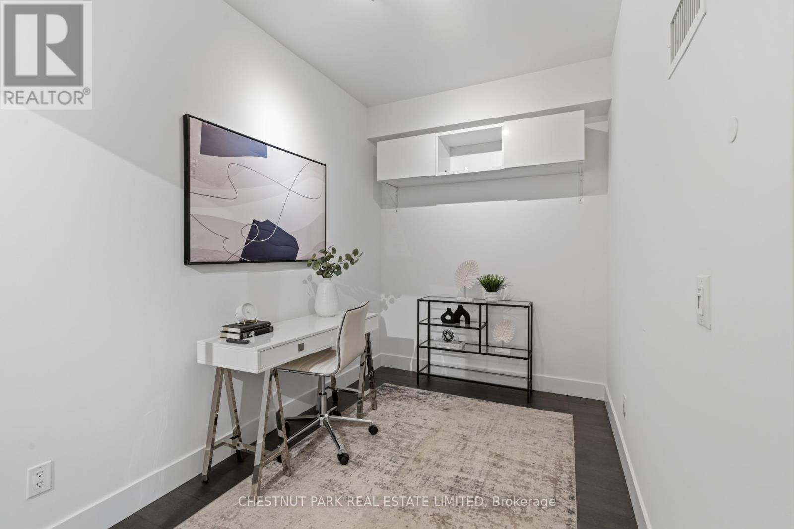 Welcome to this spacious and intelligently designed two-bedroom plus den suite in the heart of King East-Toronto's renowned furniture and design district. Offering approximately 950 sq. ft. of interior living space, this residence blends modern finishes with a highly functional layout, ideal for end-users and investors alike. Smart, Functional Layout The well-appointed floor plan features a bright open-concept living and dining area, perfect for entertaining or relaxing. The contemporary kitchen flows seamlessly into the main living space and is anchored by a functional island-ideal for casual dining and everyday use. Two generously sized bedrooms are thoughtfully positioned for privacy. The primary bedroom offers a comfortable retreat, while the second bedroom features sleek frosted sliding glass doors, allowing flexibility without compromising light. A separate den provides valuable additional space-perfect for a home office, nursery, or reading nook-making this layout especially versatile for modern urban living. (id:64974)