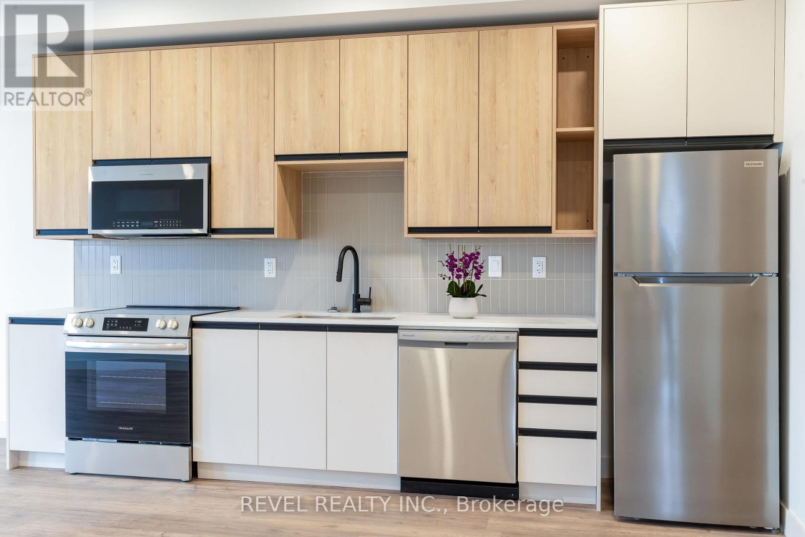 Experience modern living at The Madera with assigned secured/heated parking, smart home technology, and instant high-speed internet (included in rate from Cogeco) throughout the building. This pet-friendly community offers a safe and welcoming environment for those tenants seeking an upgraded lifestyle. This development offers modern interiors featuring luxury vinyl tile (LVT) in the foyer, kitchen, and living areas, with ceramic tile bathroom floors and tub/shower surrounds. Floor-to-ceiling windows, private balconies, and in-suite laundry are included in every unit, with two-bedroom layouts offering a tub in the main bath and a stand-up shower in the ensuite. Kitchens are equipped with large islands and quartz countertops, custom soft-close cabinetry, polished quartz counters with under mount stainless steel sinks and pull-down faucets, tiled backsplashes, under cabinet LED lighting, and a full stainless steel appliance package including dishwasher and microwave. Mechanical and plumbing features include air-source VRF heating and cooling, ERVs in each unit, modern plumbing fixtures, domestic hot water provided by an air-source heat pump, and a high-efficiency electric water heater. The building is finished with pot lights throughout, stylish flush-mount fixtures in living/dining areas and bedrooms, a TV-ready living room wall, and energy-efficient LED lighting across all common and private spaces. (id:65010)