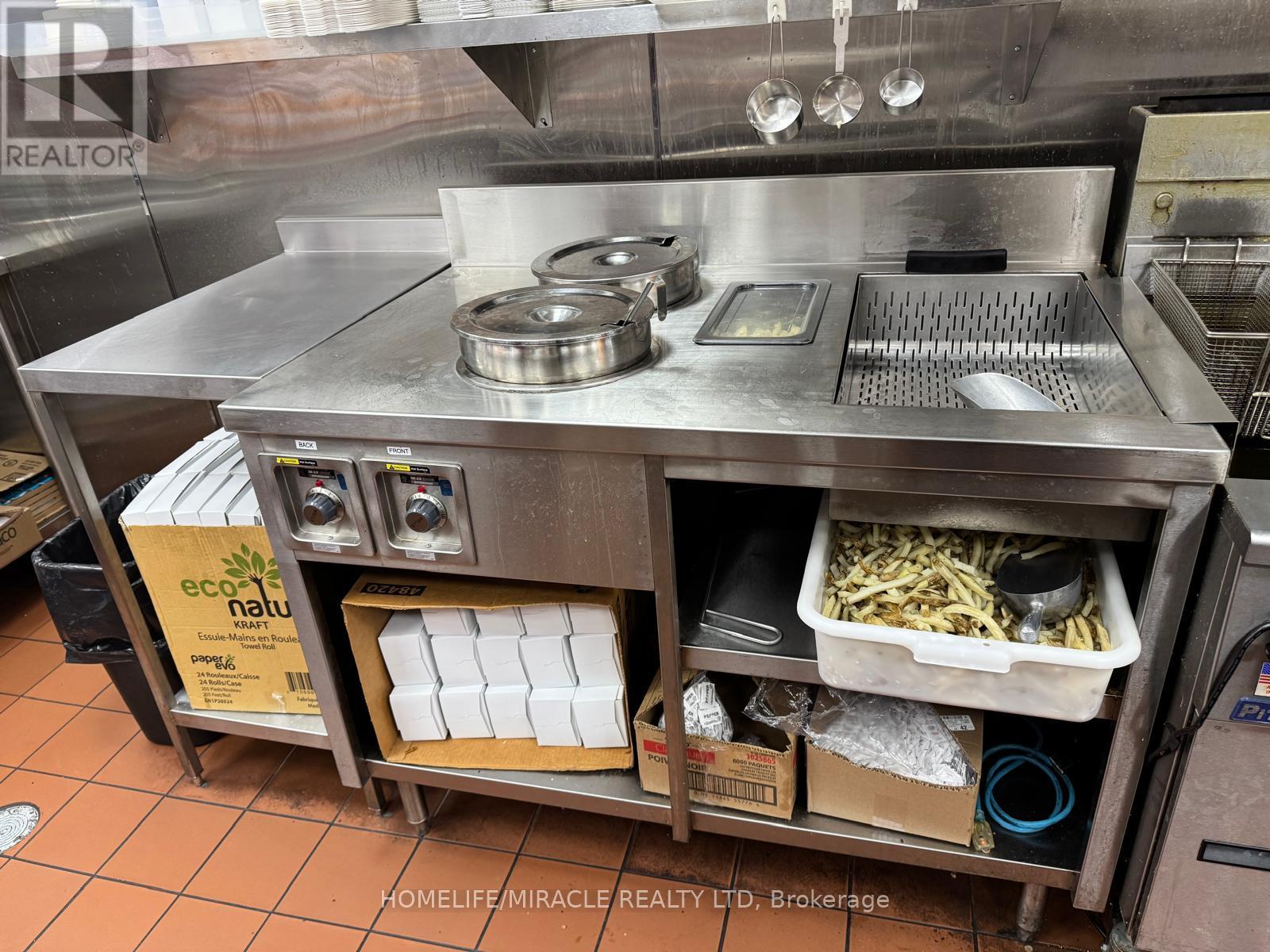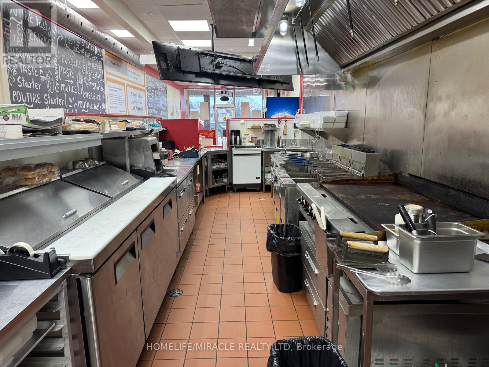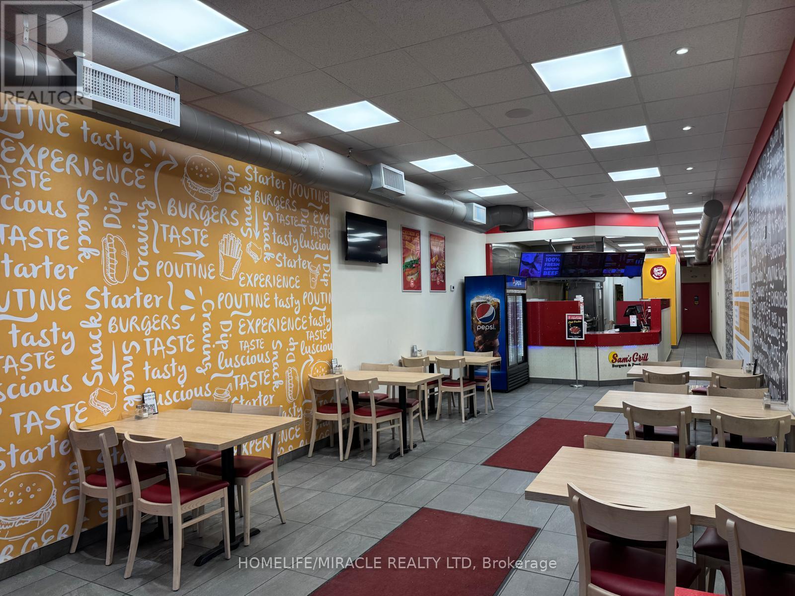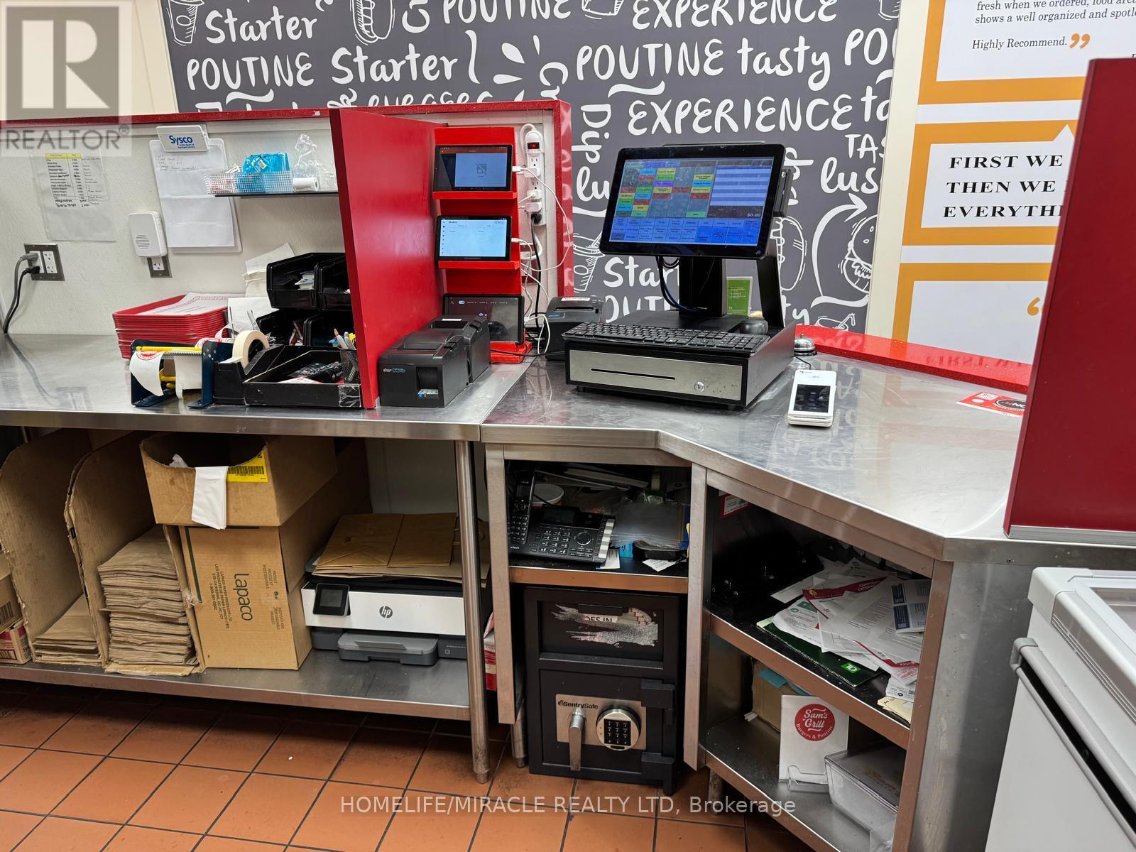 This prime location is a Goldmine for any entrepreneur dreaming of opening their own restaurant or for those wishing to continue the success of an already thriving Turnkey Sam's Grill franchise. Nestled in the bustling heart of Burlington, this spot attracts phenomenal foot traffic, strategically positioned alongside Tim Hortons and Shoppers Drug Mart within a vibrant plaza. Sam's Grill is celebrated for using the freshest ingredients to create mouthwatering, homestyle Burgers, specializing in Quebec-style Poutine, and offering fresh, hand-cut fries without any artificial flavors. The establishment is fully equipped and ready for success, featuring a modern design and state-of-the-art facilities. The completely updated kitchen includes top-of-the-line equipment such as a walk-in cooler, two sandwich stations, and a professional-grade grill. With low industry-standard rent and exceptional visibility in a plaza surrounded by complementary businesses, this location guarantees a steady stream of foot traffic. Whether you choose to continue operating under the well-established and popular Sam's Grill franchise, known for its loyal customer base and high-quality food, or transform the space into your unique concept, this is a perfect opportunity to make your culinary dreams come true in a location already primed for success. (id:64974)