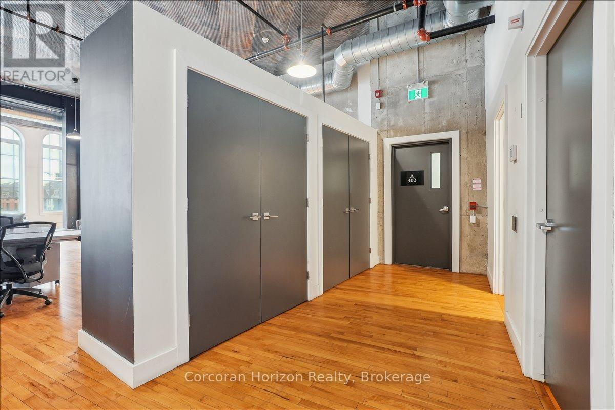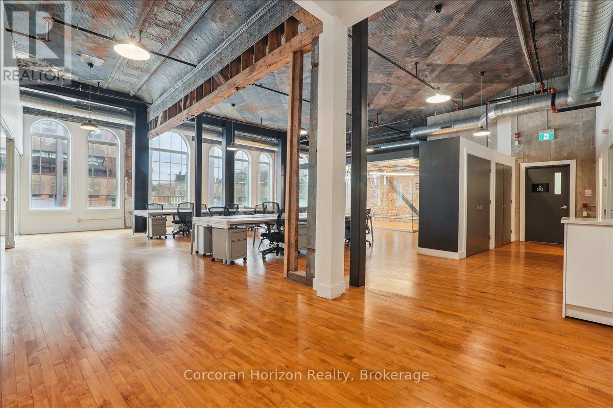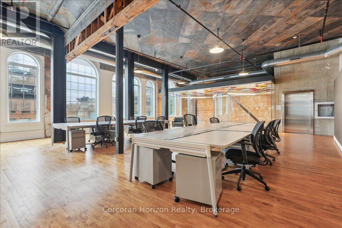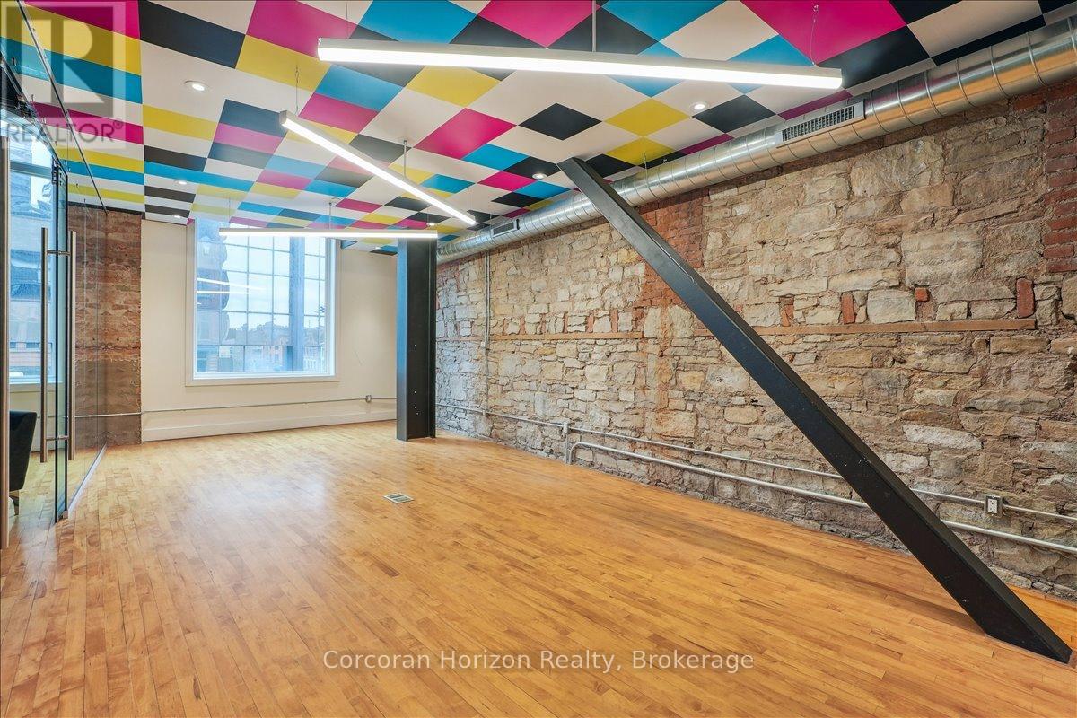 Pristine office space available at the prestigious King James Building! This one-of-a-kind suite offers 2,800 square feet with soaring 16' hammered-tin ceilings, floor-to-ceiling arched windows, glass-enclosed boardroom, kitchen, in-suite washrooms (including one fully-AODA compliant), storage closets, exposed ductwork, post-and-beam construction, multiple glass-enclosed, private offices, and access to the fifth floor common area terrace! Serviced by a fob-secured elevator that opens directly into the suite, this newly-available office suite is one of the most sought-after units in city. The building itself has been completely redeveloped by Core Urban; known for their brilliant combination of preserved heritage features and character with modern features and building systems. Located in the heart of downtown Hamilton, this suite is literal steps away from the major banks, City Hall, the court houses, McMaster University's downtown campus, the James North Arts district, Jackson Square, the King William restaurant district, and so much more! Immediately available. Note: furniture shown in photography belongs to prior tenant and not available for use. (id:64974)