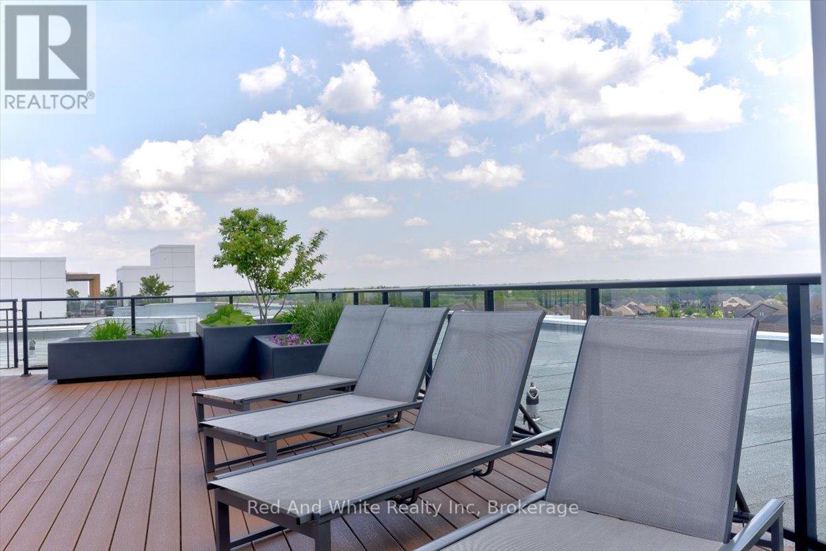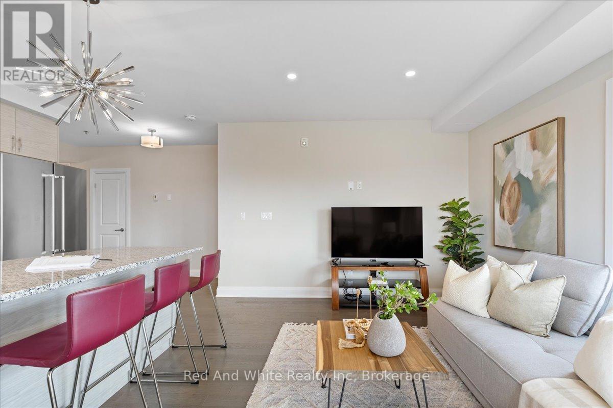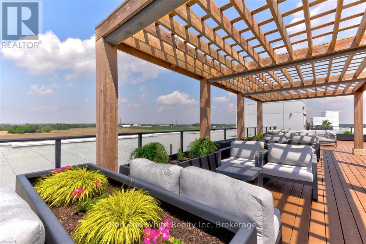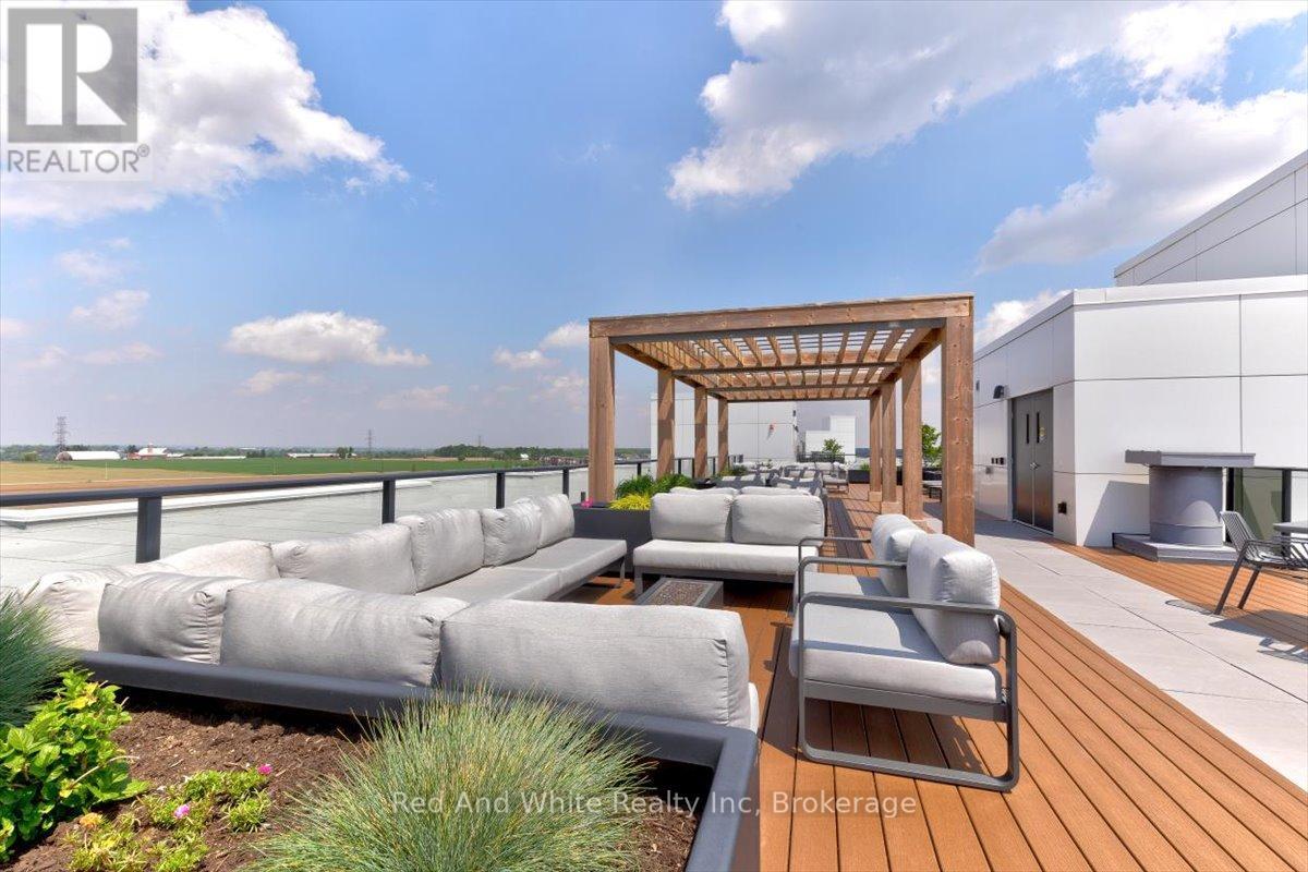 Beautiful 2-bedroom, 2-bath executive condo located in the highly sought-after Carriage Crossing neighbourhood. This bright corner unit, just 4 years old, enjoys west-facing exposure with no direct neighbouring views, allowing for plenty of natural light throughout the day. The modern open-concept kitchen features quartz countertops, a stylish herringbone backsplash, under-cabinet lighting, a large island, stainless steel appliances, and plenty of storage-perfect for everyday cooking or entertaining guests. The sun-filled living area offers engineered hardwood flooring, upgraded lighting, and direct access to an expansive wraparound balcony. With two separate seating areas and wide open panoramic views, it's an ideal spot to unwind with a drink after a long day. The spacious primary bedroom includes two closets and a private ensuite featuring a spa-inspired glass shower with built-in bench. The second bedroom is generously sized and filled with natural light, making it perfect for guests, a home office, or additional living space. Both bathrooms are finished with granite countertops and upgraded fixtures. This unit also includes a convenient drive-in underground parking space with a large private storage locker located directly in front, making access simple and practical. Additional features include in-suite laundry, water heater, and water softener. Residents enjoy access to an incredible rooftop terrace complete with planter gardens, comfortable seating areas, a fire table, communal BBQ, and stunning views-a wonderful place to gather with friends or relax outdoors. Fantastic location close to Rim Park, Grey Silo Golf Club, BlackBerry, scenic walking and biking trails, Brown's Social House, Conestoga Mall, and the St. Jacobs Farmers' Market. Experience the ease and comfort of condo living in one of Waterloo's most desirable communities. (id:64974)