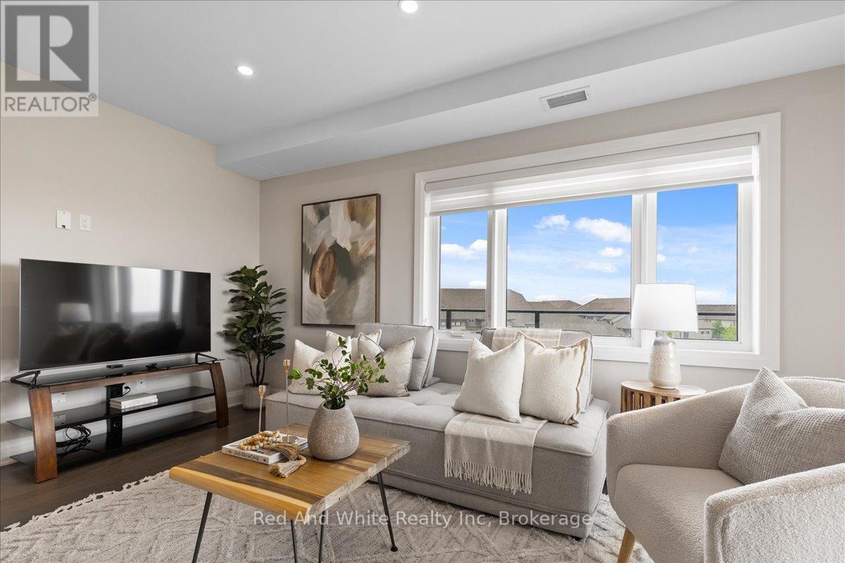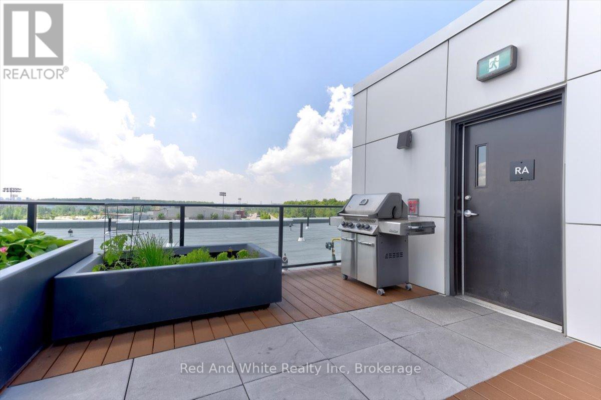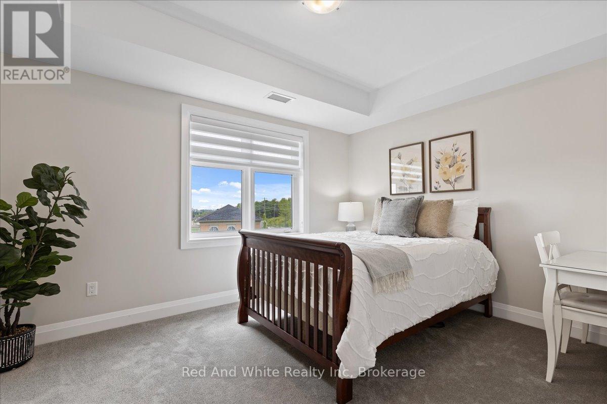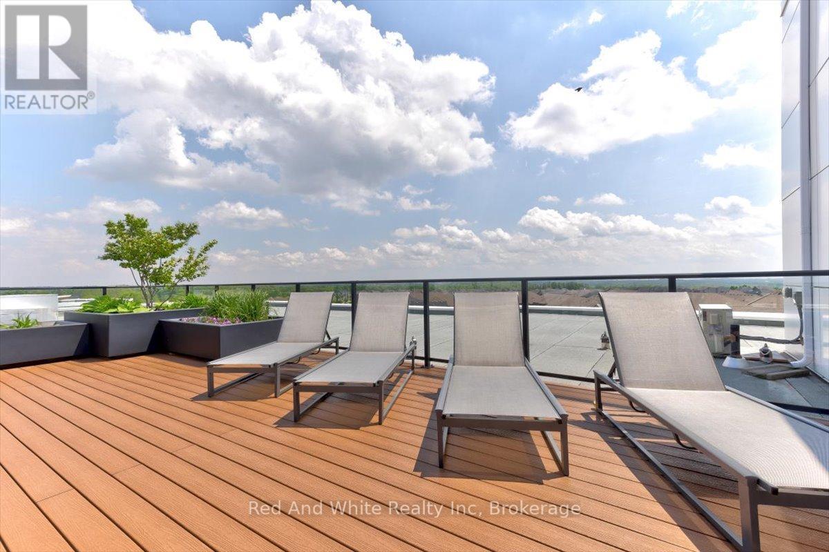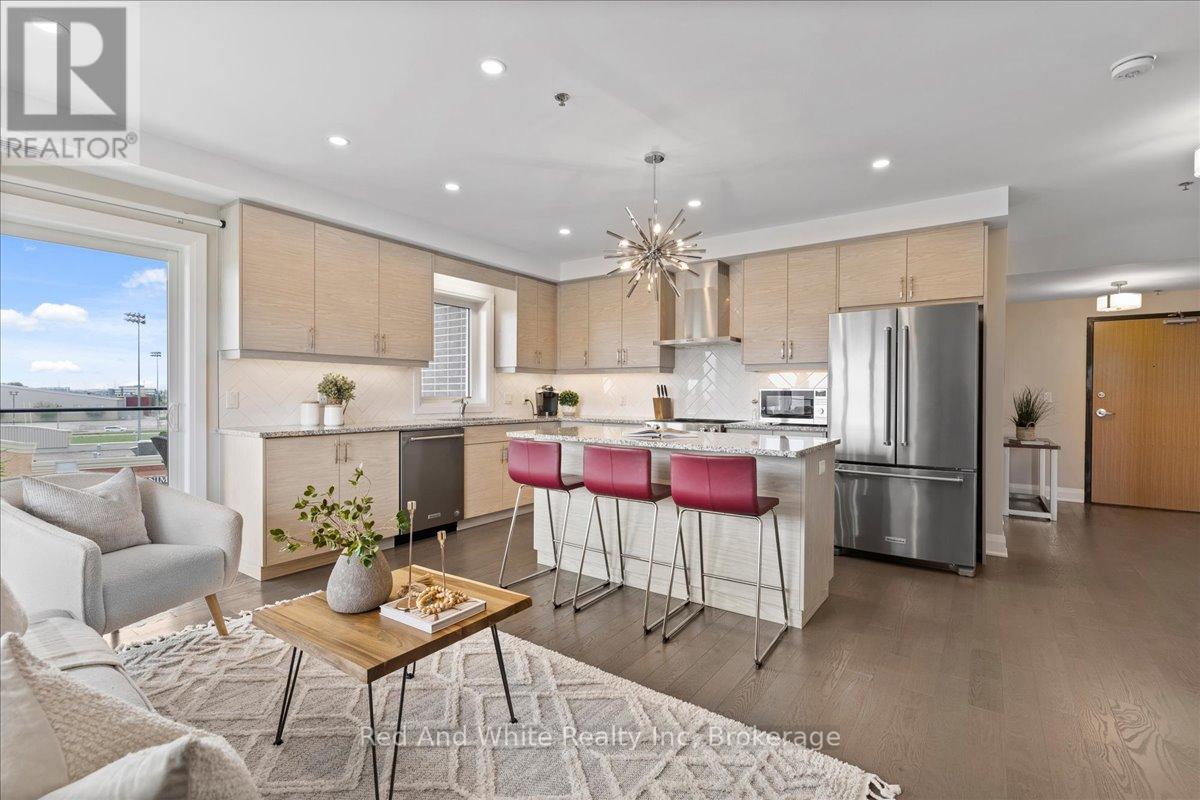 Beautiful 2-bedroom, 2-bath executive condo located in the highly sought-after Carriage Crossing neighbourhood. This bright corner unit, just 4 years old, enjoys west-facing exposure with no direct neighbouring views, allowing for plenty of natural light throughout the day. The modern open-concept kitchen features quartz countertops, a stylish herringbone backsplash, under-cabinet lighting, a large island, stainless steel appliances, and plenty of storage-perfect for everyday cooking or entertaining guests. The sun-filled living area offers engineered hardwood flooring, upgraded lighting, and direct access to an expansive wraparound balcony. With two separate seating areas and wide open panoramic views, it's an ideal spot to unwind with a drink after a long day. The spacious primary bedroom includes two closets and a private ensuite featuring a spa-inspired glass shower with built-in bench. The second bedroom is generously sized and filled with natural light, making it perfect for guests, a home office, or additional living space. Both bathrooms are finished with granite countertops and upgraded fixtures. This unit also includes a convenient drive-in underground parking space with a large private storage locker located directly in front, making access simple and practical. Additional features include in-suite laundry, water heater, and water softener. Residents enjoy access to an incredible rooftop terrace complete with planter gardens, comfortable seating areas, a fire table, communal BBQ, and stunning views-a wonderful place to gather with friends or relax outdoors. Fantastic location close to Rim Park, Grey Silo Golf Club, BlackBerry, scenic walking and biking trails, Brown's Social House, Conestoga Mall, and the St. Jacobs Farmers' Market. Experience the ease and comfort of condo living in one of Waterloo's most desirable communities. (id:64974)