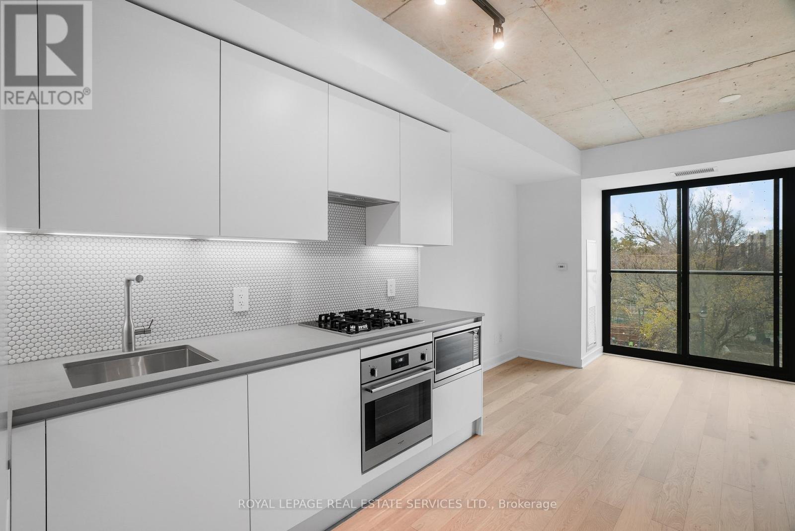 Urban living in the heart of the Junction! Step inside Superkul's newest award winning project at the Junction House. This thoughtfully designed and spacious 675 sqft one bedroom unit features exposed 9ft ceilings, floor to ceiling windows, contemporary materials and finishes for both entertaining & ease of living. Open concept living + dining area is flooded with natural light and desirable south tree top views. Well appointed scavolini kitchen includes integrated appliances, porcelain tile backsplash & gas cooktop. Spa-like bathroom boasts a scavolini vanity, porcelain tiles & large soaker tub. Premium white oak hardwood flooring throughout. Steps from the best restaurants, cafes, charming local shops, breweries, farmer's markets, transit & UP Express providing every convenience. The building includes a dynamic co-working/ social space, reliable concierge, well-equipped gym, yoga studio, visitor parking, 4000 sqft landscaped rooftop terrace with BBQs, cozy fire pits and stunning city skyline views. One storage locker included. Don't miss the opportunity to live in one of Toronto's most vibrant and sought after neighbourhoods. (id:64974)