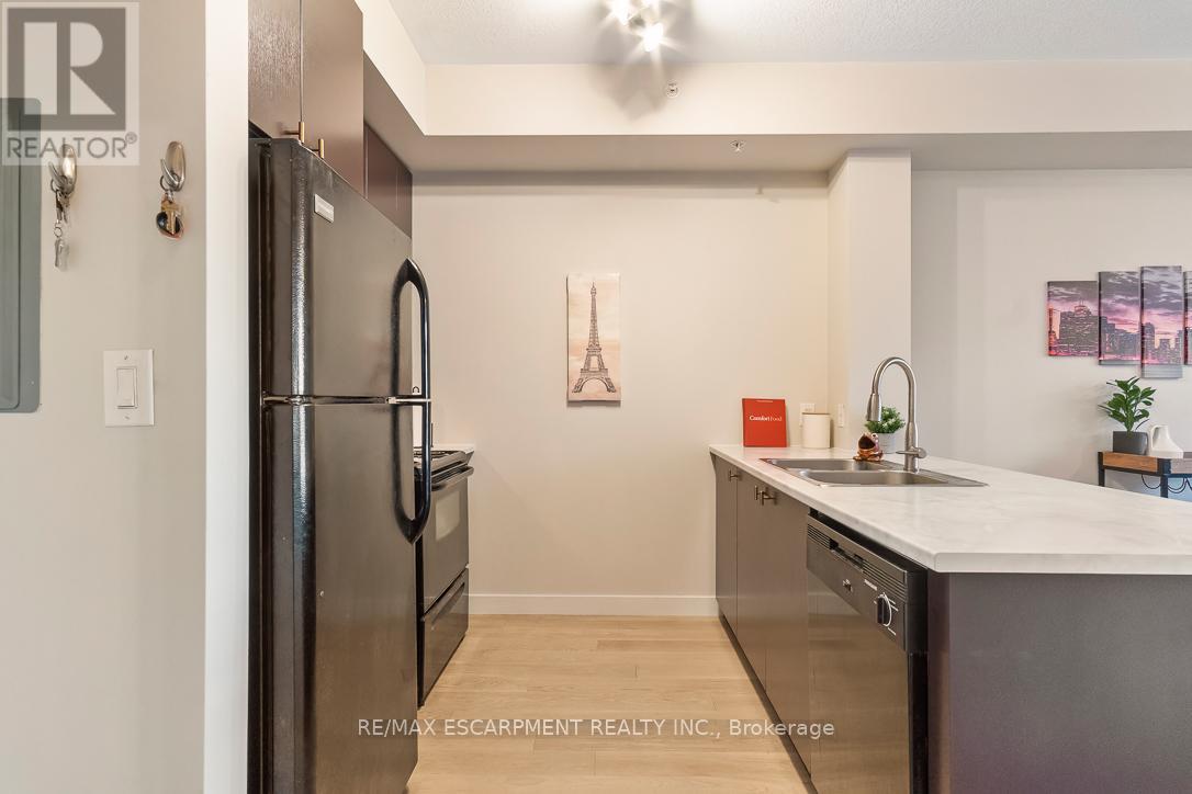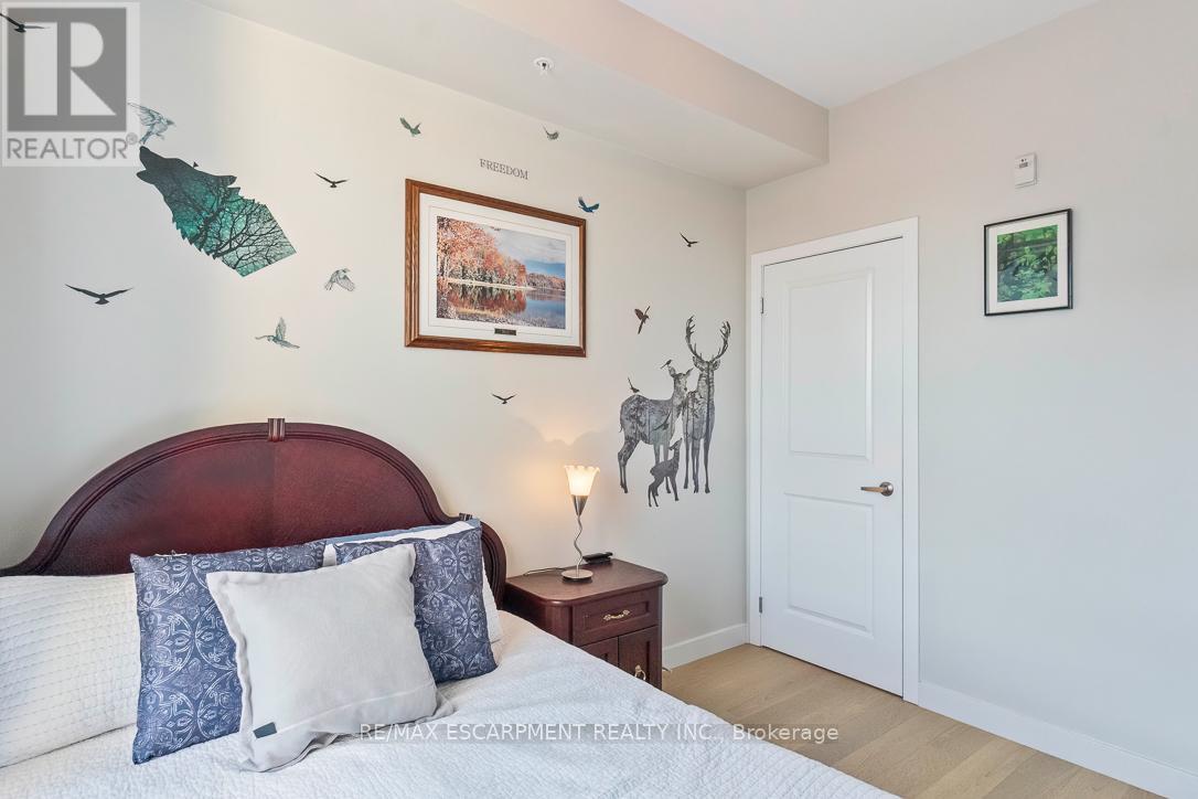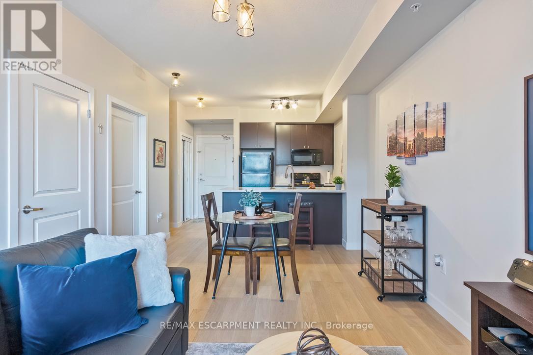 Welcome to this gorgeous unit in North Burlington's vibrant Vibe Condominiums. This impressive space offers high ceilings, The heart of this home is a sleek, modern kitchen featuring plenty of storage, newly painted cupboards and new countertops. The unit boasts fresh paint, new flooring and trim throughout along with updated lighting and hardware. The spacious bedroom offers a generous space while the den is perfect as a guest space, office, reading area or any other configuration you desire! The private balcony is rich with sunlight and offers the perfect place to relax. Vibe Condominiums offers an array of unbeatable amenities, including a rooftop terrace with stunning views, dining area and bbq's, a party room for hosting lively gatherings that require more space, and a gym for all your fitness needs. Movie nights will never be the same with the fabulous movie room you'll have at your disposal. Enjoy Millcroft Shopping Centre nearby - you'll find all you'll need and after the shopping chores are done for the day just scoot over to the many parks, get lost on the many walking trails and everything else this sought after pocket is known for. Highway access is only a few minutes away along with Go Train access - downtown Toronto is never far away. (id:64974)